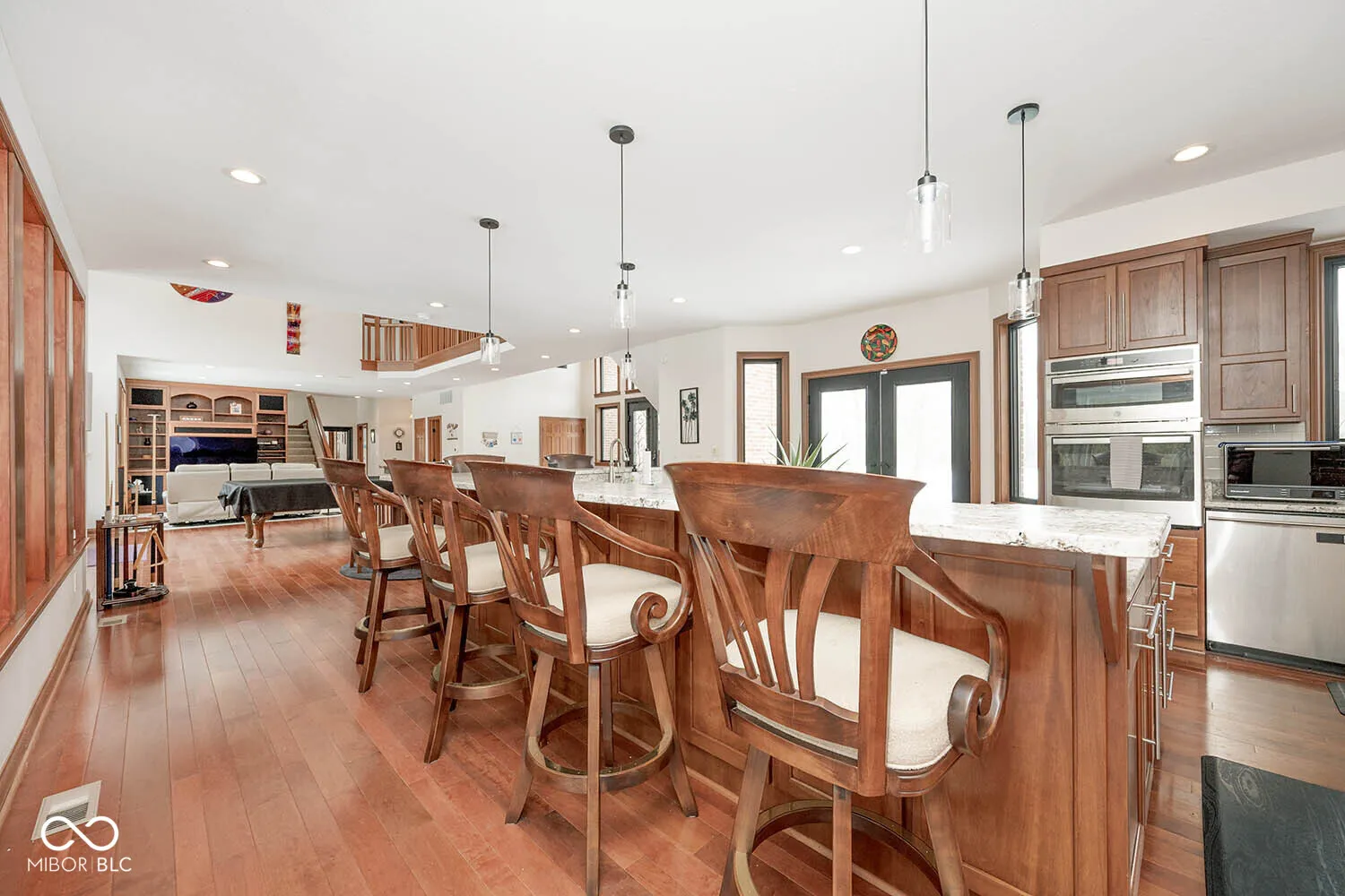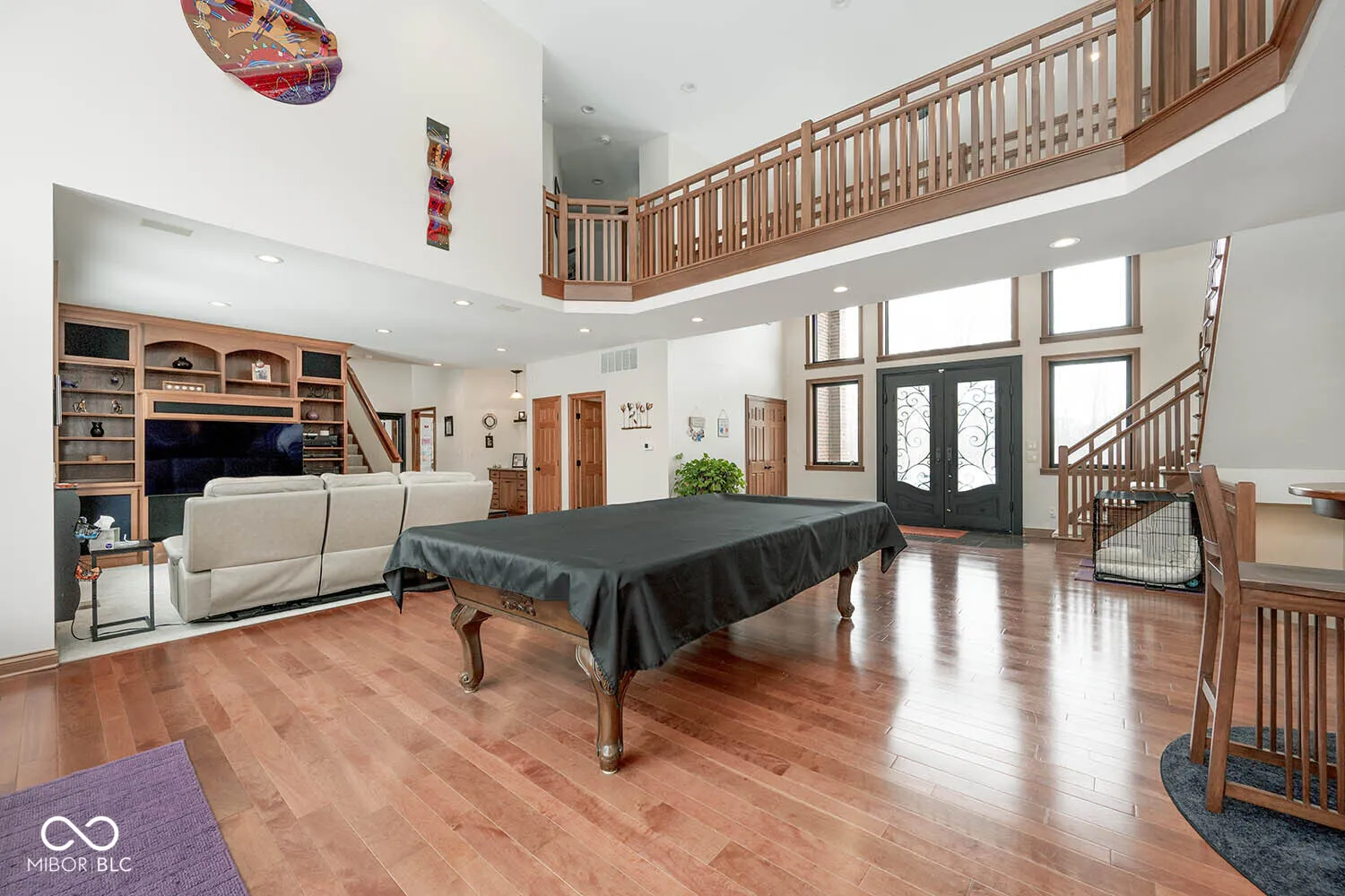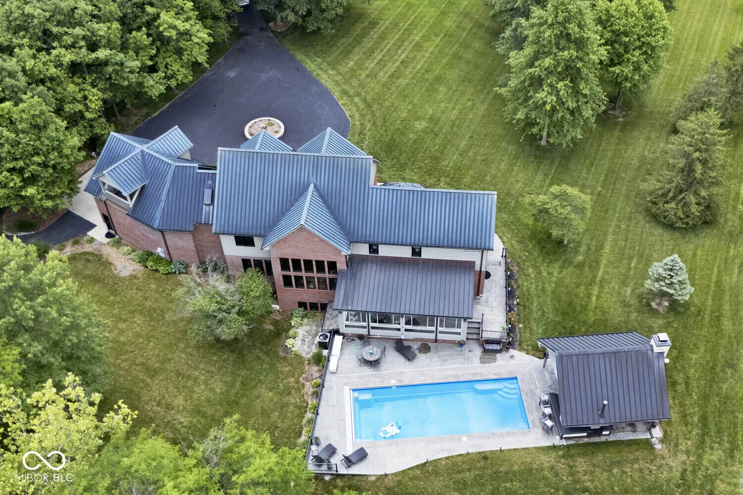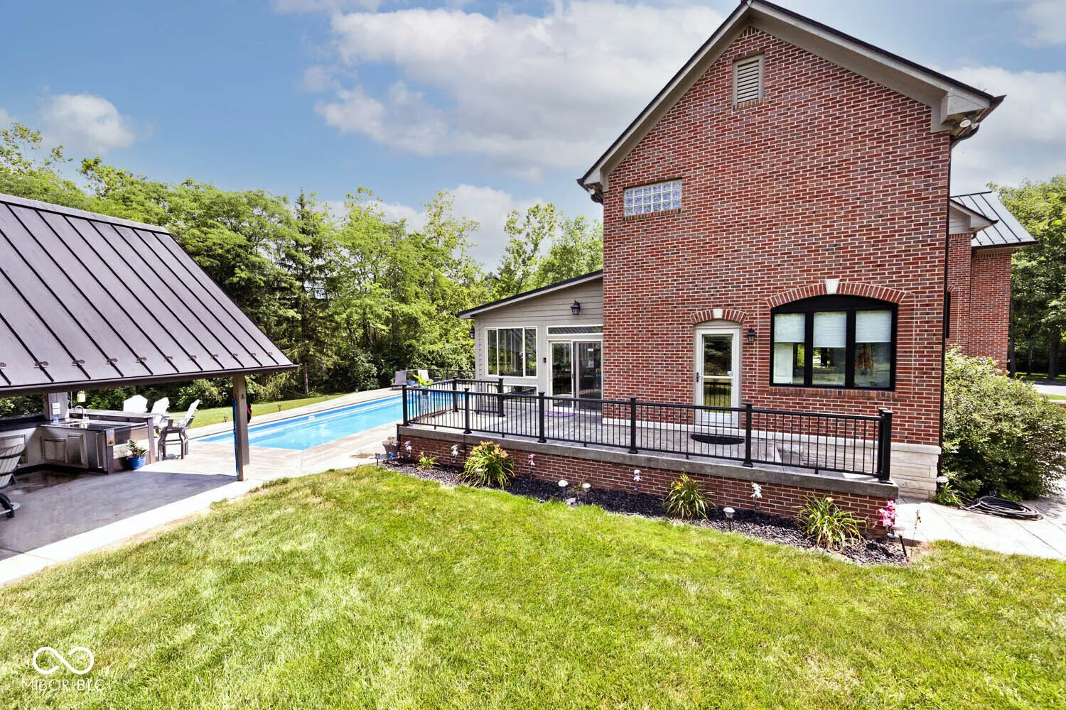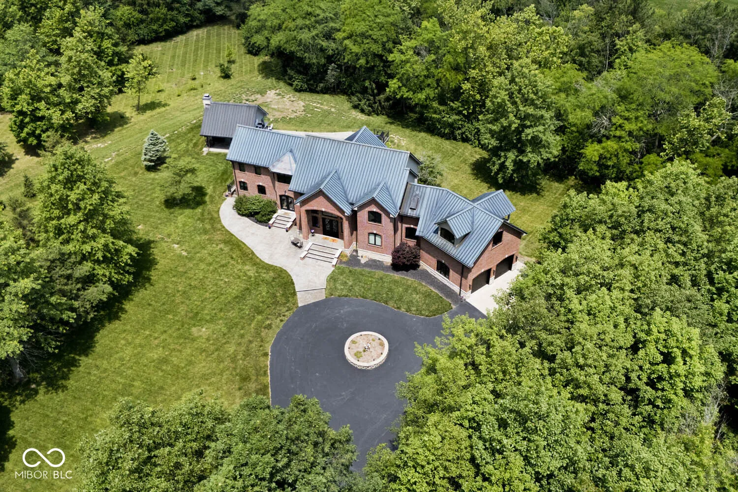 Serenity in the country on nearly 12 acres in New Palestine with no HOA. This beautiful home offers warmth and personality at every turn. This home features a dramatic two-story foyer and great room. The kitchen features quartz countertops, a large pantry and it opens up to inviting living areas designed for everyday living and hosting. Multiple gathering spaces throughout the home create the perfect setting for relaxing, socializing and play. Discover a luxurious primary suite offering a spa-style bath with a spacious walk-in shower creating an atmosphere of sophisticated comfort and personal sanctuary on the upper level. While upstairs you will find two additional bedrooms and versatile bonus room. The basement offers a dedicated exercise room and play room. The outdoor living spaces are absolutely unmatched featuring an in-ground pool with automatic cover. The large pavilion has an outdoor kitchen with a cozy fireplace. The multiple lounge areas capture the beauty of this private homesite. As you walk the property, you will find a man cave with full apartment, horse barn with stable and tack room and a horse pasture. The outbuildings provide indoor parking for your RV. This exceptional residence offers a lifestyle of unparalleled comfort and refined elegance.