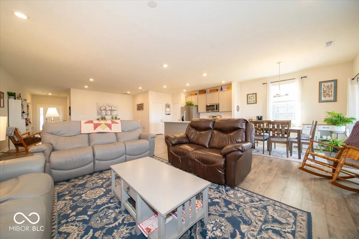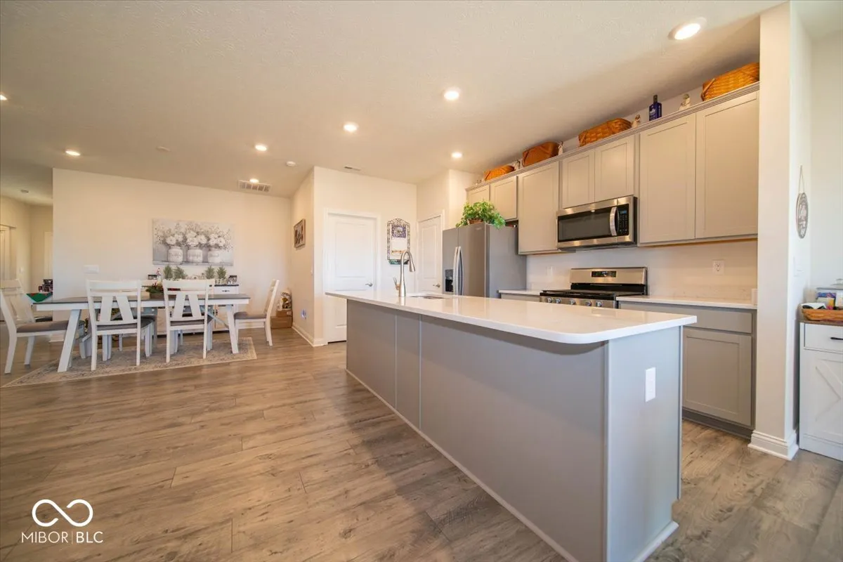 Motivated Seller! Exceptional Value Without the Wait of New Construction! Like-new living in this beautifully designed ranch home, offering high-end finishes and thoughtful upgrades throughout-without the added expense or timeline of building from the ground up. This elegant 3-bedroom, 2-bath residence features a seamless open-concept layout, where the great room, dining area, breakfast nook, and kitchen flow effortlessly together-perfectly suited for both sophisticated entertaining and comfortable everyday living. At the heart of the home, the gourmet kitchen impresses with sleek gray cabinetry, stunning quartz countertops, an expansive center island, stainless steel appliances including a gas range, and a generously sized pantry. Rich luxury vinyl plank flooring extends throughout, combining beauty with durability. The private primary suite serves as a tranquil retreat, filled with natural light and enhanced by a ceiling fan and oversized windows. The spa-inspired en-suite bath offers a garden soaking tub, a walk-in tiled shower, dual vanities, and a spacious walk-in closet. A split-bedroom design ensures privacy, with two additional bedrooms and a well-appointed full bath located on the opposite side of the home. Additional features include an oversized laundry room with built-in storage. Step outside to your own outdoor oasis-a 10×30 covered concrete patio overlooking a fully fenced backyard, ideal for relaxing evenings, entertaining guests, or enjoying time with pets and family. Ideally situated near Center Grove High School, this home combines luxury, location, and value in one exceptional offering. Trash service is also included in the monthly HOA, adding ease to everyday living. Don’t miss this one!