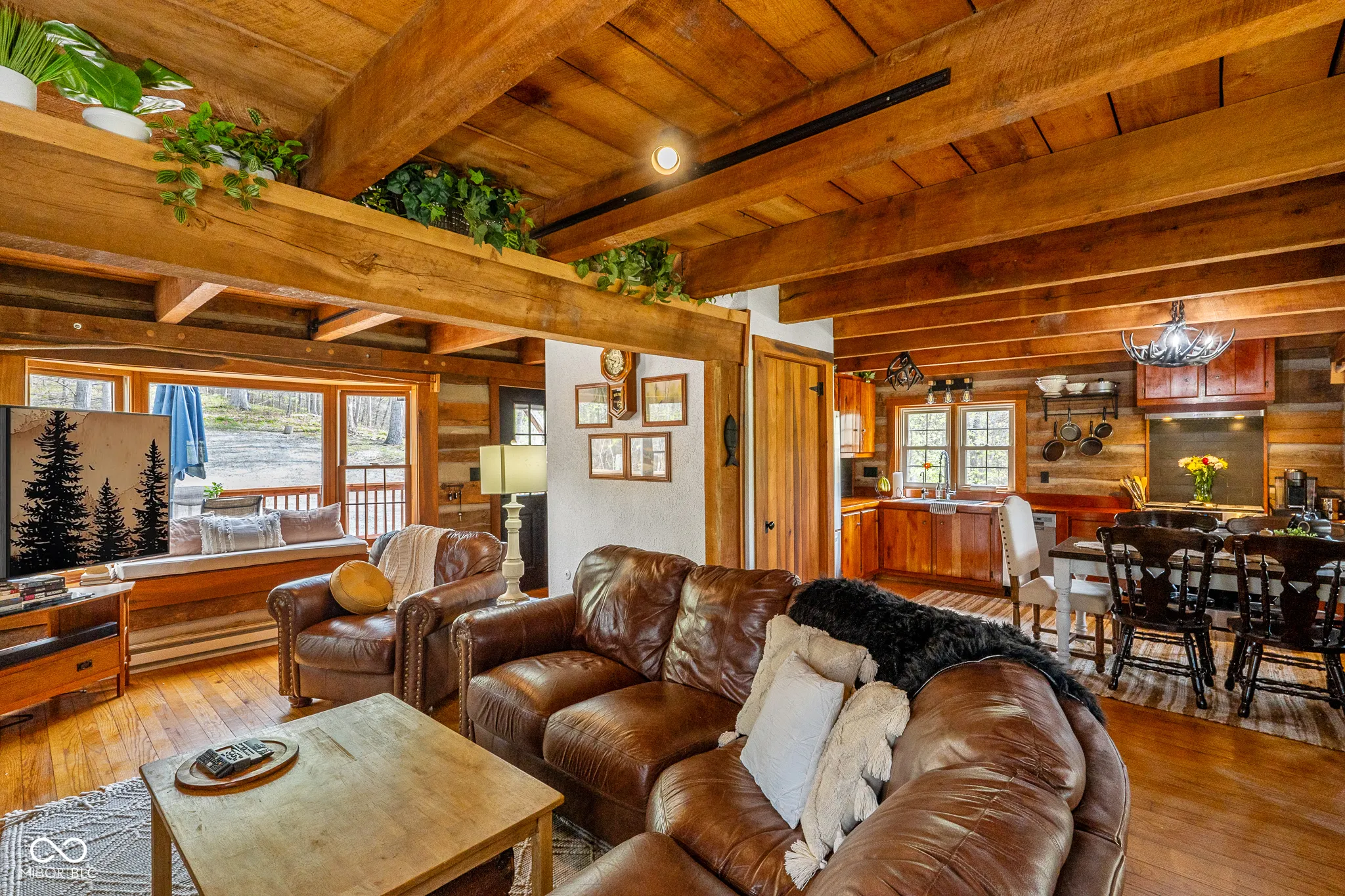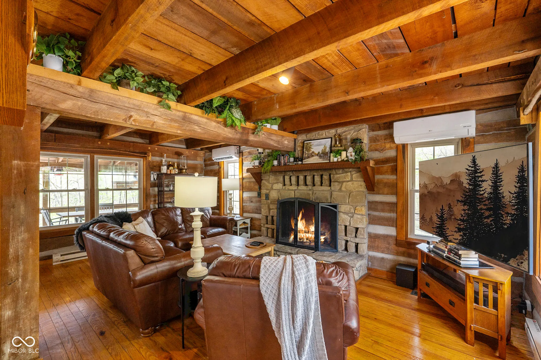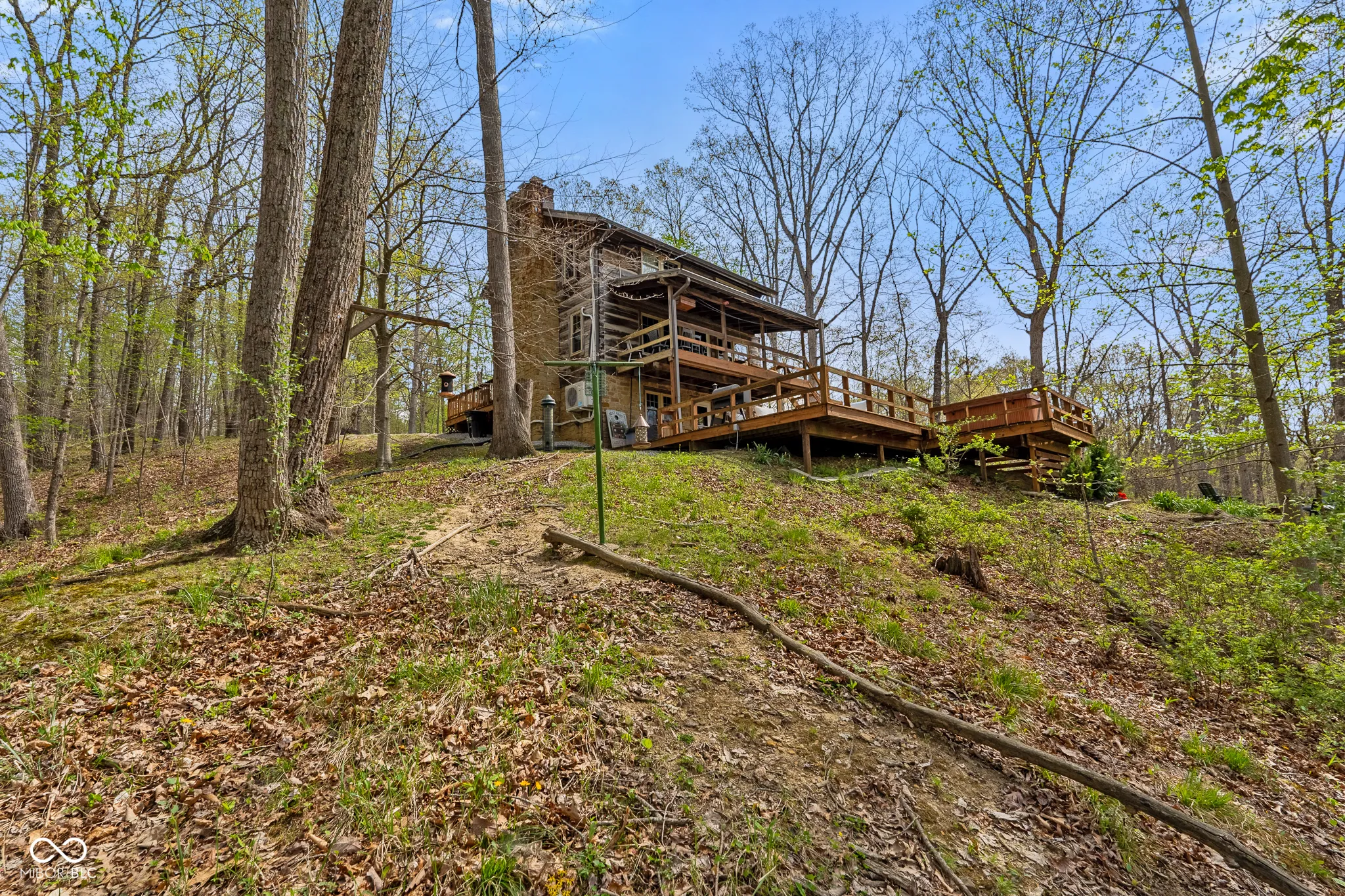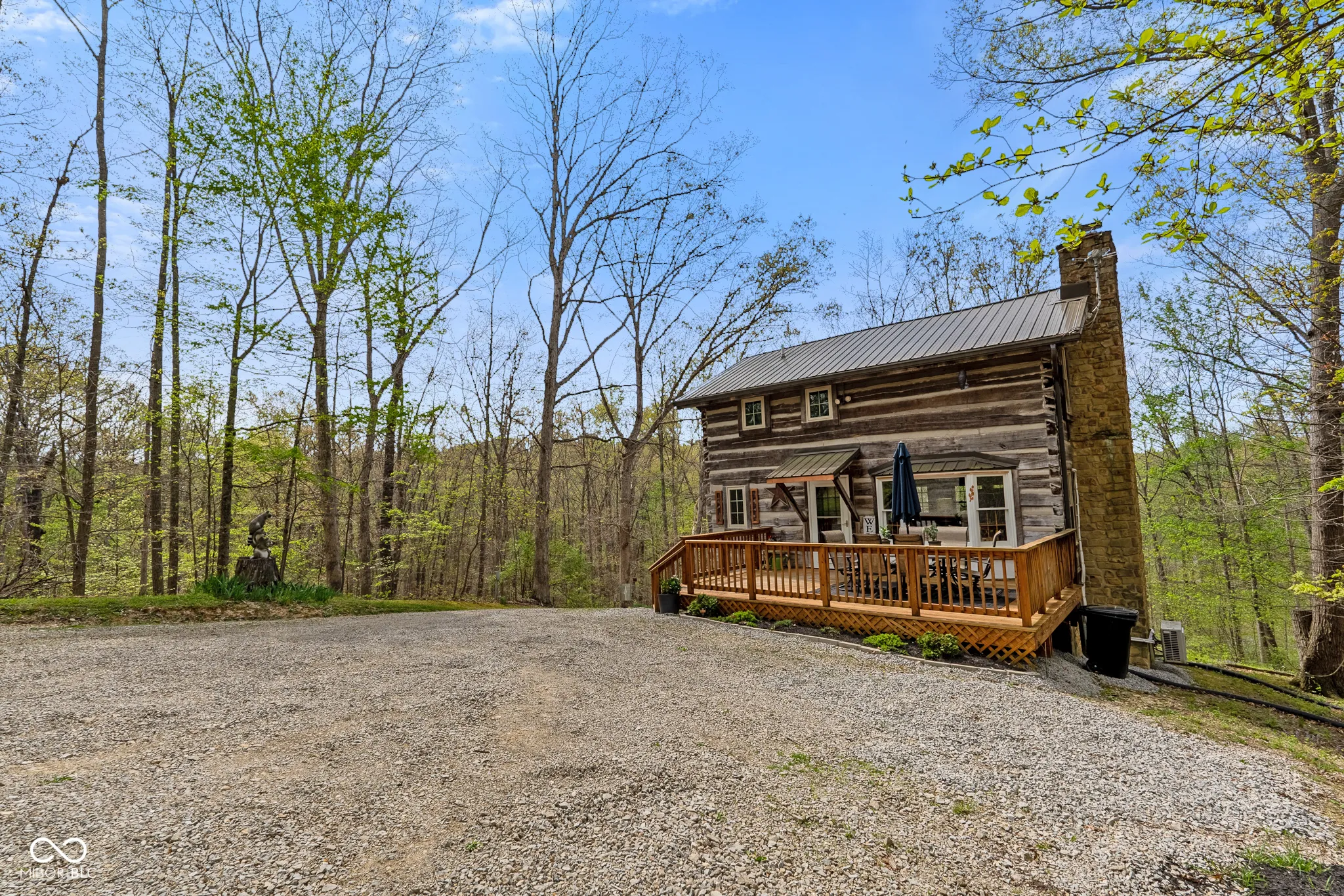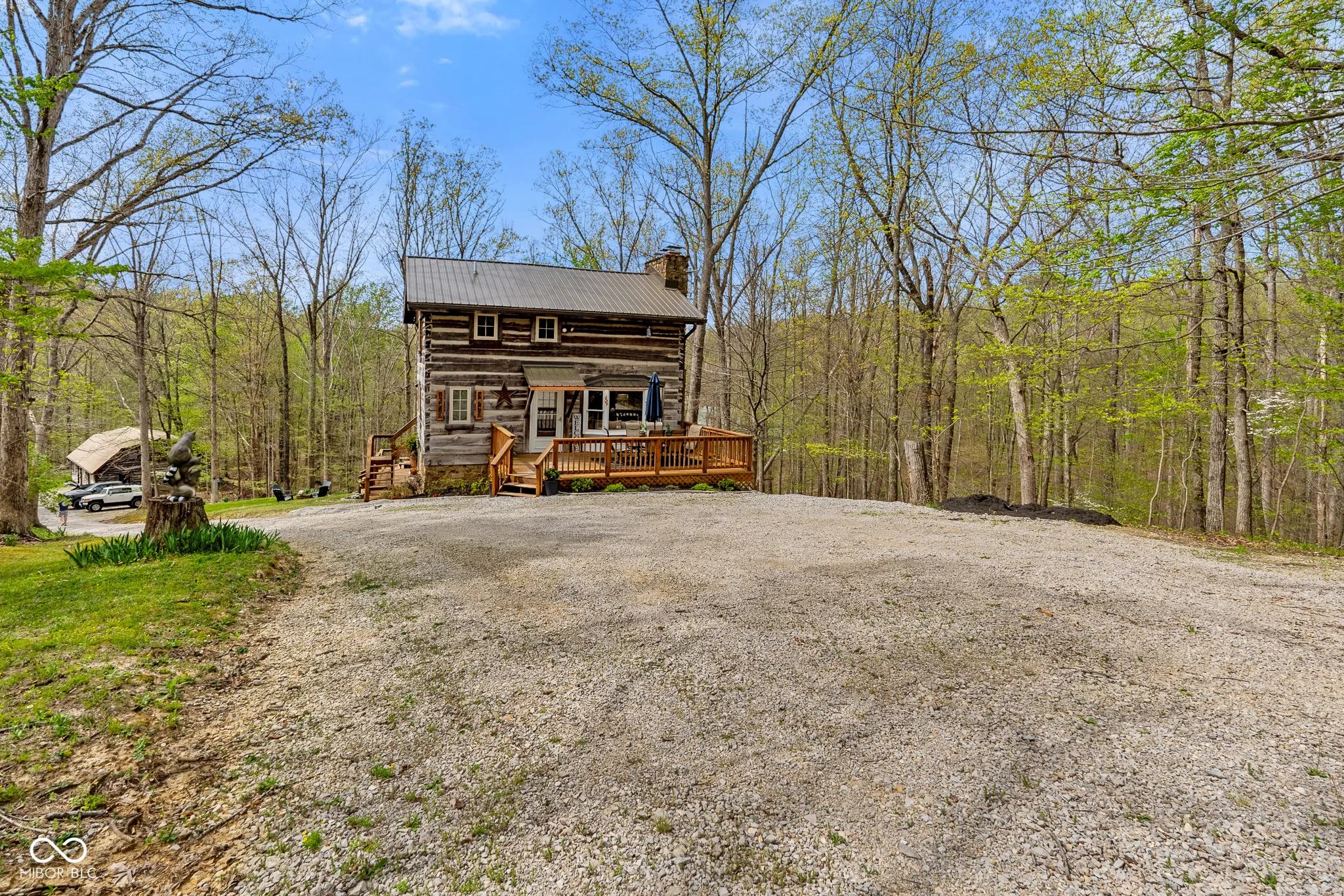 Lost & Found Cabin offers a rare opportunity to own a true Brown County log home with a Tourist Rental Exception already in place. Although it has not been used as a short-term rental since 2019, the exception remains, and the current owners hold a valid permit-allowing you to begin renting immediately. Set on 5 private wooded acres, this custom-built log cabin blends rustic charm with modern updates. Enjoy peaceful views from every window, relax on multiple decks, or unwind in the hot tub surrounded by nature. Inside, you’ll find hardwood floors, exposed beam ceilings, poplar hardwood doors and trim, mortise locks and hardware, custom hardwood countertops, and two gas log fireplaces-one in the living room and one in the primary bedroom. The finished basement expands the home’s functionality and entertainment space, featuring a pool table along with additional sleeping options including a Murphy bed and sleeper sofa-ideal for guests or short-term rental flexibility. The home is being sold fully furnished, including all kitchen dishes, cookware, and essentials, making it truly turnkey. Recent updates include a beautifully renovated kitchen, new stainless steel appliances, new mini-split heating and cooling units throughout the home (including the garage), and updated basement flooring. Outdoor living is just as inviting, with both a gas fire pit and a wood-burning fire pit for year-round enjoyment. The 30′ x 40′ detached garage offers excellent versatility with new windows, an upper-level storage area, and a 30′ x 15′ finished room perfect for a workshop, studio, gym, or hobby space. A low-maintenance metal roof adds peace of mind, and additional inclusions such as a generator, extra freezer in the garage, and Traeger grill further enhance the value. If you’ve been dreaming of a private cabin in the woods with income potential, modern comforts, and authentic Brown County character, Lost & Found Cabin is a must-see.