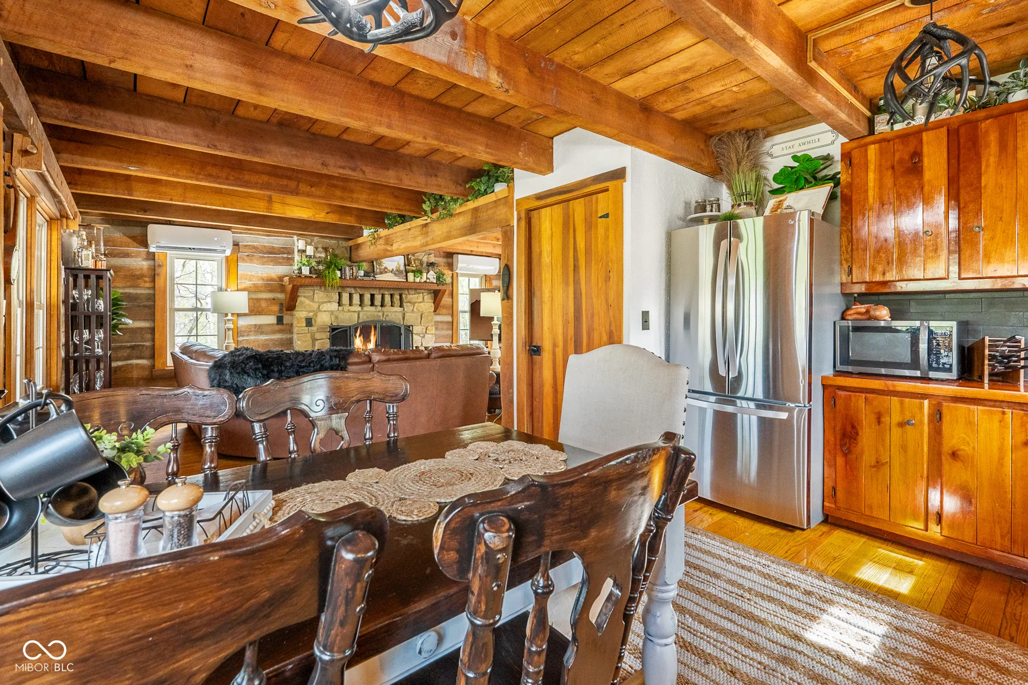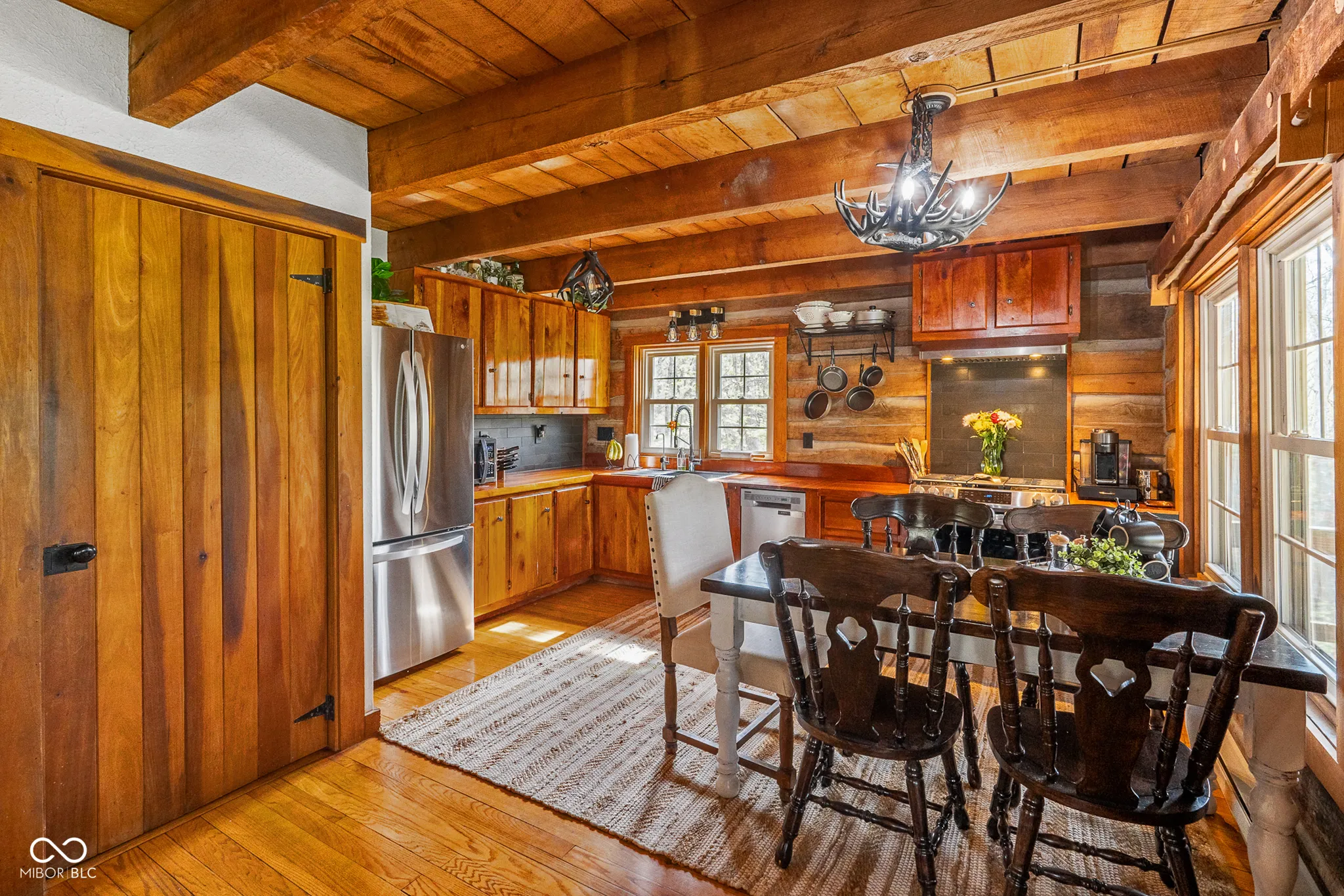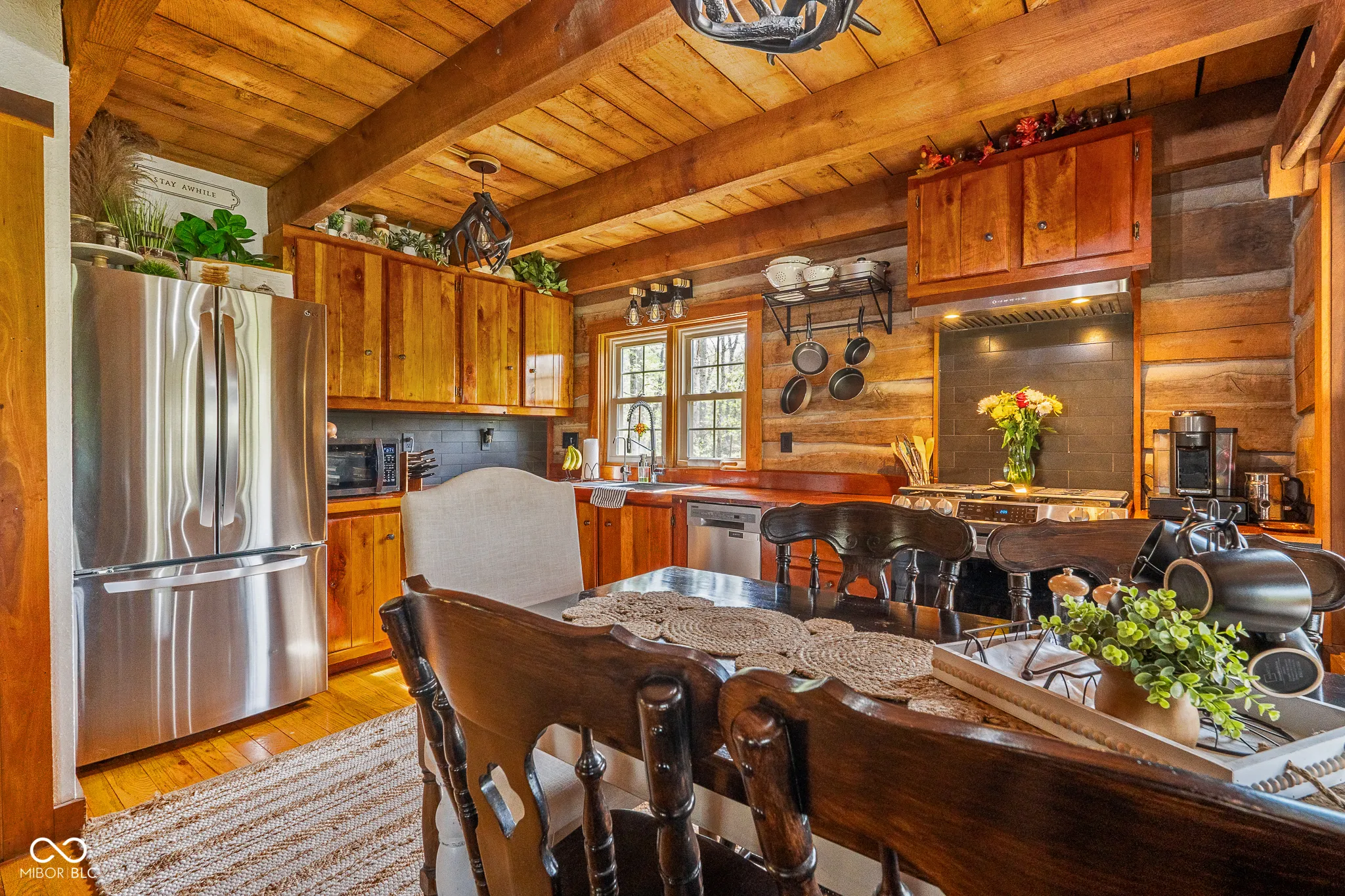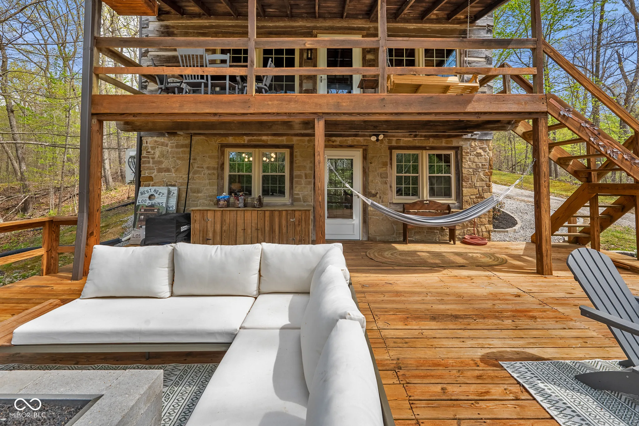Lost & Found Cabin offers a rare opportunity to own a true Brown County log home with a Tourist Rental Exception already in place. Although it has not been used as a short-term rental since 2019, the exception remains, and the current owners hold a valid permit-allowing you to begin renting immediately. Set on 5 private wooded acres, this custom-built log cabin blends rustic charm with modern updates. Enjoy peaceful views from every window, relax on multiple decks, or unwind in the hot tub surrounded by nature. Inside, you’ll find hardwood floors, exposed beam ceilings, poplar hardwood doors and trim, mortise locks and hardware, custom hardwood countertops, and two gas log fireplaces-one in the living room and one in the primary bedroom. The finished basement expands the home’s functionality and entertainment space, featuring a pool table along with additional sleeping options including a Murphy bed and sleeper sofa-ideal for guests or short-term rental flexibility. The home is being sold fully furnished, including all kitchen dishes, cookware, and essentials, making it truly turnkey. Recent updates include a beautifully renovated kitchen, new stainless steel appliances, new mini-split heating and cooling units throughout the home (including the garage), and updated basement flooring. Outdoor living is just as inviting, with both a gas fire pit and a wood-burning fire pit for year-round enjoyment. The 30′ x 40′ detached garage offers excellent versatility with new windows, an upper-level storage area, and a 30′ x 15′ finished room perfect for a workshop, studio, gym, or hobby space. A low-maintenance metal roof adds peace of mind, and additional inclusions such as a generator, extra freezer in the garage, and Traeger grill further enhance the value. If you’ve been dreaming of a private cabin in the woods with income potential, modern comforts, and authentic Brown County character, Lost & Found Cabin is a must-see.