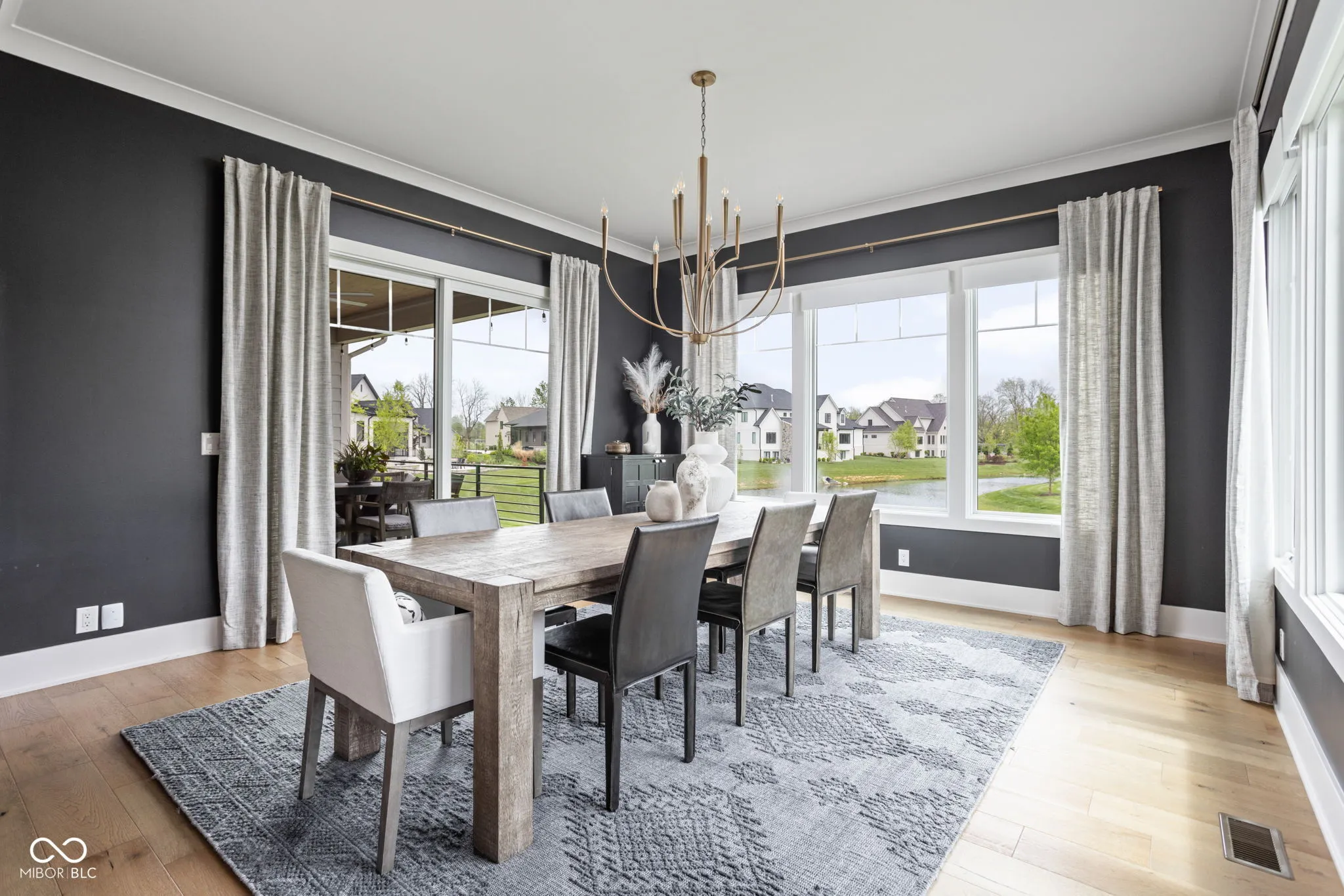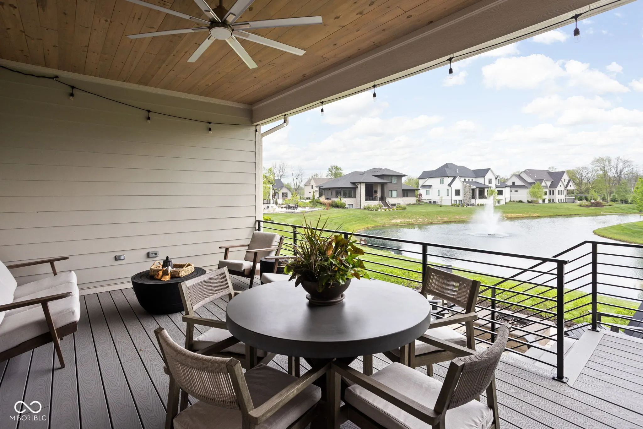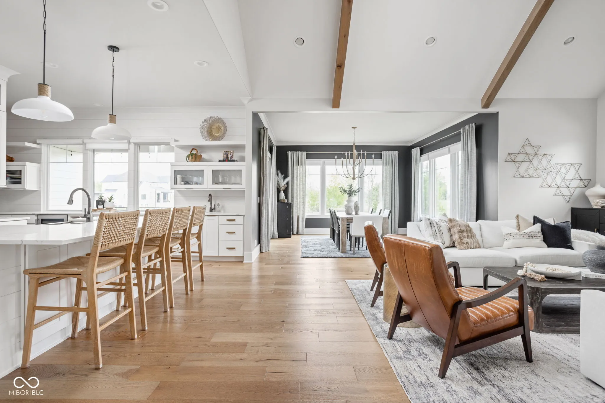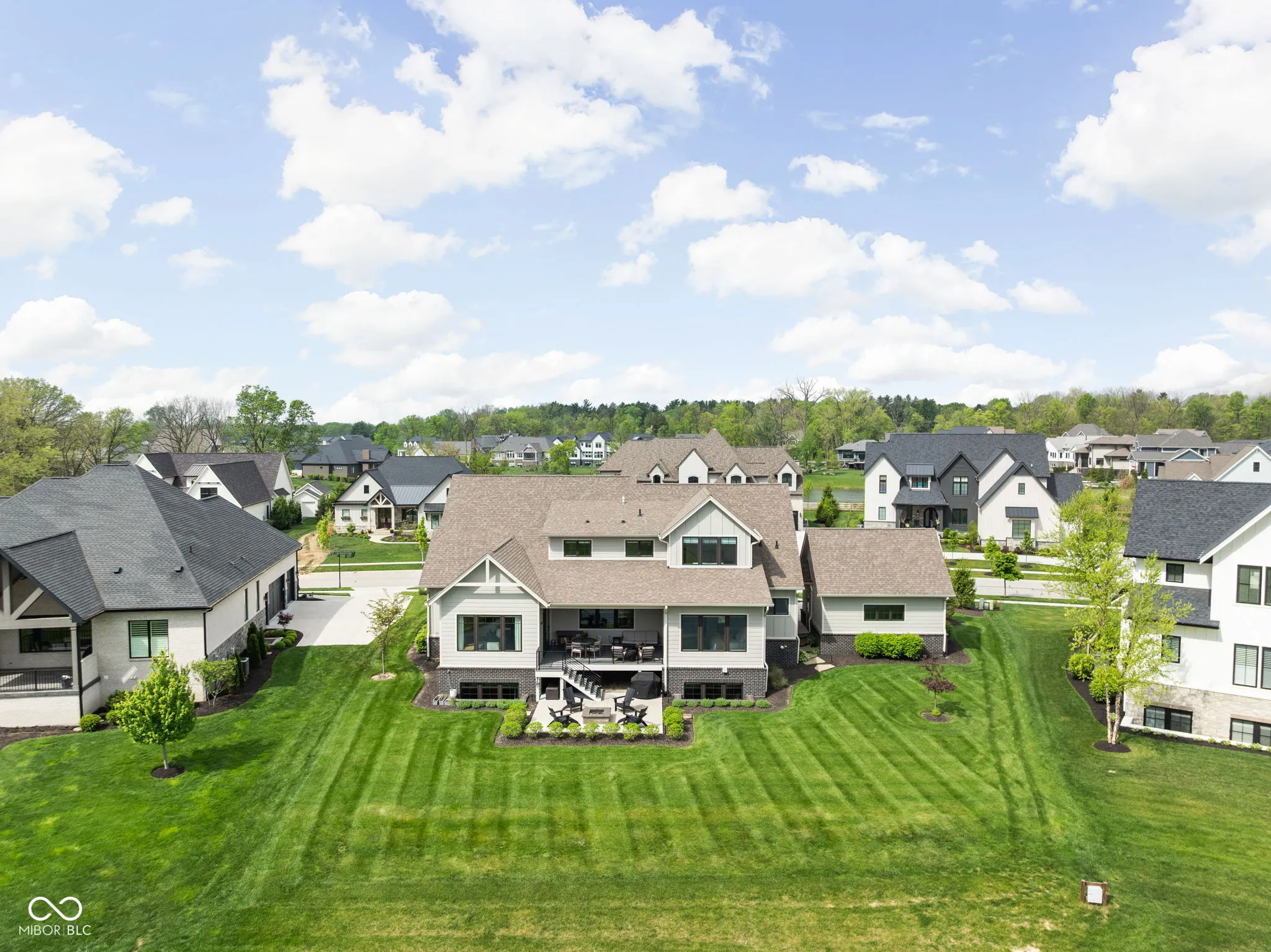 Experience elevated living in this exquisite, almost-new residence where thoughtful design meets luxurious comfort. From the moment you enter, the home welcomes you with soaring 10-foot ceilings and a striking beamed great room that serves as the heart of the home. The open-concept layout seamlessly connects to a chef-inspired kitchen, complete with an expansive island, quartz surfaces, custom cabinetry, commercial-grade range, dual beverage refrigerators, stainless steel appliances, a dedicated planning center, and an impressive walk-in pantry. Designed for both entertaining and everyday living, the sun-drenched dining area flows effortlessly into the great room and extends outdoors to a covered patio and inviting firepit-perfect for relaxing evenings or hosting guests. The main-level owner’s suite offers a serene escape, featuring picturesque views, a spa-like bath with a walk-in shower, freestanding soaking tub, and a dream-worthy custom closet. Additional main-floor highlights include a guest suite with full bath, a flexible den or sixth bedroom, an updated and well-appointed laundry room, and a functional mudroom with built-in storage. Upstairs, privacy and comfort continue with two spacious bedrooms, each offering en-suite baths and walk-in closets. The finished basement expands your living space with a stylish bar, fitness room, media and game area, a fifth bedroom, full bath, and integrated audio/visual features. With two separate 2-car garages and meticulous attention to detail throughout, this home delivers the perfect blend of luxury, functionality, and modern elegance.