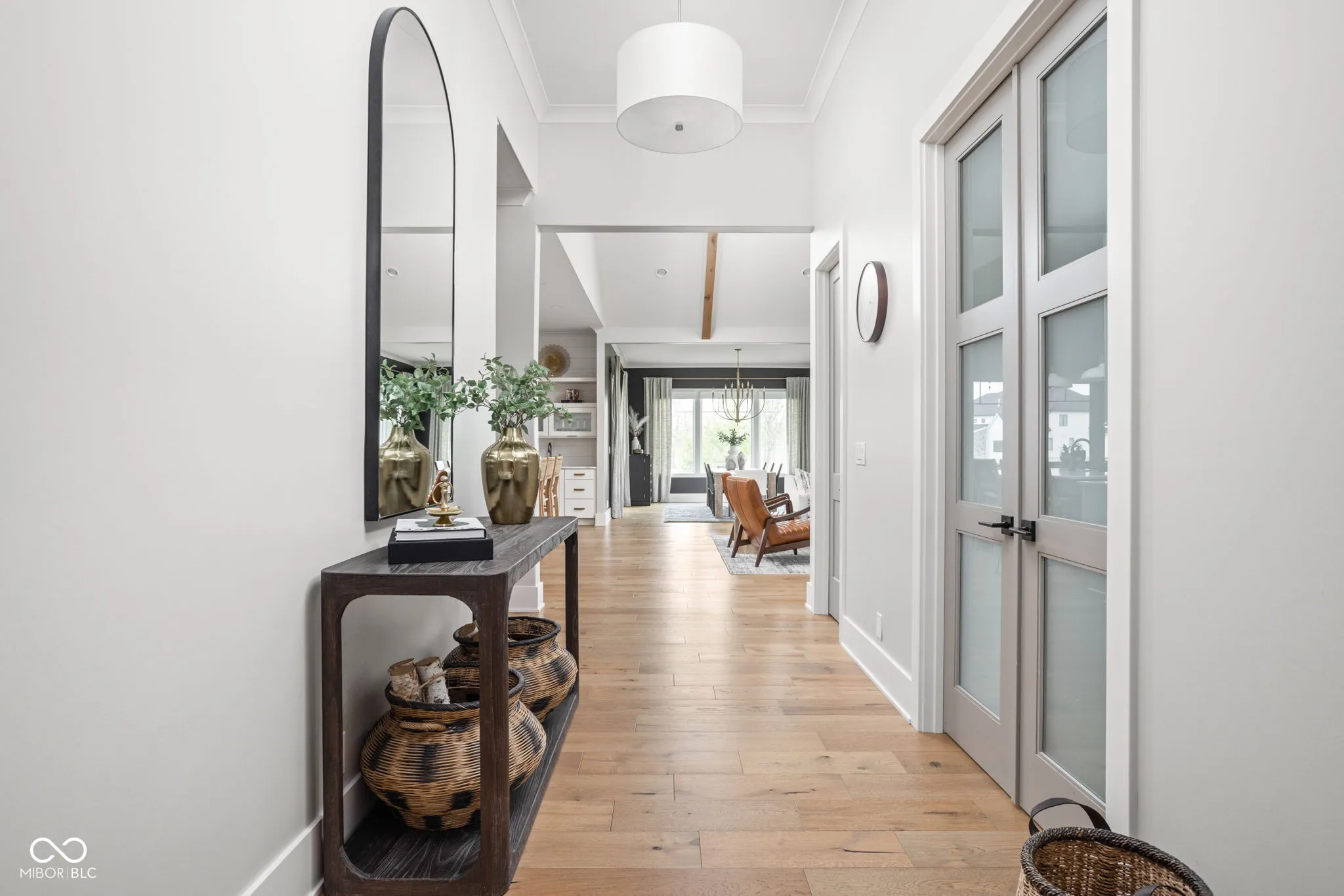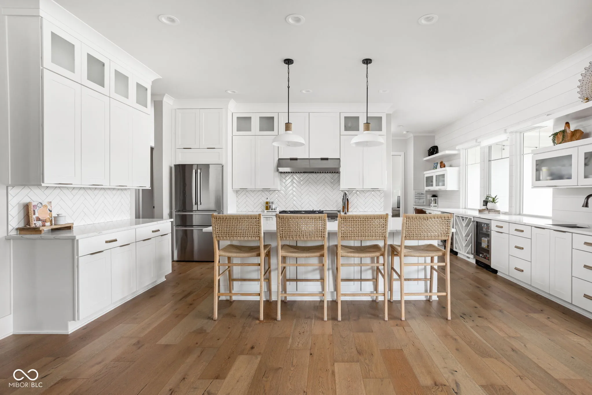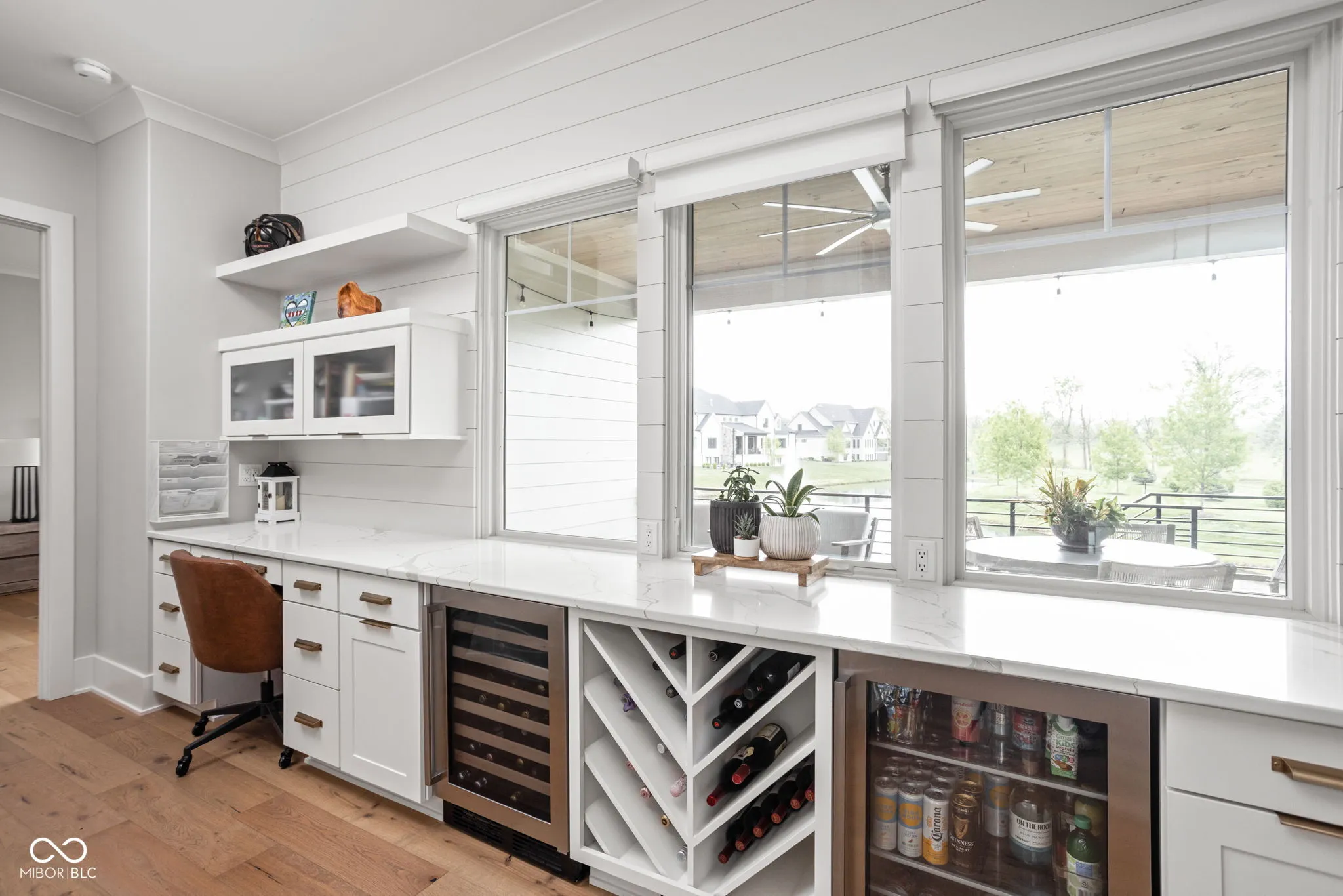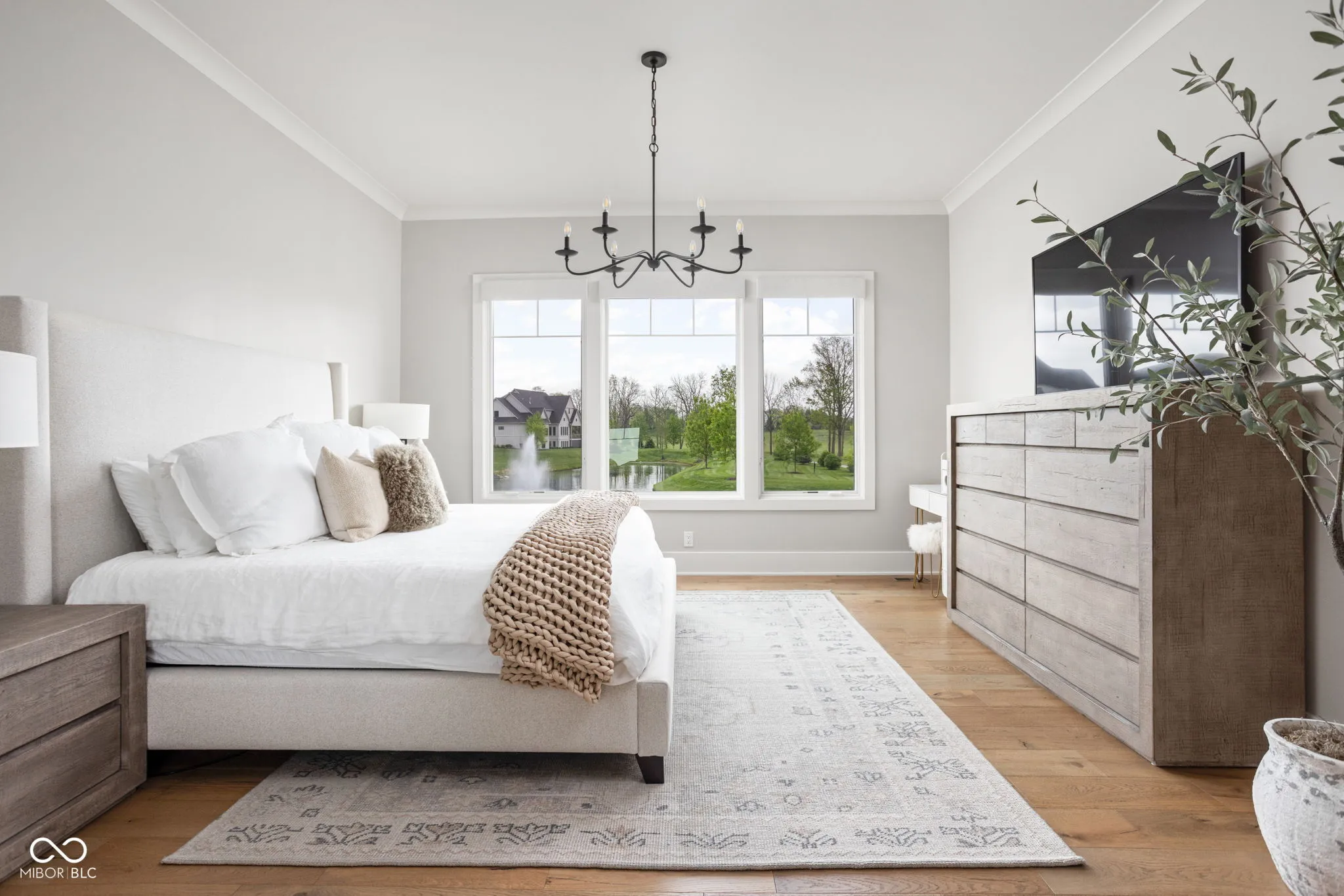 Experience elevated living in this exquisite, almost-new residence where thoughtful design meets luxurious comfort. From the moment you enter, the home welcomes you with soaring 10-foot ceilings and a striking beamed great room that serves as the heart of the home. The open-concept layout seamlessly connects to a chef-inspired kitchen, complete with an expansive island, quartz surfaces, custom cabinetry, commercial-grade range, dual beverage refrigerators, stainless steel appliances, a dedicated planning center, and an impressive walk-in pantry. Designed for both entertaining and everyday living, the sun-drenched dining area flows effortlessly into the great room and extends outdoors to a covered patio and inviting firepit-perfect for relaxing evenings or hosting guests. The main-level owner’s suite offers a serene escape, featuring picturesque views, a spa-like bath with a walk-in shower, freestanding soaking tub, and a dream-worthy custom closet. Additional main-floor highlights include a guest suite with full bath, a flexible den or sixth bedroom, an updated and well-appointed laundry room, and a functional mudroom with built-in storage. Upstairs, privacy and comfort continue with two spacious bedrooms, each offering en-suite baths and walk-in closets. The finished basement expands your living space with a stylish bar, fitness room, media and game area, a fifth bedroom, full bath, and integrated audio/visual features. With two separate 2-car garages and meticulous attention to detail throughout, this home delivers the perfect blend of luxury, functionality, and modern elegance.