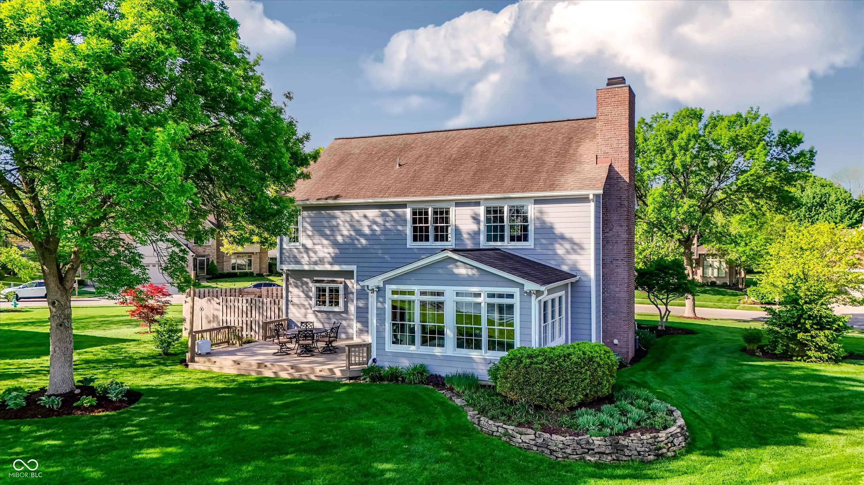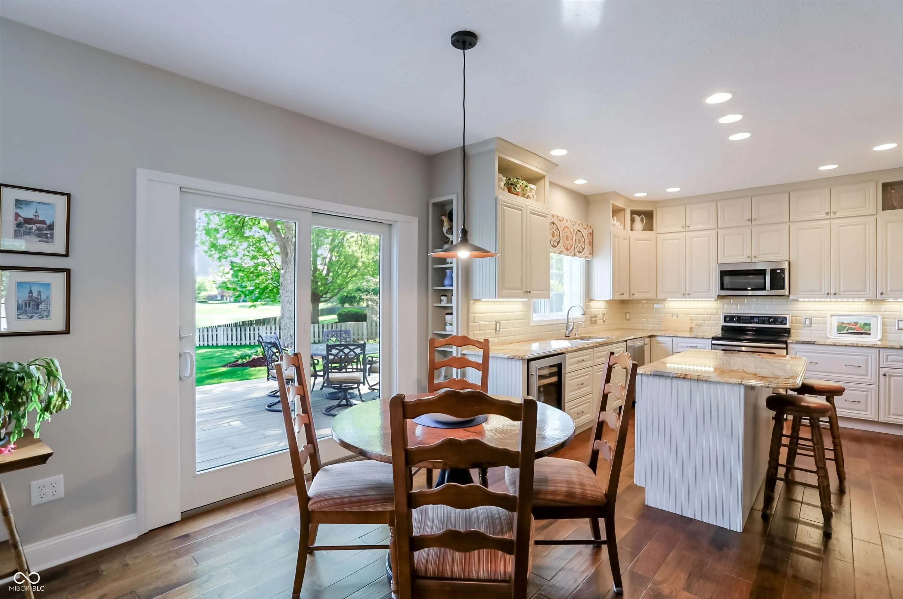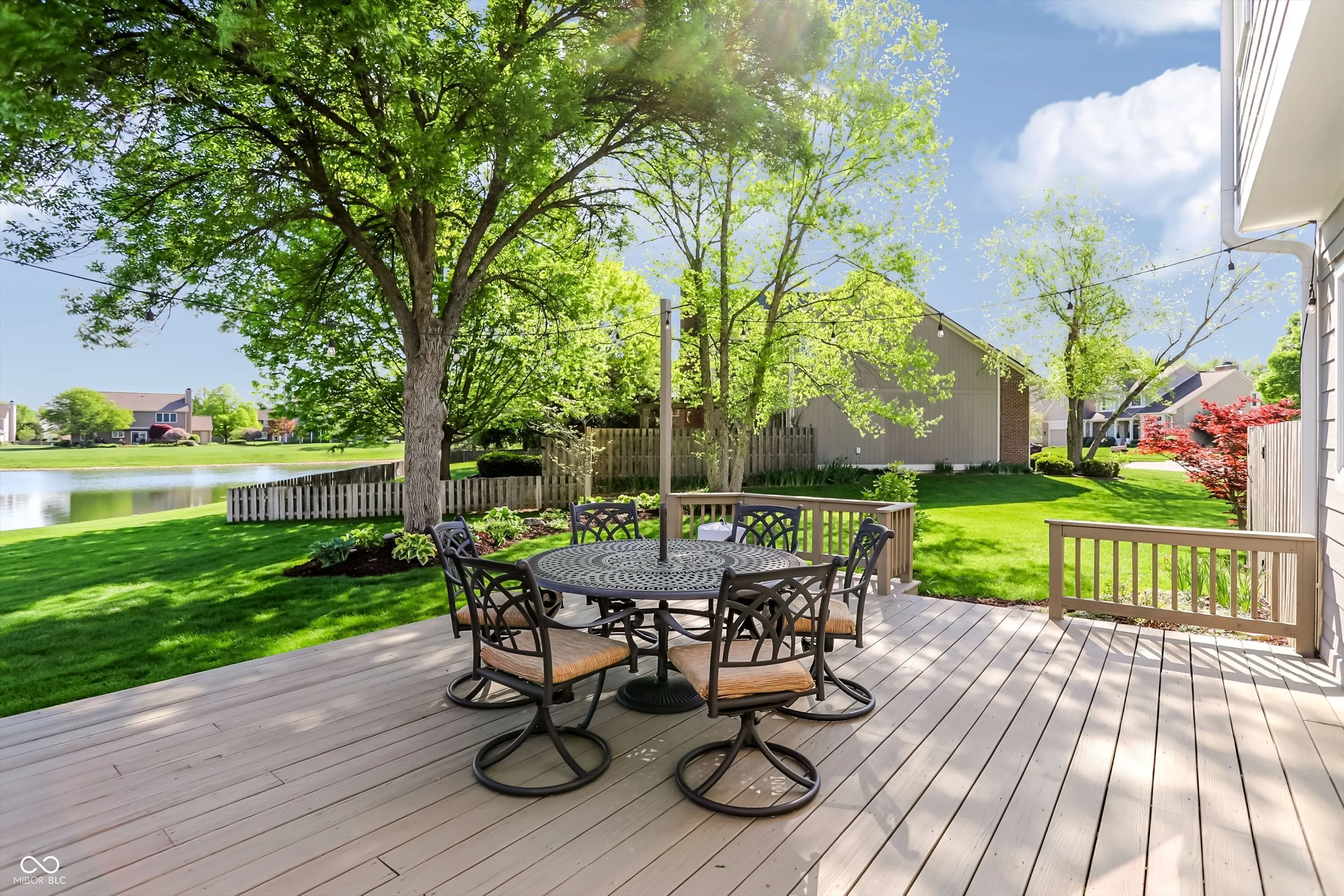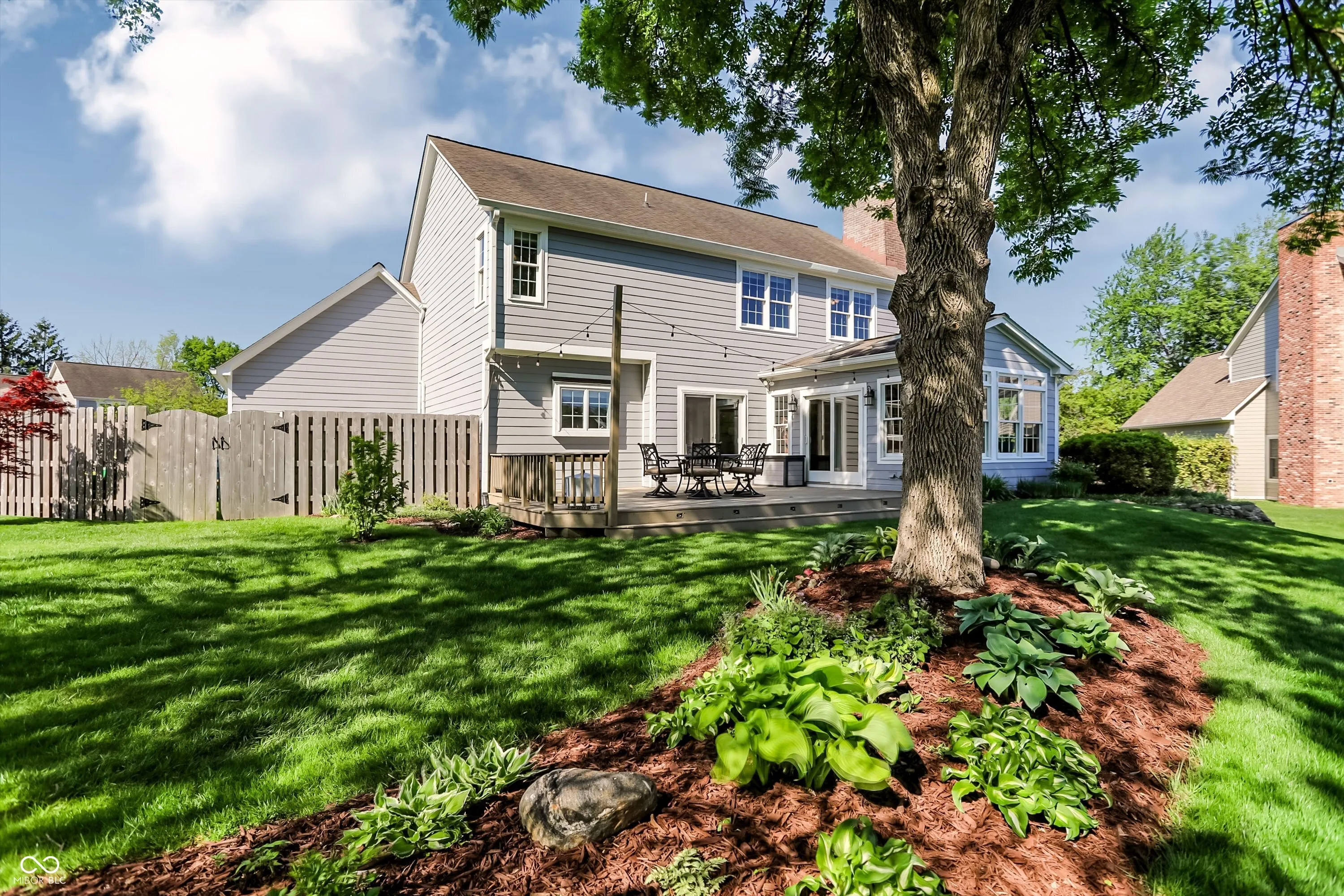 Experience the perfect blend of sophisticated updates and serene outdoor living in this meticulously maintained four-bedroom residence situated on a premier corner lot in Fishers. The main level welcomes you with solid oak Bella Cera hardwood floors that flow seamlessly through the formal living and dining rooms into a stunningly remodeled chef’s kitchen. This heart of the home features custom cabinetry, distinctive granite countertops, a central island with seating, a beverage refrigerator, and high-end stainless steel appliances. Adjacent to the kitchen, the inviting family room centers around a cozy fireplace, leading into a spectacular fourteen-by-sixteen-foot four-season sunroom. This bright retreat, along with the expansive twenty-five-foot rear deck, offers breathtaking views of the large pond and provides a shaded northeast exposure perfect for relaxing without the heat of the afternoon sun. Practicality meets luxury with a main-floor laundry room and updated powder room, both featuring recent high-end renovations. Upstairs, the spacious primary suite serves as a true sanctuary with high ceilings, a large walk-in closet, and a spa-like ensuite bath remodeled to include a soaking tub and a custom walk-in shower. Three additional generously sized bedrooms share a secondary full bath that was completely updated in 2020. For those seeking even more space, the clean, dry twelve-hundred-square-foot unfinished basement offers a massive footprint for play or future customization. The exterior is just as impressive, boasting durable Hardie Board siding, Andersen 400 windows, and a lush yard maintained by a full irrigation system and beautiful flower beds. The attached two-car garage is fully insulated and heated, providing extra comfort and attic storage. Located directly across from Riverside Intermediate and Junior High Schools with easy access to I-69 and I-465, this home combines an incredible location with over two decades of thoughtful, high-quality improveme