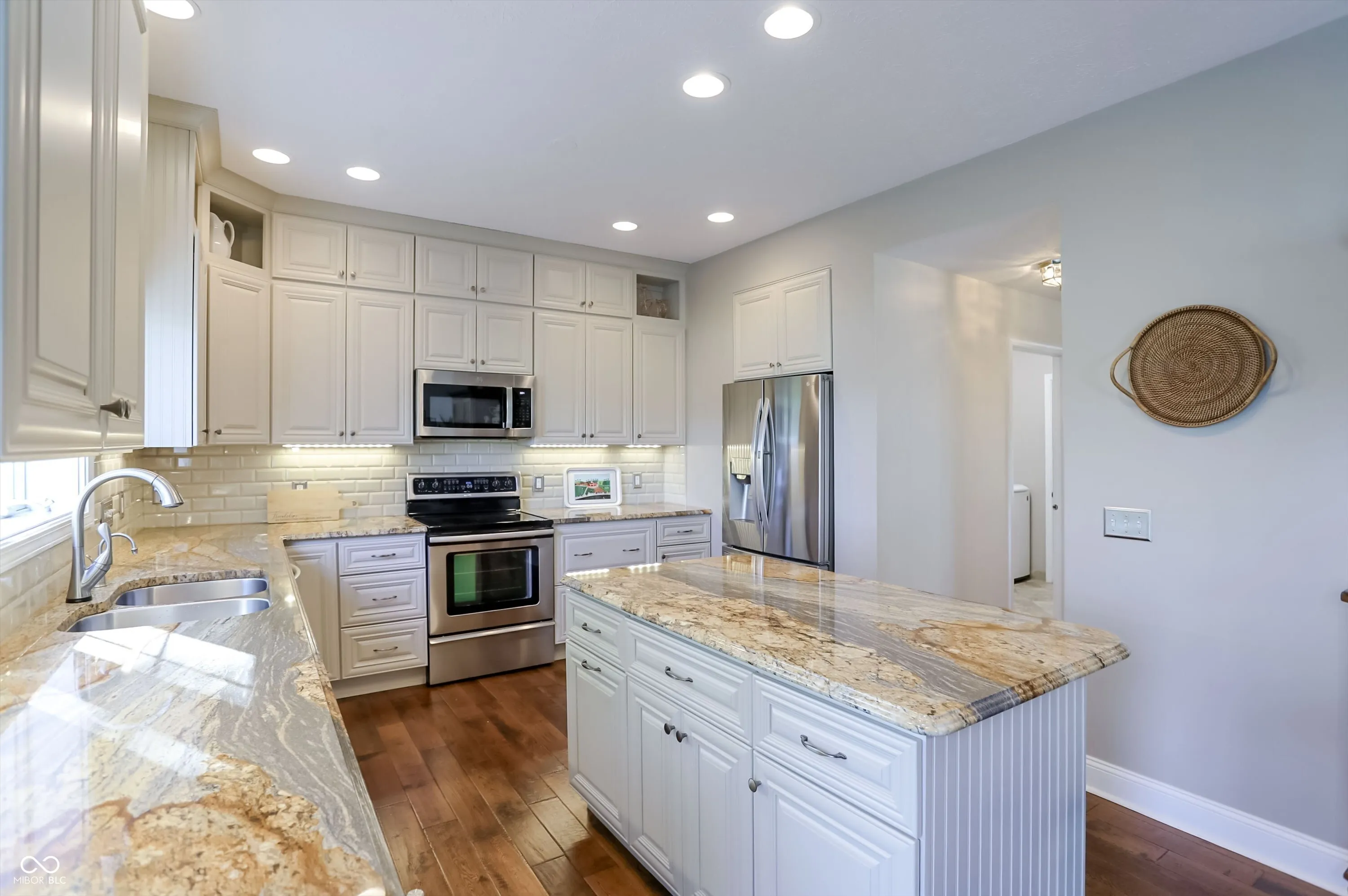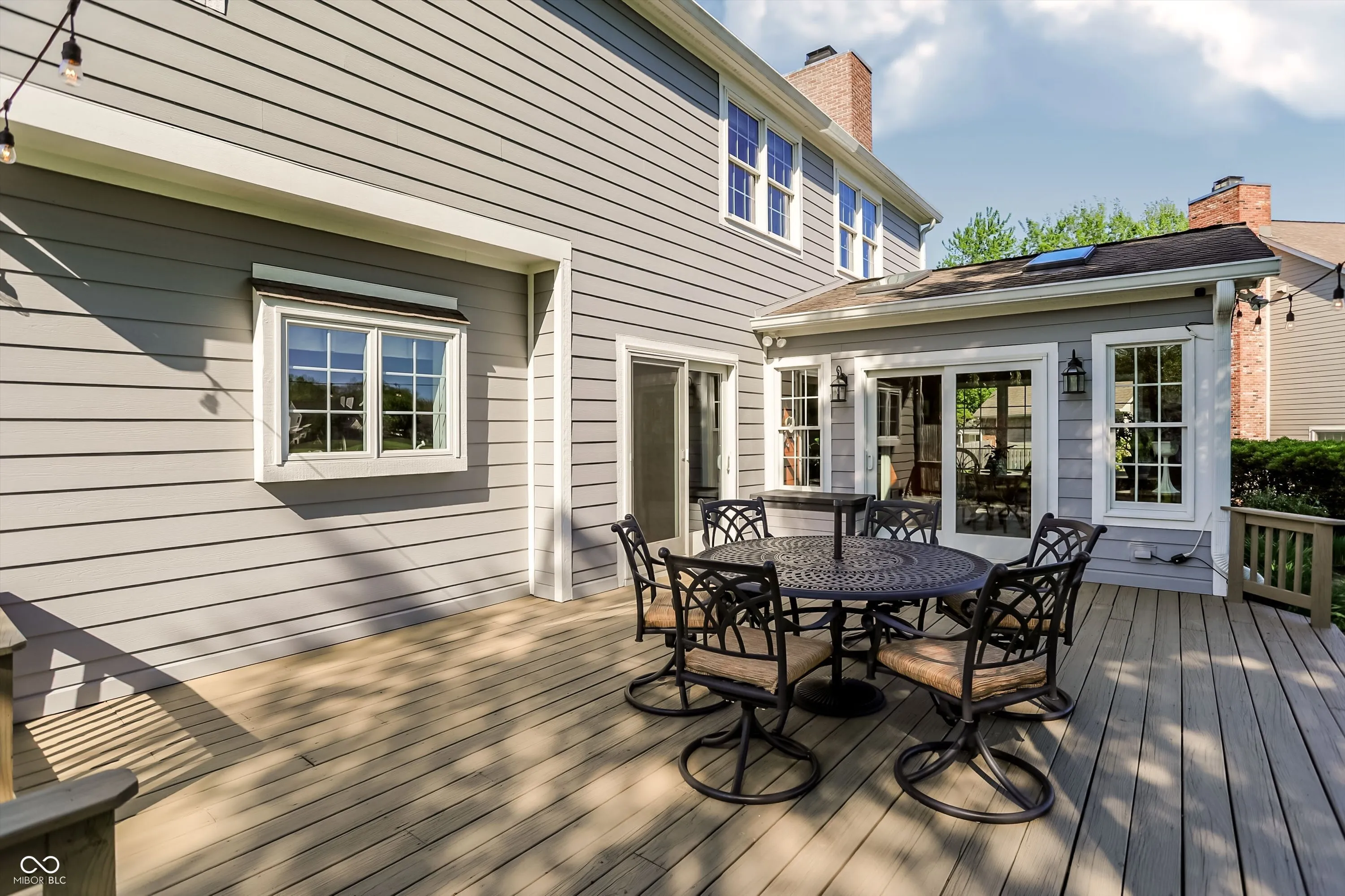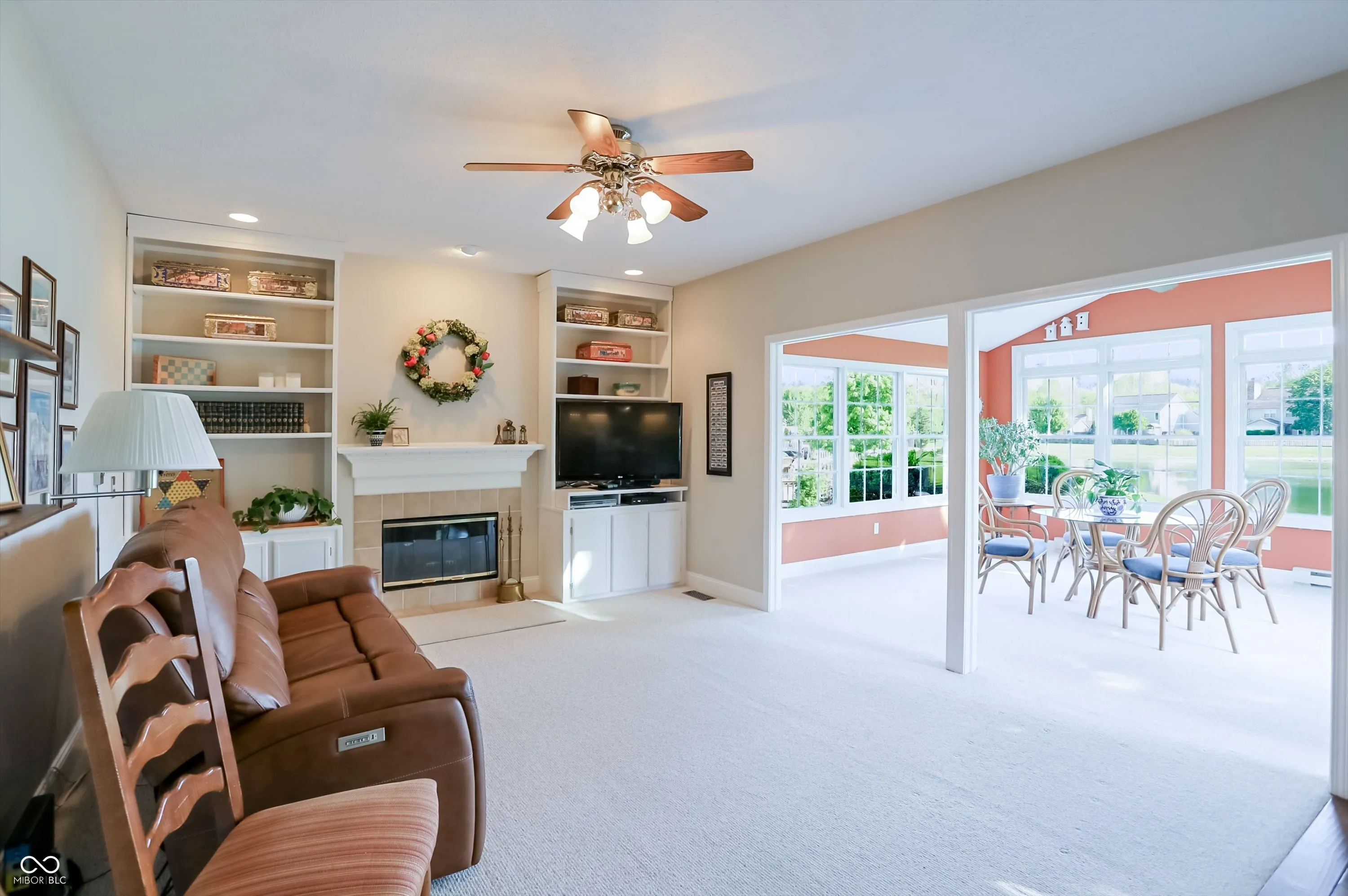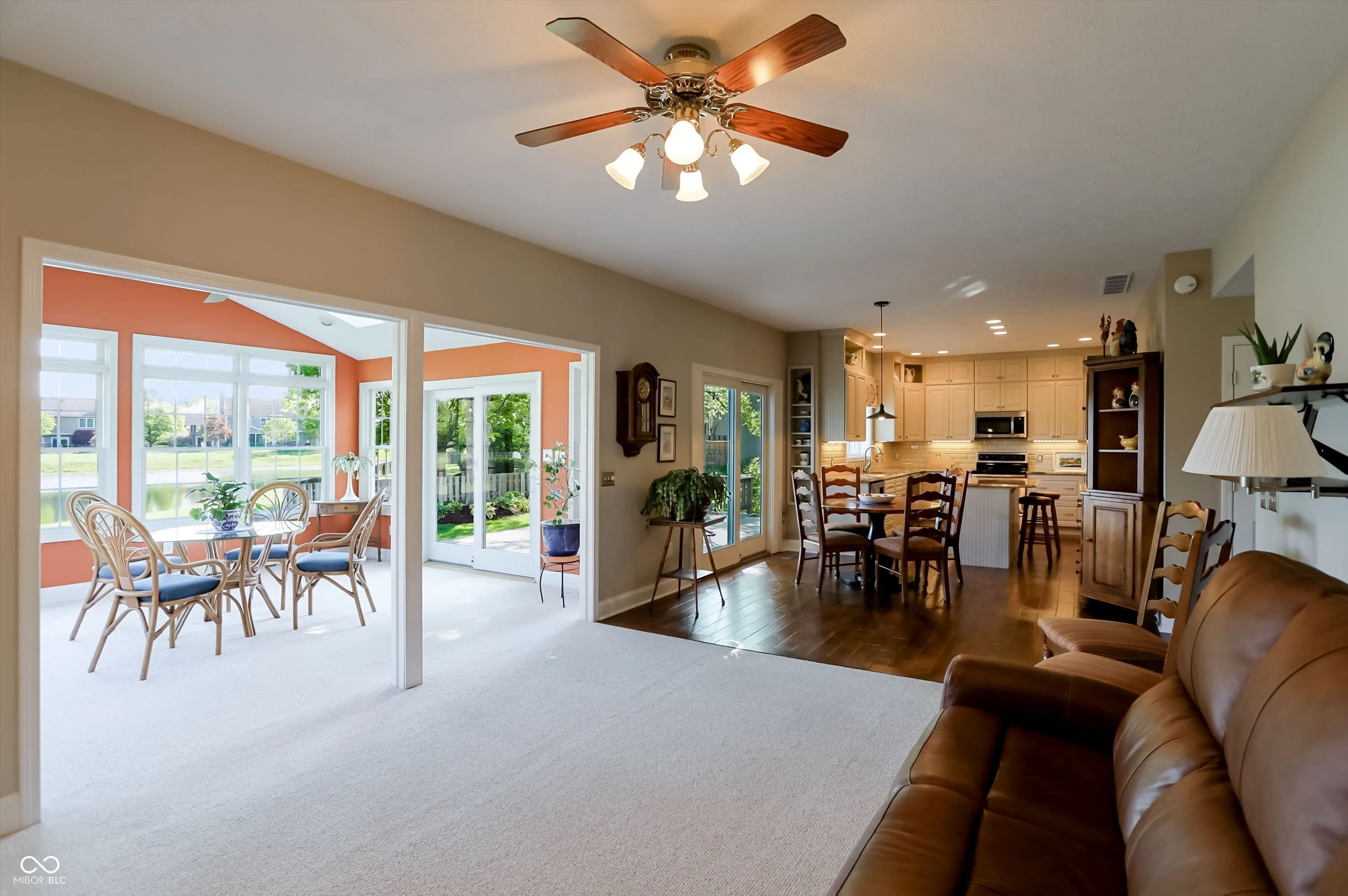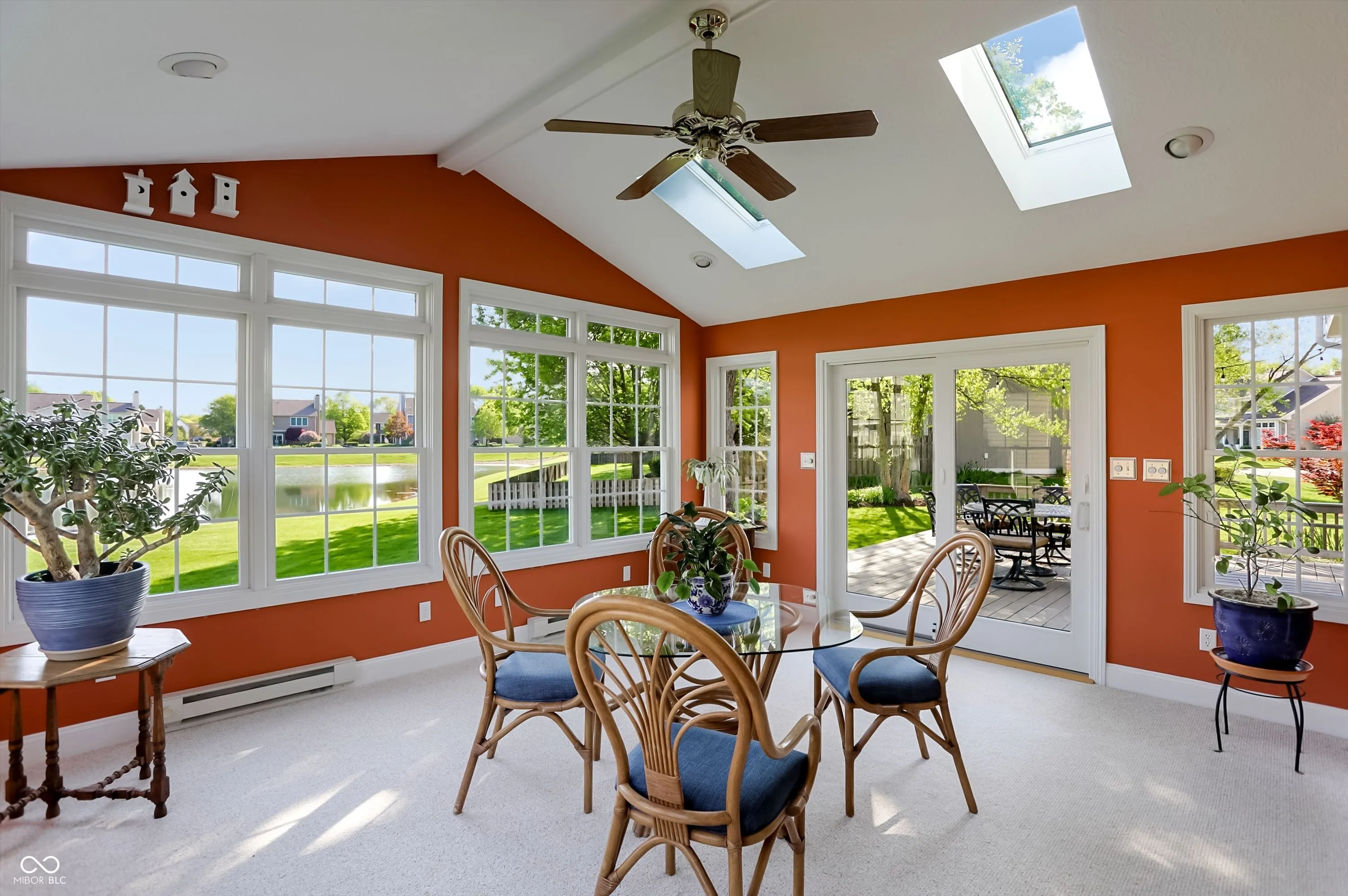 Experience the perfect blend of sophisticated updates and serene outdoor living in this meticulously maintained four-bedroom residence situated on a premier corner lot in Fishers. The main level welcomes you with solid oak Bella Cera hardwood floors that flow seamlessly through the formal living and dining rooms into a stunningly remodeled chef’s kitchen. This heart of the home features custom cabinetry, distinctive granite countertops, a central island with seating, a beverage refrigerator, and high-end stainless steel appliances. Adjacent to the kitchen, the inviting family room centers around a cozy fireplace, leading into a spectacular fourteen-by-sixteen-foot four-season sunroom. This bright retreat, along with the expansive twenty-five-foot rear deck, offers breathtaking views of the large pond and provides a shaded northeast exposure perfect for relaxing without the heat of the afternoon sun. Practicality meets luxury with a main-floor laundry room and updated powder room, both featuring recent high-end renovations. Upstairs, the spacious primary suite serves as a true sanctuary with high ceilings, a large walk-in closet, and a spa-like ensuite bath remodeled to include a soaking tub and a custom walk-in shower. Three additional generously sized bedrooms share a secondary full bath that was completely updated in 2020. For those seeking even more space, the clean, dry twelve-hundred-square-foot unfinished basement offers a massive footprint for play or future customization. The exterior is just as impressive, boasting durable Hardie Board siding, Andersen 400 windows, and a lush yard maintained by a full irrigation system and beautiful flower beds. The attached two-car garage is fully insulated and heated, providing extra comfort and attic storage. Located directly across from Riverside Intermediate and Junior High Schools with easy access to I-69 and I-465, this home combines an incredible location with over two decades of thoughtful, high-quality improveme