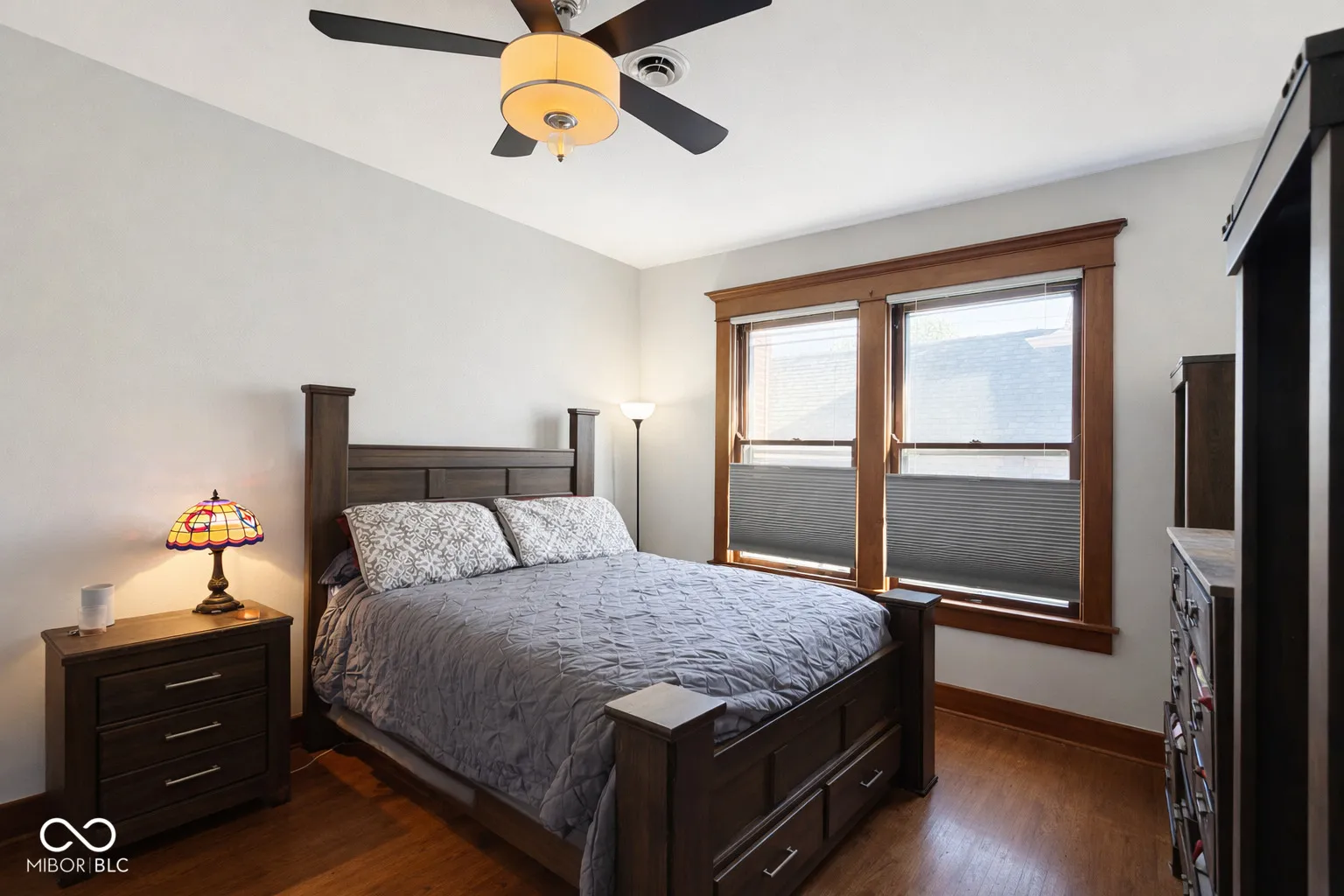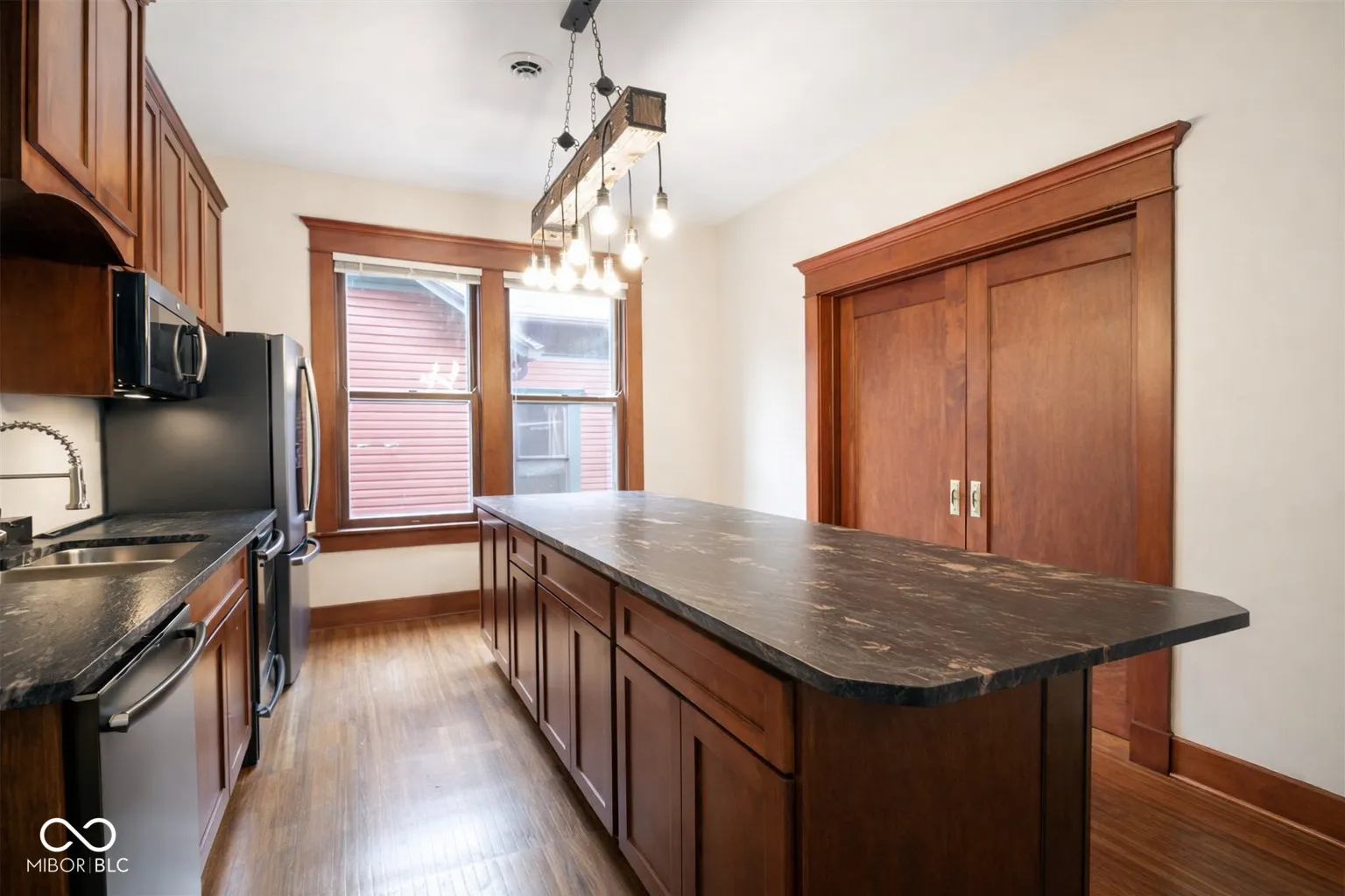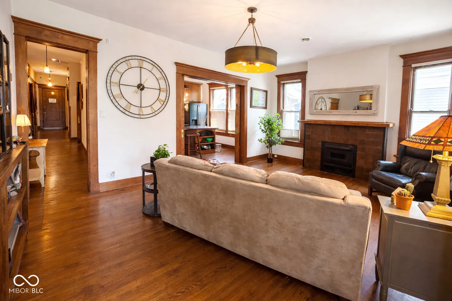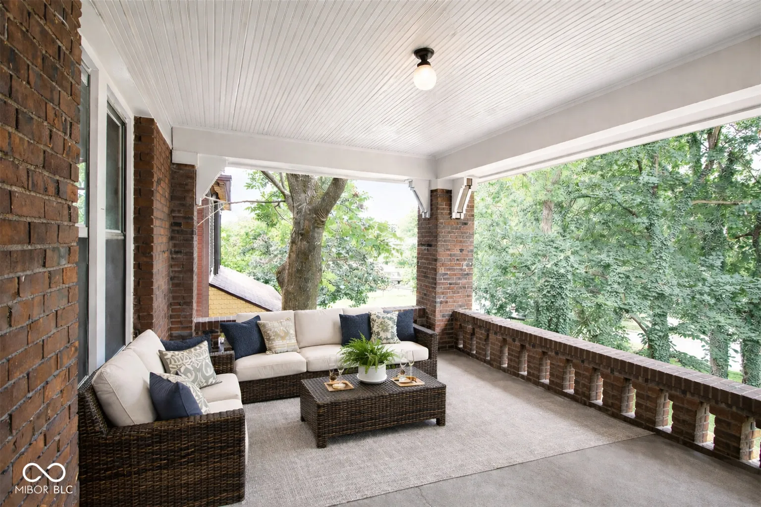 Welcome to this beautifully updated and exceptionally spacious 1-bedroom, 1-bath residence in the heart of Indy’s sought-after Old Northside neighborhood. With over 1,100 SF of thoughtfully designed living space, this second-floor top unit combines historic character with modern upgrades and everyday comfort. The interior features hardwood floors throughout, a fully renovated kitchen with sleek black slate appliances, an induction cooktop, GE Cafe dishwasher, and striking leathered granite countertops complemented by a contemporary backsplash. The bathroom has been completely reimagined with a walk-in shower with frameless glass door and a rain shower head, creating a clean, modern retreat. One of the home’s most distinctive features is the large, private covered porch-an ideal space for relaxing or entertaining, with elevated privacy overlooking a large park-like lawn with mature trees not found in many urban units. Additional highlights include in-unit laundry with an efficient LG washer/dryer combo and a dedicated garage parking space with ample storage. Located in the well-maintained historic Berrick building, residents enjoy the charm of early 20th-century architecture paired with the convenience of modern updates and great walkability to boutique shops and Indy’s top cafes and restaurants pocketed around the Old Northside and Mass Ave. The HOA supports exterior grounds maintenance and overall building care, as well as water/sewer fees and water heater, allowing for low-maintenance living in a prime location. This home offers an exceptional opportunity to own a move-in-ready property in one of the city’s most desirable neighborhoods.