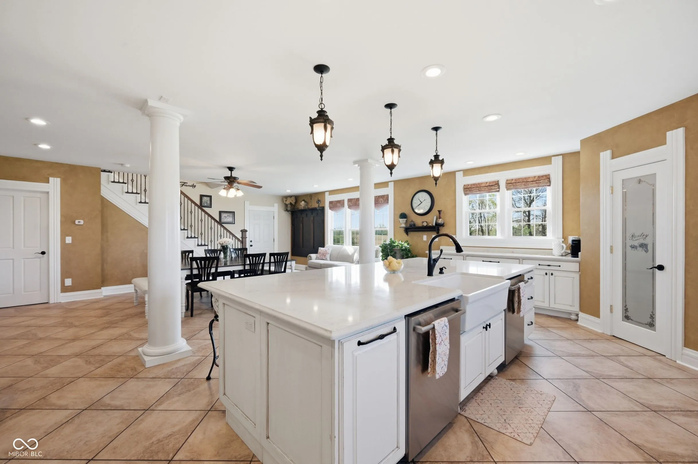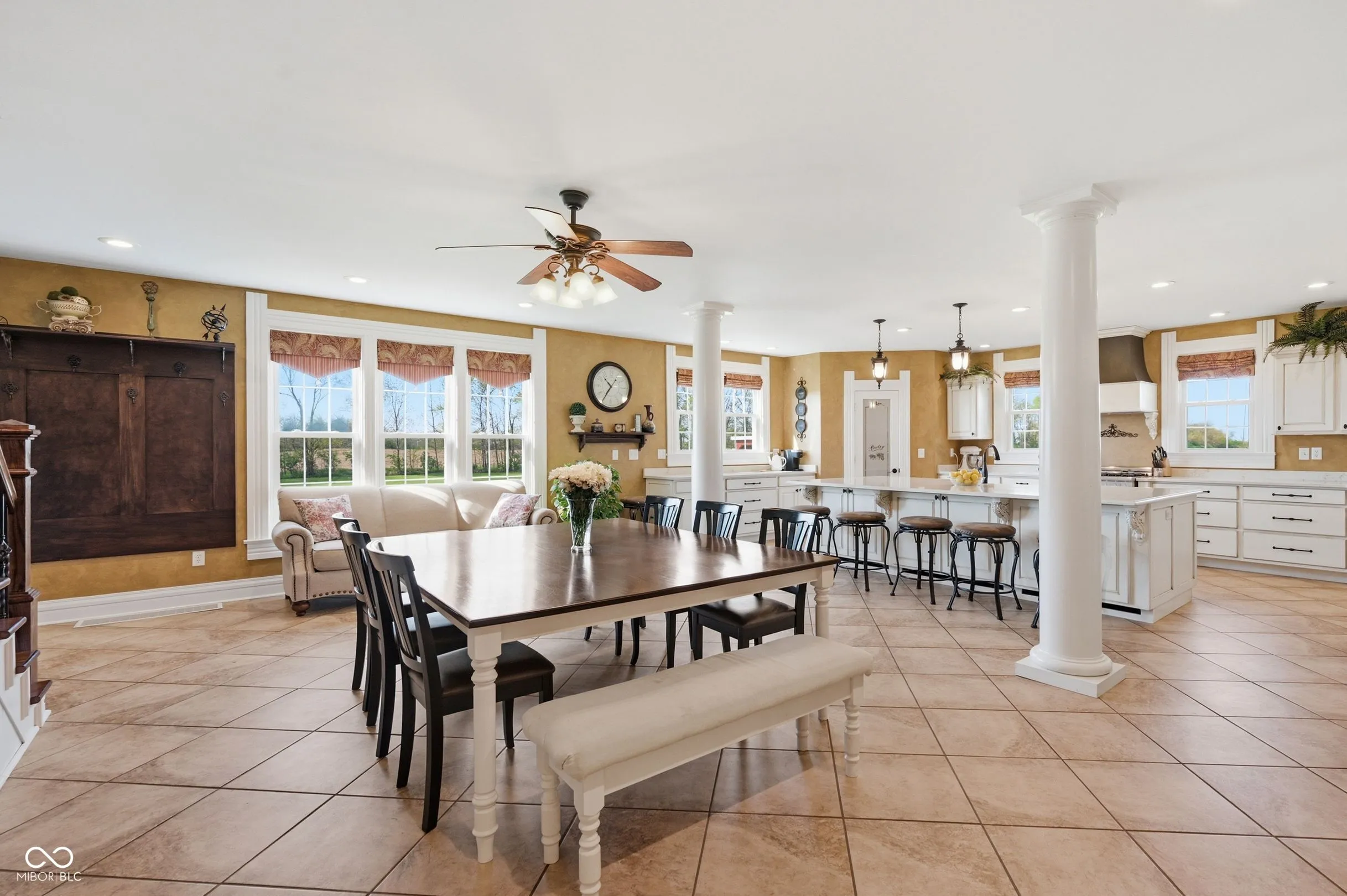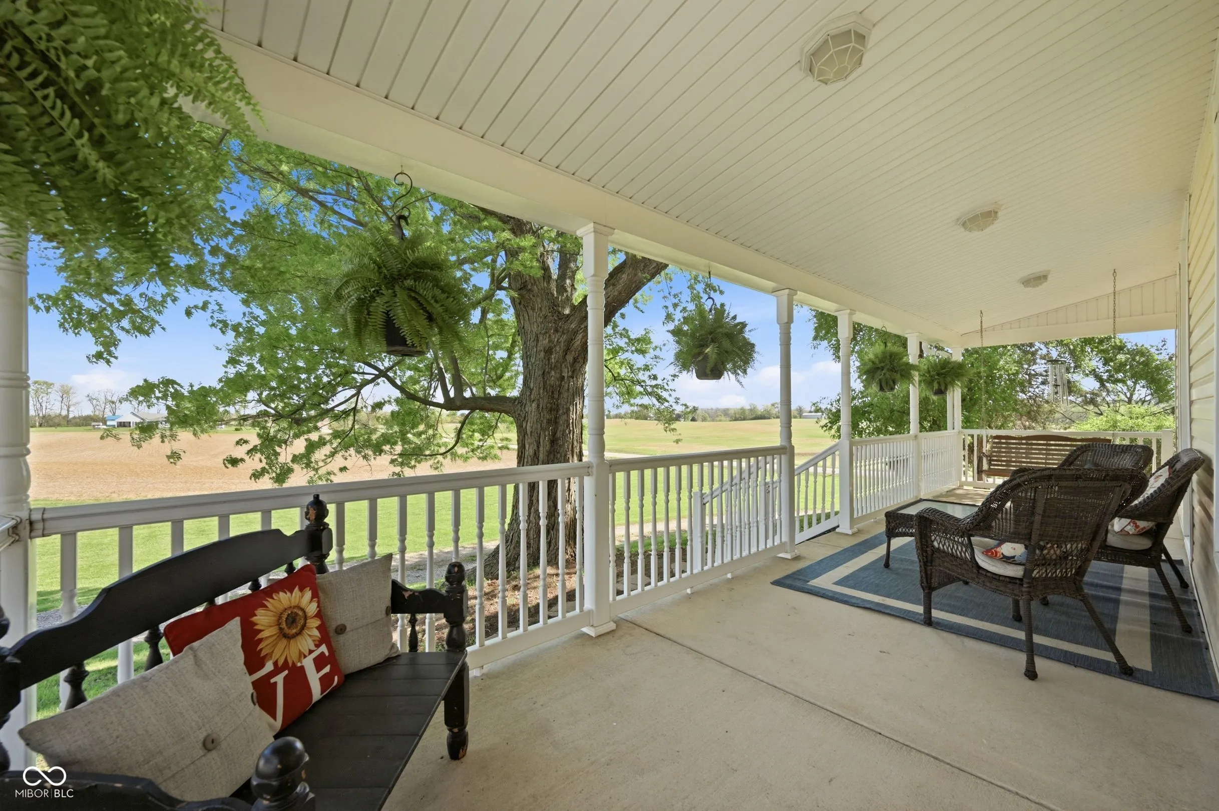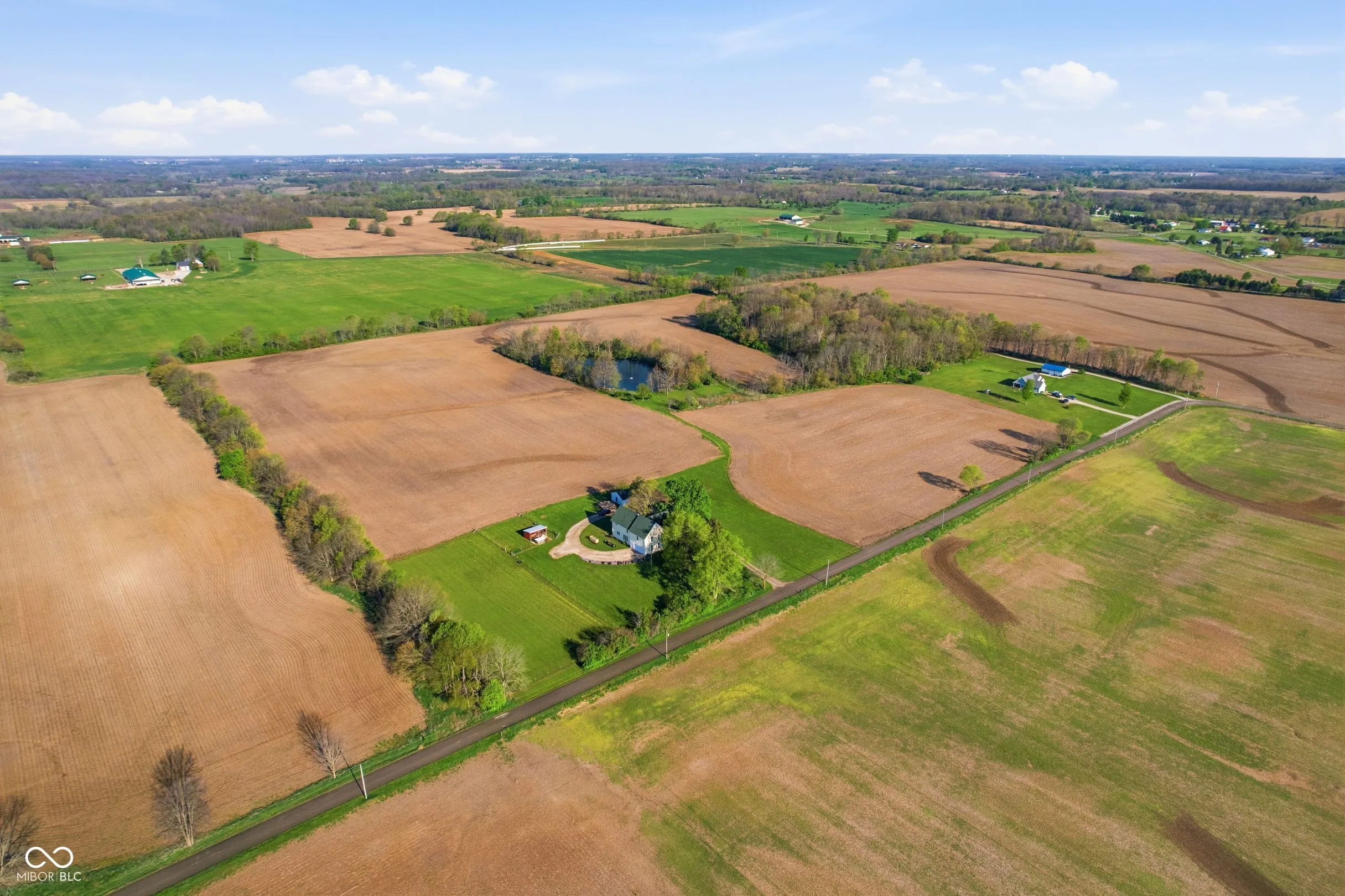Remarkable two-story farmhouse with historic charm and modern additions across 34 private acres. Take in the expansive country views from the inviting wrap-around porch before stepping inside to discover a thoughtfully designed main level. The heart of the home is a stunning modern kitchen featuring quartz countertops, a massive center island, custom gas range, dual dishwashers, and versatile space for a large dining table or casual living area. Centrally located is the formal dining room, which is perfectly balanced by a den/office on one side and a front living room flooded with natural light from tall, elegant windows on the other. Two separate staircases provide access to the perfectly balanced upper level, where a massive family room anchors the second-floor living space. The primary suite is a true retreat, offering a large walk-in closet and a beautifully appointed en-suite bathroom complete with a double vanity, a deep soaking tub, and a separate walk-in shower. A second spacious bedroom with its own walk-in closet and a nicely updated full guest bathroom sit just down the hall. As you continue across the upper level, the home transitions beautifully into its original footprint, showcasing rich historical characteristics like gorgeous hardwood floors and classic wood trim. An additional two bedrooms, a remarkably large laundry room outfitted with closets and shelving, and access to the home’s original second staircase complete the second floor. Outside, 34 acres await. A short walk leads to a private, stocked pond complete with fountain. The versatile acreage is currently used as both tillable land and pasture and includes a convenient lean-to for livestock or equipment. Practicality meets country living with both an attached two-car garage and a detached two-car garage, offering abundant parking, storage, and workshop space. Designed with practicality in mind, this home features a wood burning furnace, gas fireplace, and complimentary heat pump.