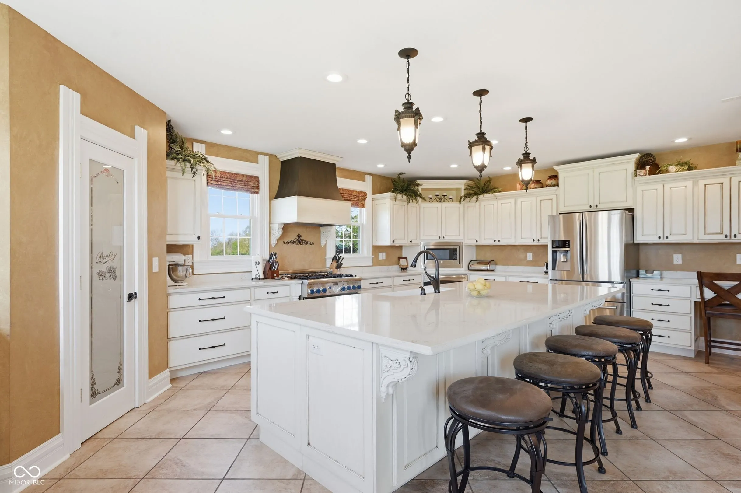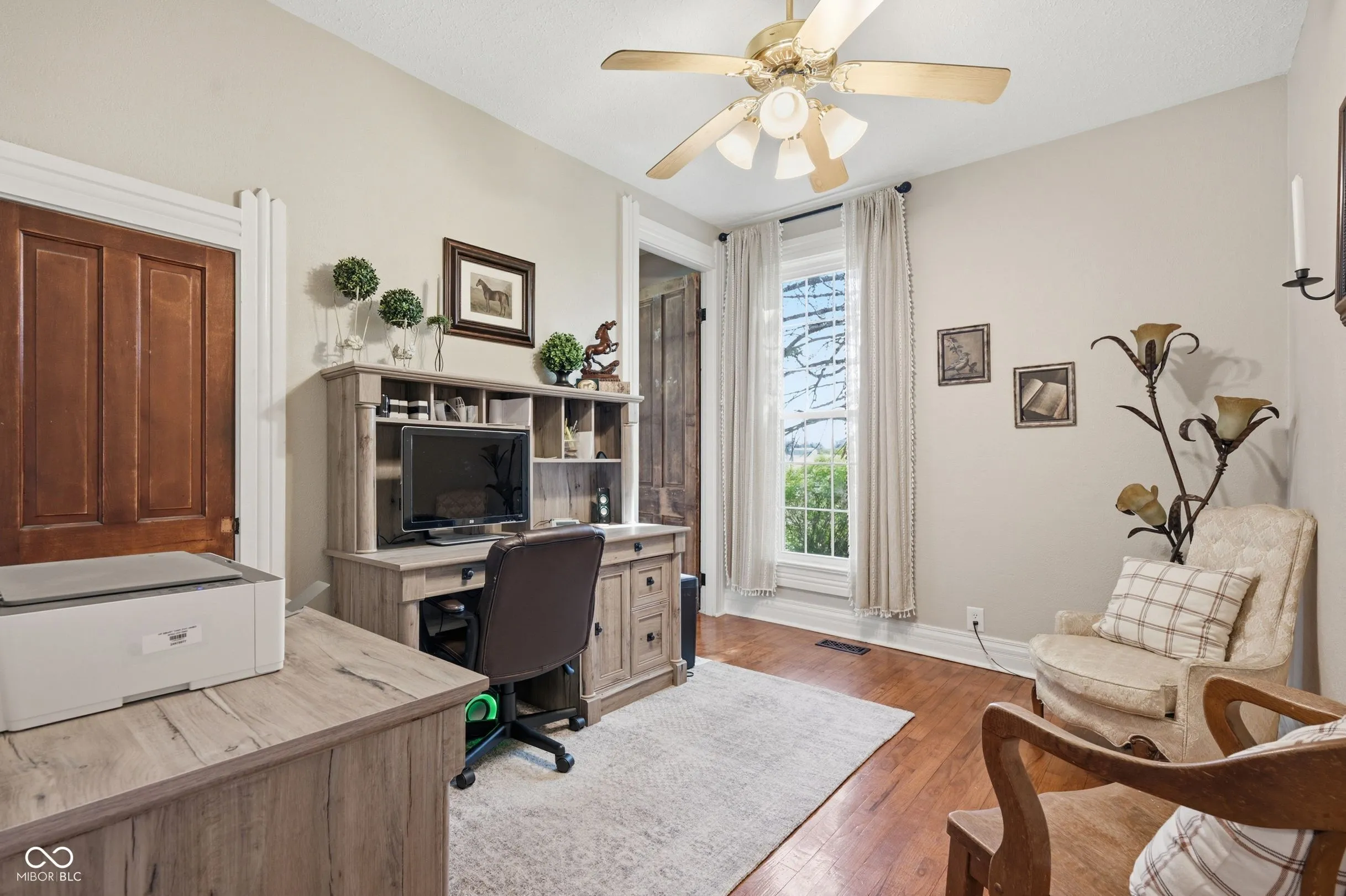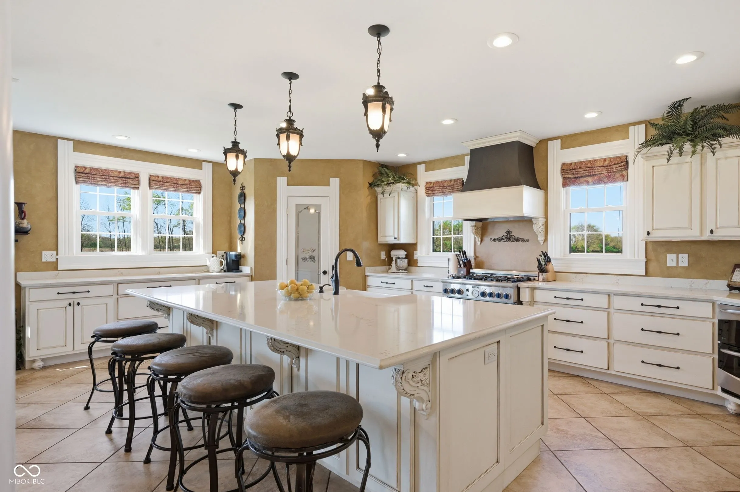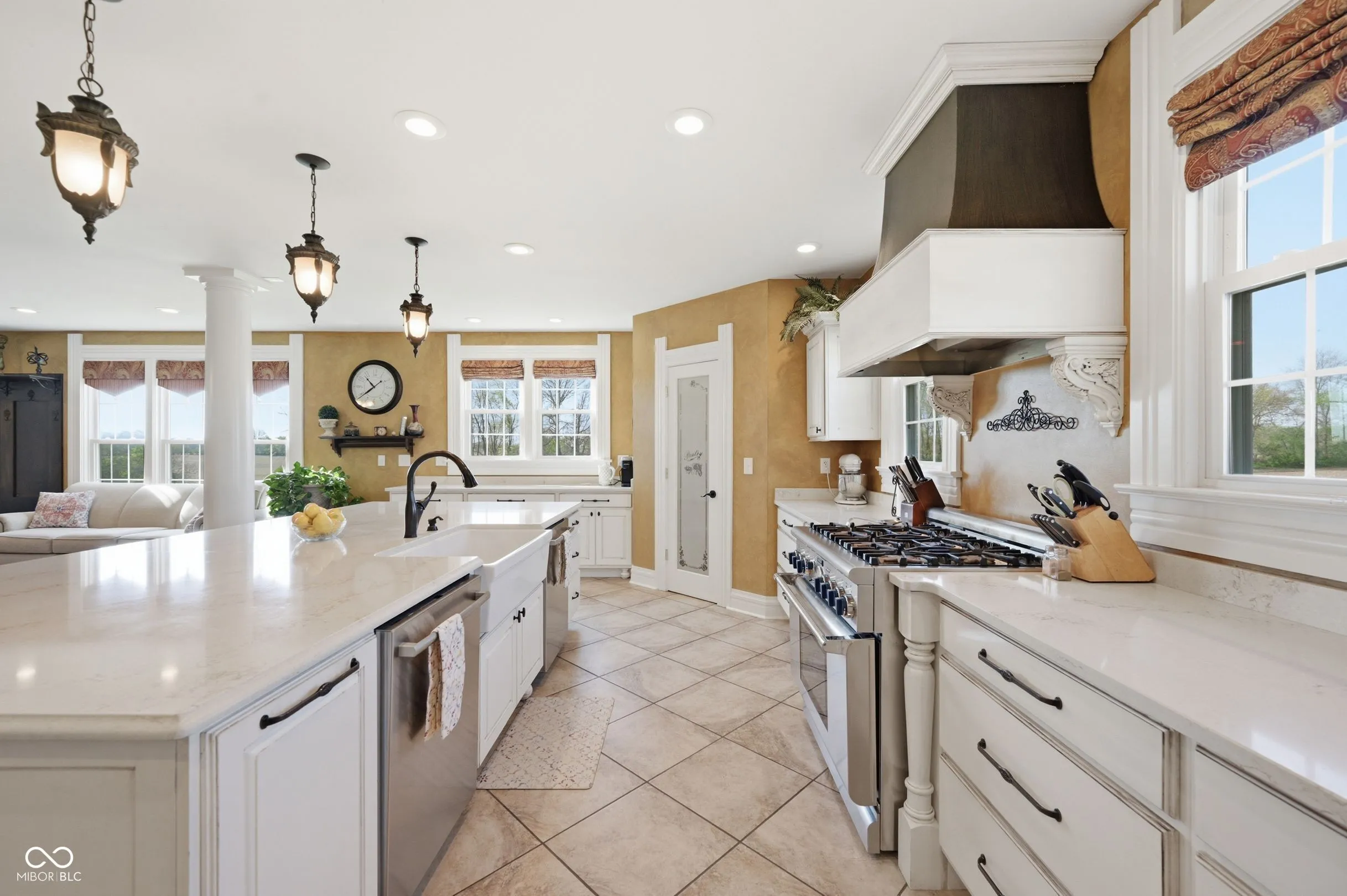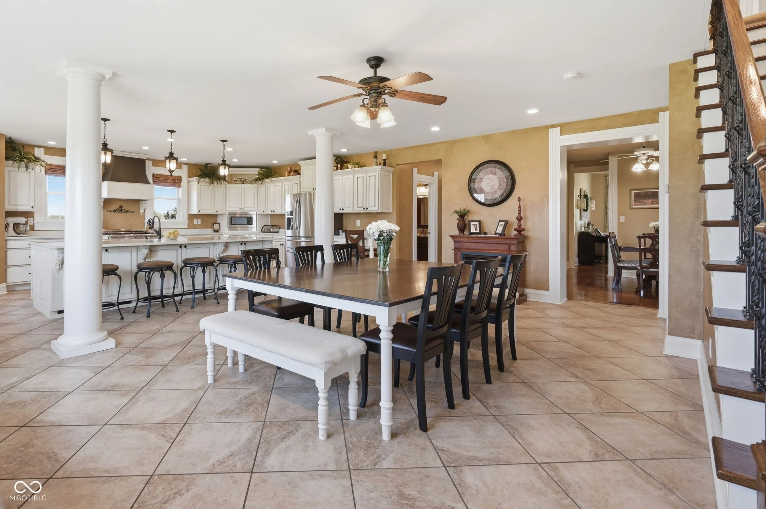 Remarkable two-story farmhouse with historic charm and modern additions across 34 private acres. Take in the expansive country views from the inviting wrap-around porch before stepping inside to discover a thoughtfully designed main level. The heart of the home is a stunning modern kitchen featuring quartz countertops, a massive center island, custom gas range, dual dishwashers, and versatile space for a large dining table or casual living area. Centrally located is the formal dining room, which is perfectly balanced by a den/office on one side and a front living room flooded with natural light from tall, elegant windows on the other. Two separate staircases provide access to the perfectly balanced upper level, where a massive family room anchors the second-floor living space. The primary suite is a true retreat, offering a large walk-in closet and a beautifully appointed en-suite bathroom complete with a double vanity, a deep soaking tub, and a separate walk-in shower. A second spacious bedroom with its own walk-in closet and a nicely updated full guest bathroom sit just down the hall. As you continue across the upper level, the home transitions beautifully into its original footprint, showcasing rich historical characteristics like gorgeous hardwood floors and classic wood trim. An additional two bedrooms, a remarkably large laundry room outfitted with closets and shelving, and access to the home’s original second staircase complete the second floor. Outside, 34 acres await. A short walk leads to a private, stocked pond complete with fountain. The versatile acreage is currently used as both tillable land and pasture and includes a convenient lean-to for livestock or equipment. Practicality meets country living with both an attached two-car garage and a detached two-car garage, offering abundant parking, storage, and workshop space. Designed with practicality in mind, this home features a wood burning furnace, gas fireplace, and complimentary heat pump.