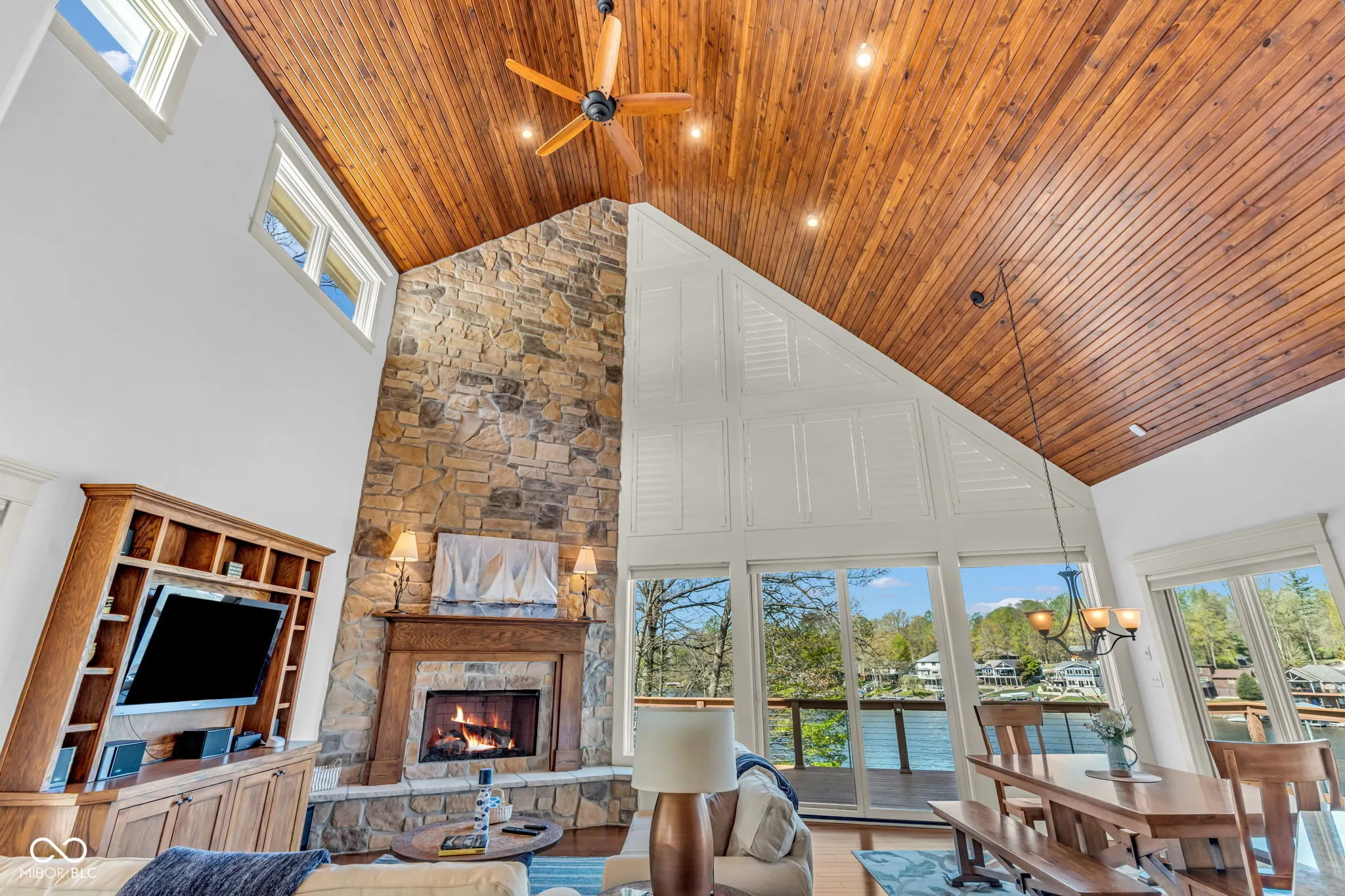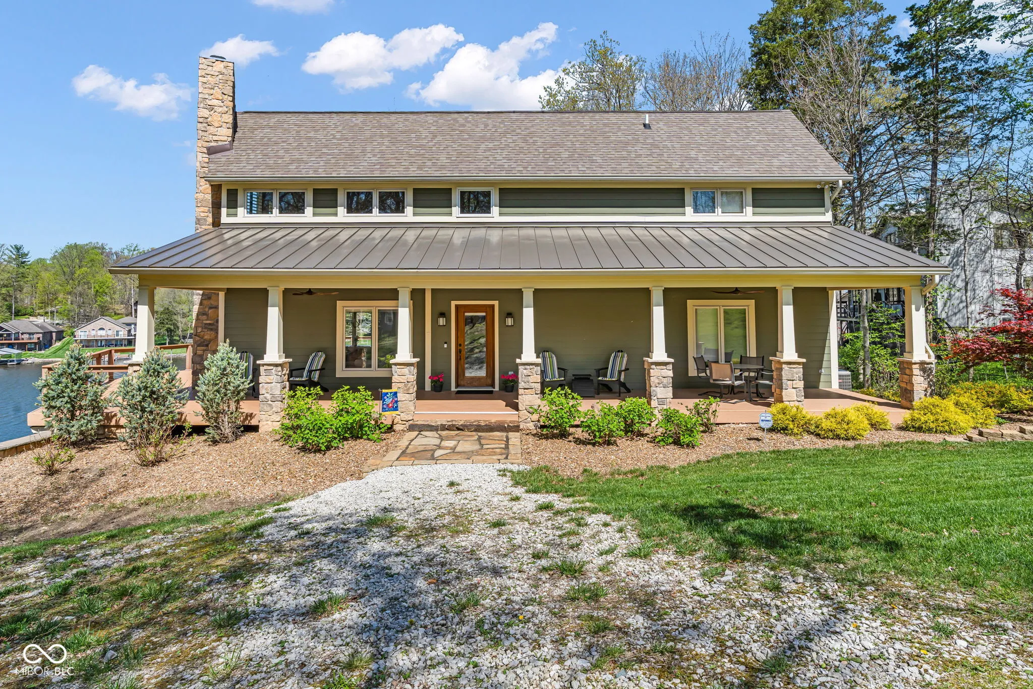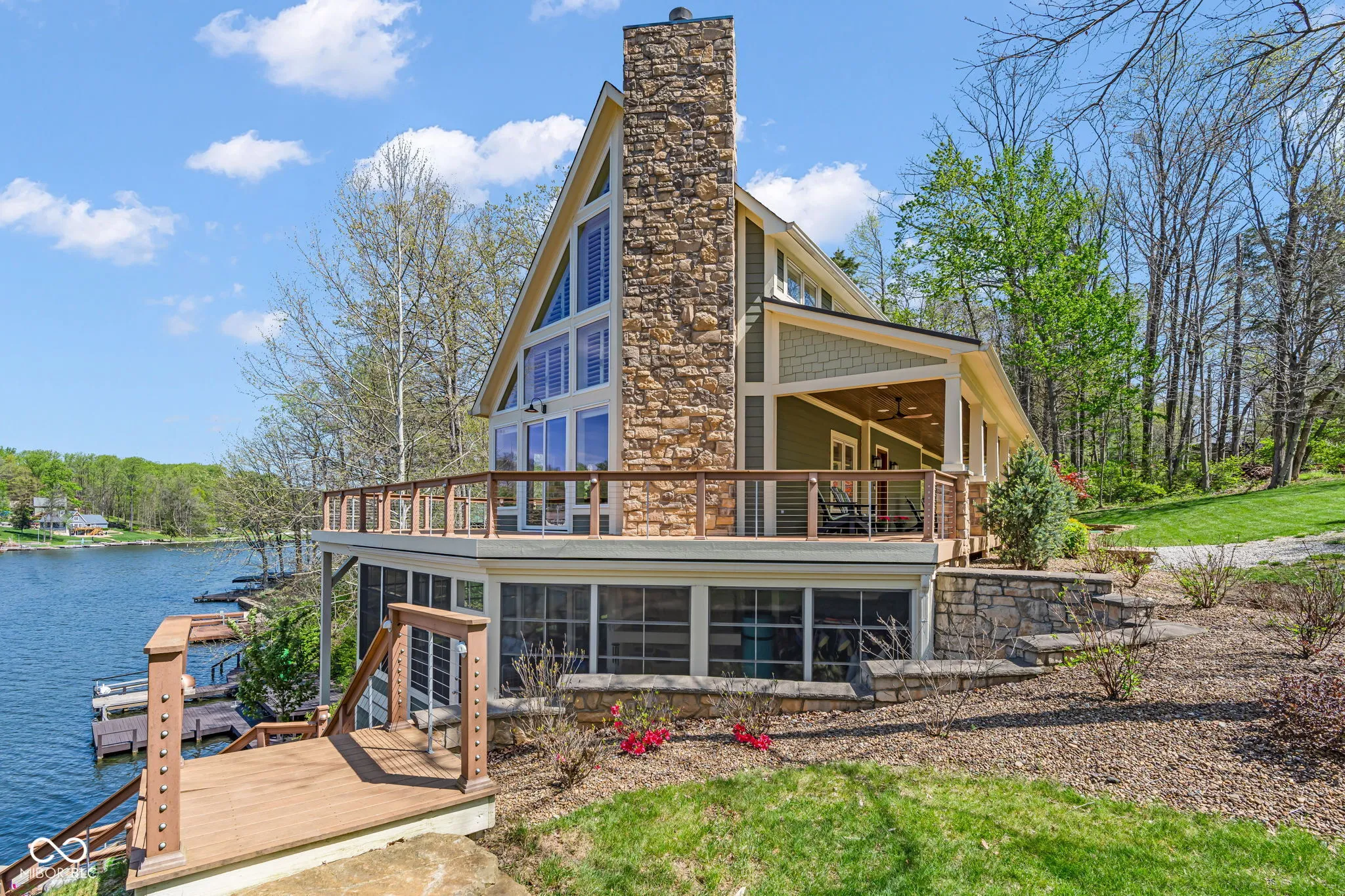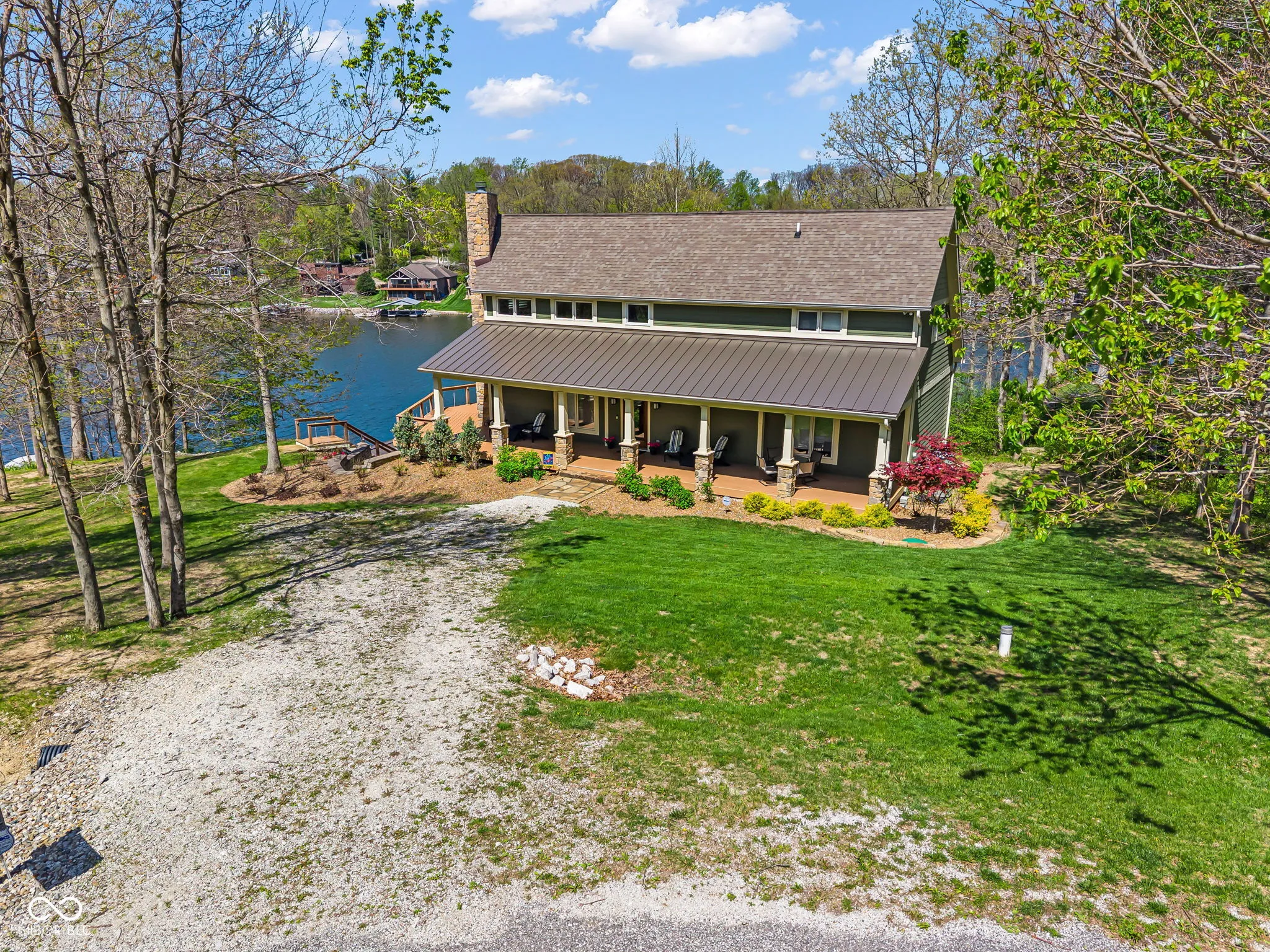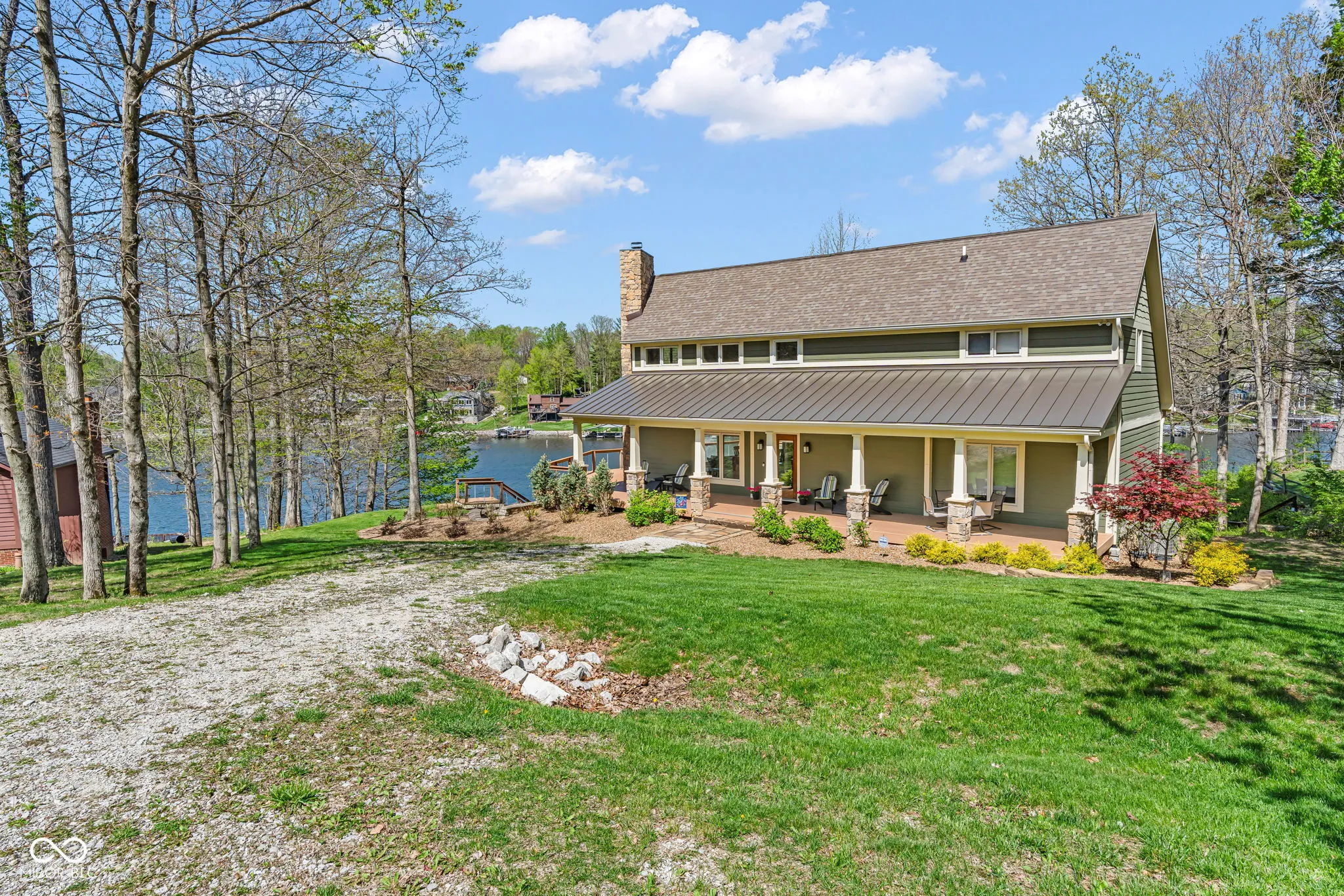 Welcome to 310 Victory Hill, an extraordinary custom-built lakefront home positioned on the main body of Heritage Lake. Offered for the first time, this one-owner residence features three levels of thoughtfully designed living with breathtaking water views throughout. A welcoming covered front porch sets the tone for relaxed lake living. Inside, you’re greeted by a custom boot bench and a stunning great room with vaulted wood slat ceilings, wood floors and expansive windows overlooking the lake. The kitchen is beautifully appointed with custom cabinetry, granite countertops, stainless steel appliances, and remote-controlled shutters for added convenience. The main level offers two generously sized bedrooms and a full bath with heated tile floors, double sinks, and a walk-in shower. Upstairs, the private primary suite includes an office nook, a spacious bedroom with incredible lake views, and a spa-like bath with a garden tub, separate cultured marble shower, double vanity, and heated tile floors. The fully finished walk-out lower level is ideal for entertaining or multi-generational living, featuring a large family room with custom lockers, a second full kitchen, additional bedroom, full bath with heated tile floors, and a screened-in patio with fireplace overlooking the water. A large laundry room and mechanical space complete the lower level. Outdoor living is unmatched with wraparound Trex deck for low-maintenance enjoyment and a newer dock with boathouse and lifts. This home is being offered fully furnished, including linens, housewares, and a pontoon,truly turnkey. Even the custom 16 ft. Christmas tree stays. A rare opportunity to own a premier lakefront property. Schedule your private showing today and experience lake living at its finest.