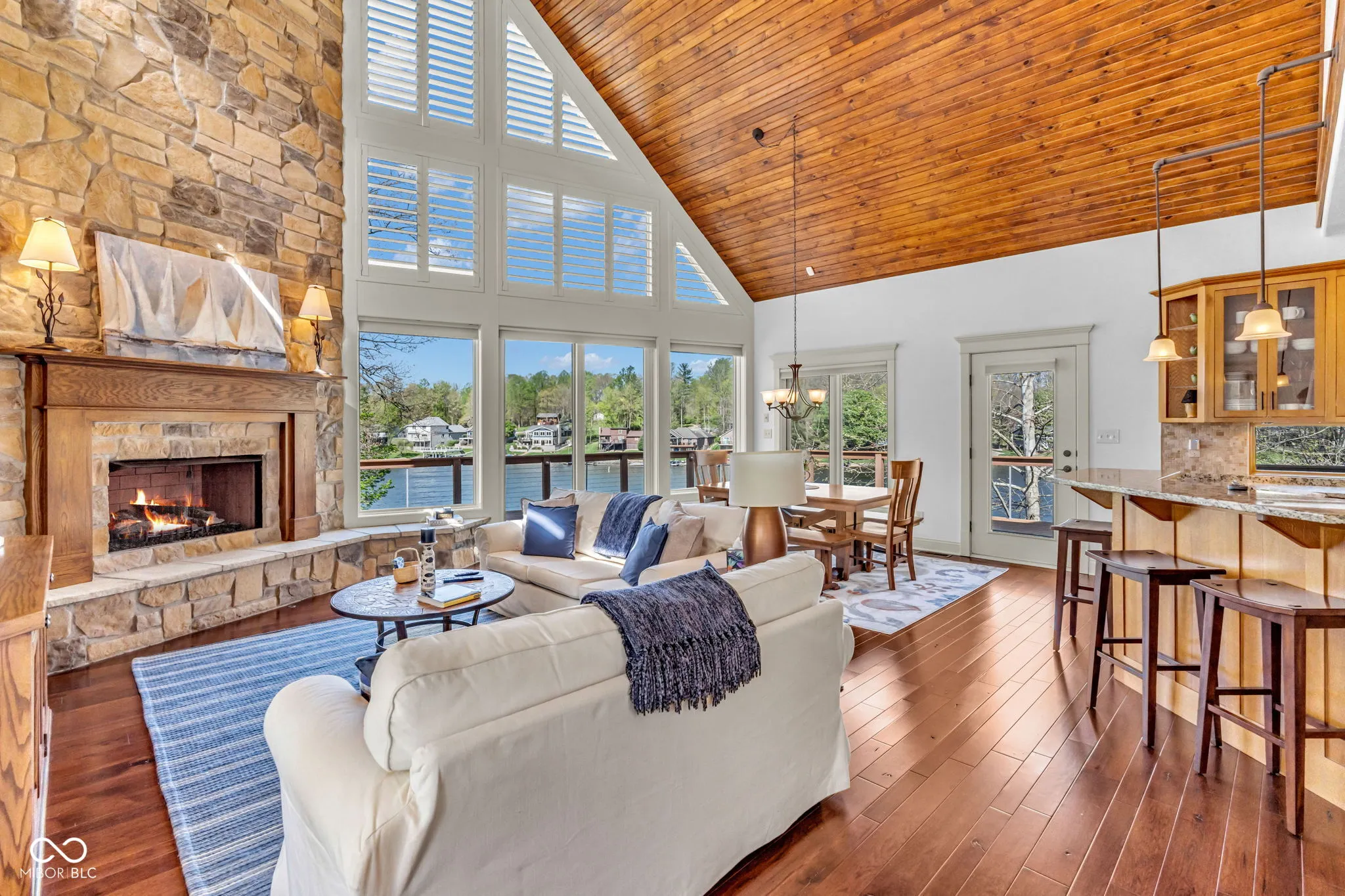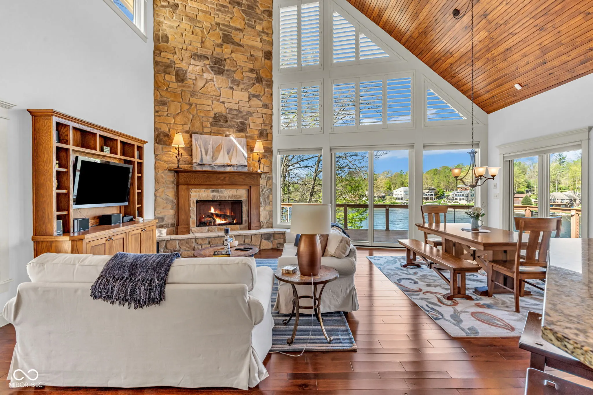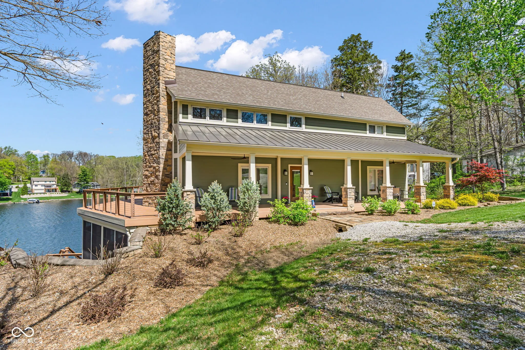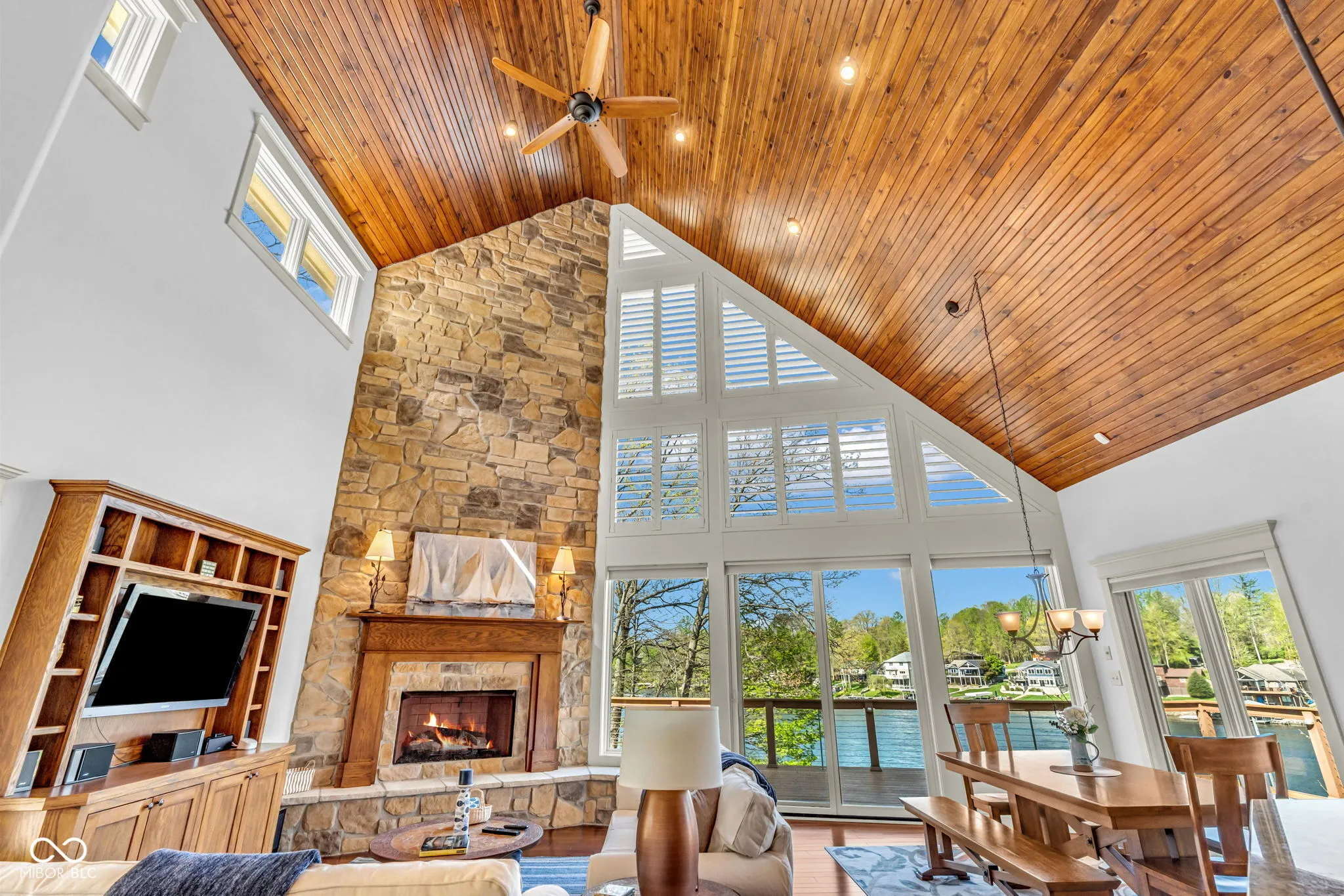 Welcome to 310 Victory Hill, an extraordinary custom-built lakefront home positioned on the main body of Heritage Lake. Offered for the first time, this one-owner residence features three levels of thoughtfully designed living with breathtaking water views throughout. A welcoming covered front porch sets the tone for relaxed lake living. Inside, you’re greeted by a custom boot bench and a stunning great room with vaulted wood slat ceilings, wood floors and expansive windows overlooking the lake. The kitchen is beautifully appointed with custom cabinetry, granite countertops, stainless steel appliances, and remote-controlled shutters for added convenience. The main level offers two generously sized bedrooms and a full bath with heated tile floors, double sinks, and a walk-in shower. Upstairs, the private primary suite includes an office nook, a spacious bedroom with incredible lake views, and a spa-like bath with a garden tub, separate cultured marble shower, double vanity, and heated tile floors. The fully finished walk-out lower level is ideal for entertaining or multi-generational living, featuring a large family room with custom lockers, a second full kitchen, additional bedroom, full bath with heated tile floors, and a screened-in patio with fireplace overlooking the water. A large laundry room and mechanical space complete the lower level. Outdoor living is unmatched with wraparound Trex deck for low-maintenance enjoyment and a newer dock with boathouse and lifts. This home is being offered fully furnished, including linens, housewares, and a pontoon,truly turnkey. Even the custom 16 ft. Christmas tree stays. A rare opportunity to own a premier lakefront property. Schedule your private showing today and experience lake living at its finest.