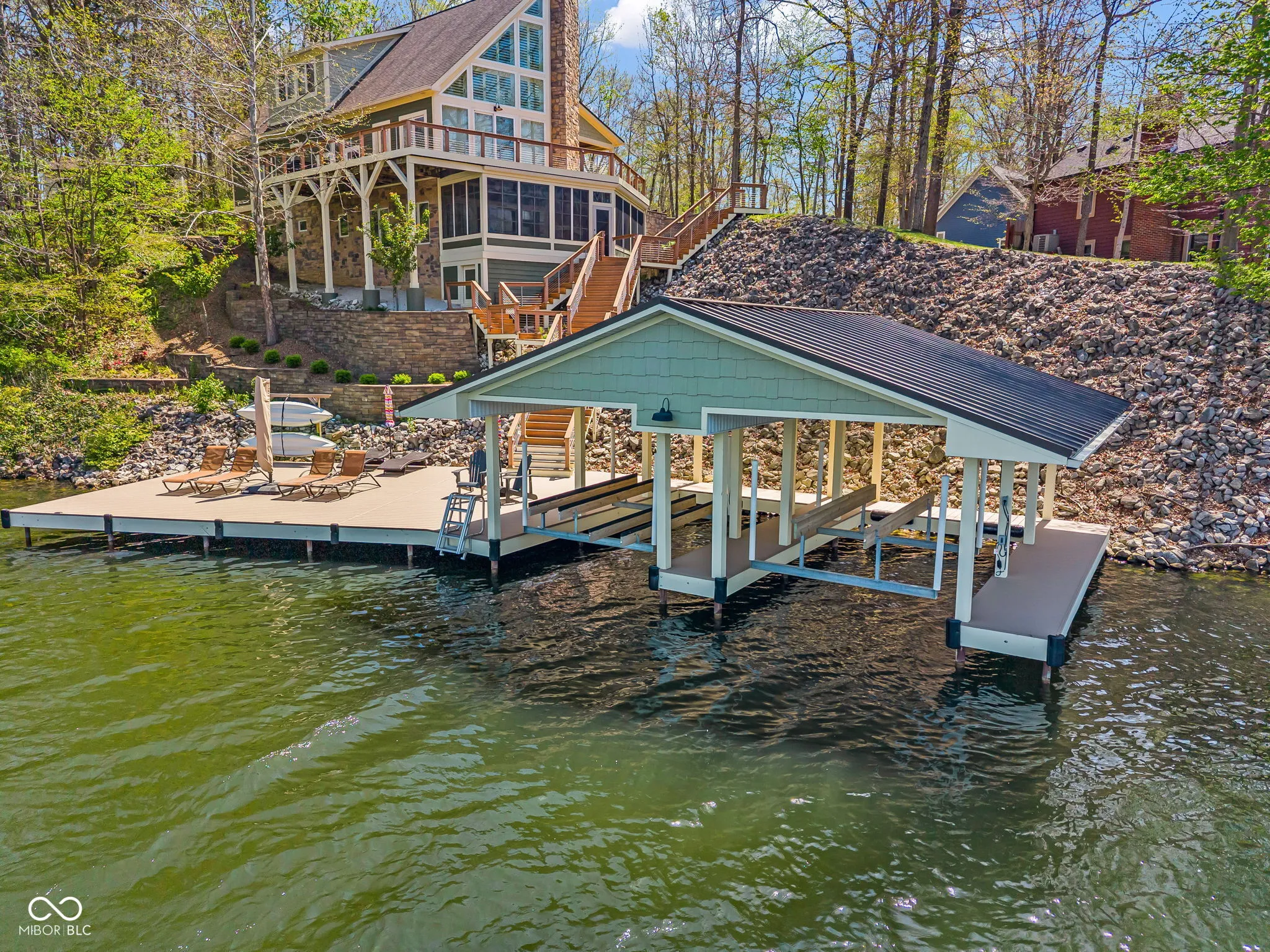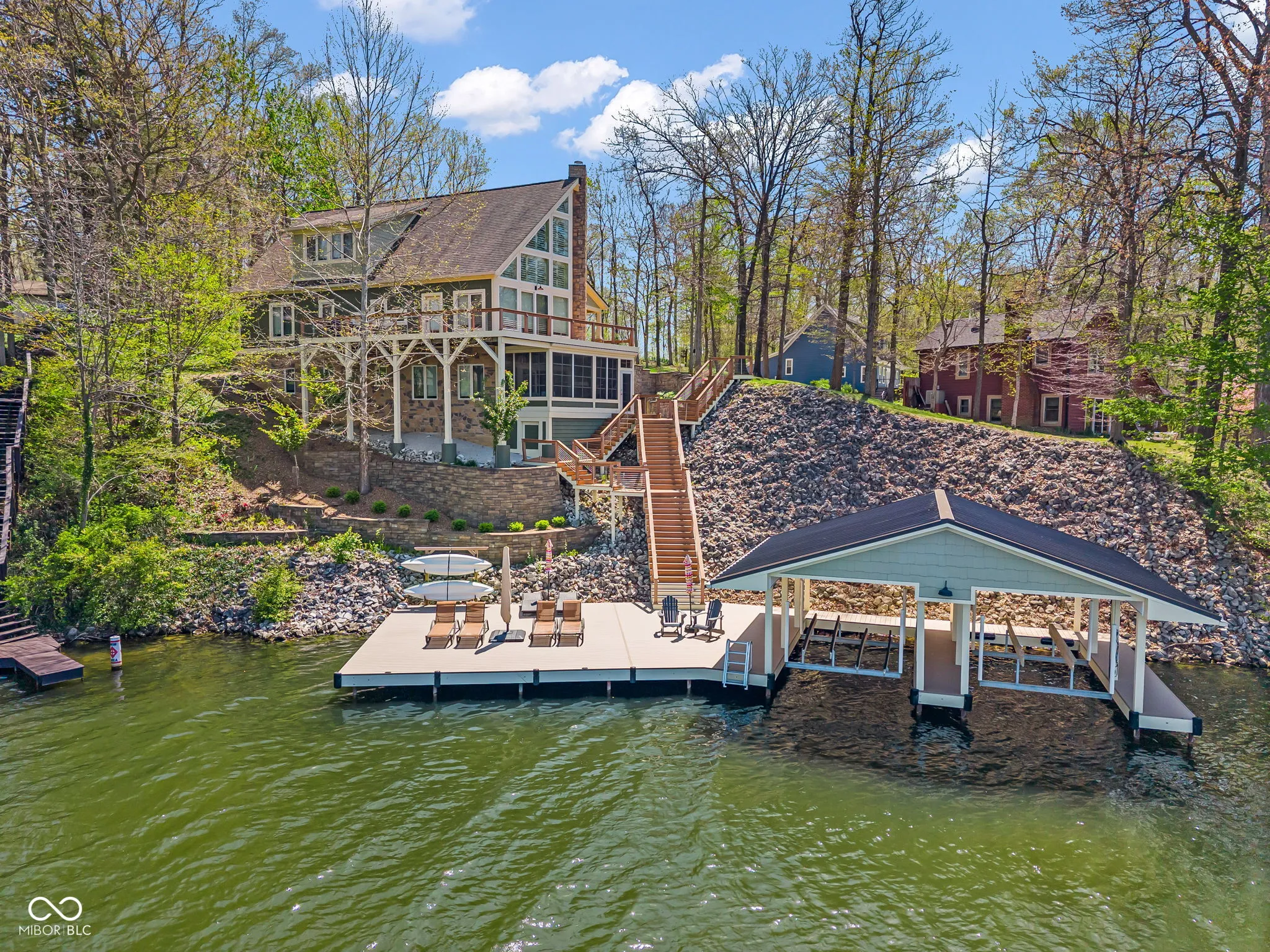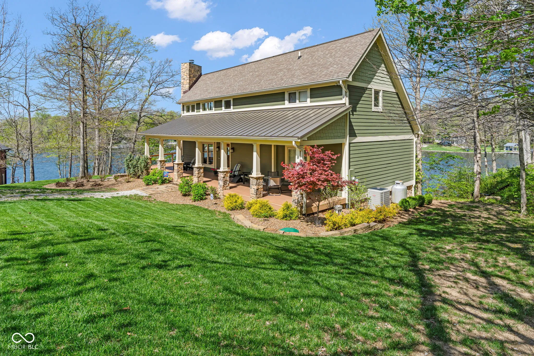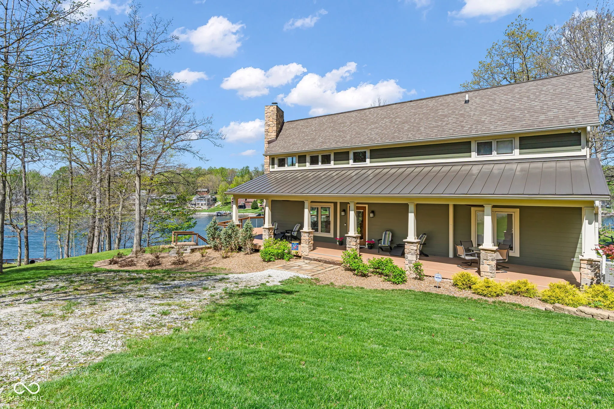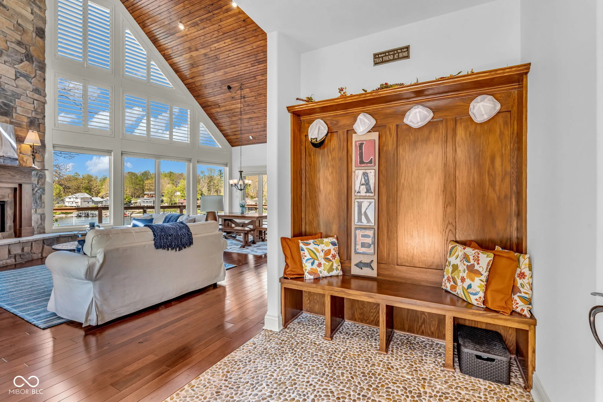 Welcome to 310 Victory Hill, an extraordinary custom-built lakefront home positioned on the main body of Heritage Lake. Offered for the first time, this one-owner residence features three levels of thoughtfully designed living with breathtaking water views throughout. A welcoming covered front porch sets the tone for relaxed lake living. Inside, you’re greeted by a custom boot bench and a stunning great room with vaulted wood slat ceilings, wood floors and expansive windows overlooking the lake. The kitchen is beautifully appointed with custom cabinetry, granite countertops, stainless steel appliances, and remote-controlled shutters for added convenience. The main level offers two generously sized bedrooms and a full bath with heated tile floors, double sinks, and a walk-in shower. Upstairs, the private primary suite includes an office nook, a spacious bedroom with incredible lake views, and a spa-like bath with a garden tub, separate cultured marble shower, double vanity, and heated tile floors. The fully finished walk-out lower level is ideal for entertaining or multi-generational living, featuring a large family room with custom lockers, a second full kitchen, additional bedroom, full bath with heated tile floors, and a screened-in patio with fireplace overlooking the water. A large laundry room and mechanical space complete the lower level. Outdoor living is unmatched with wraparound Trex deck for low-maintenance enjoyment and a newer dock with boathouse and lifts. This home is being offered fully furnished, including linens, housewares, and a pontoon,truly turnkey. Even the custom 16 ft. Christmas tree stays. A rare opportunity to own a premier lakefront property. Schedule your private showing today and experience lake living at its finest.
