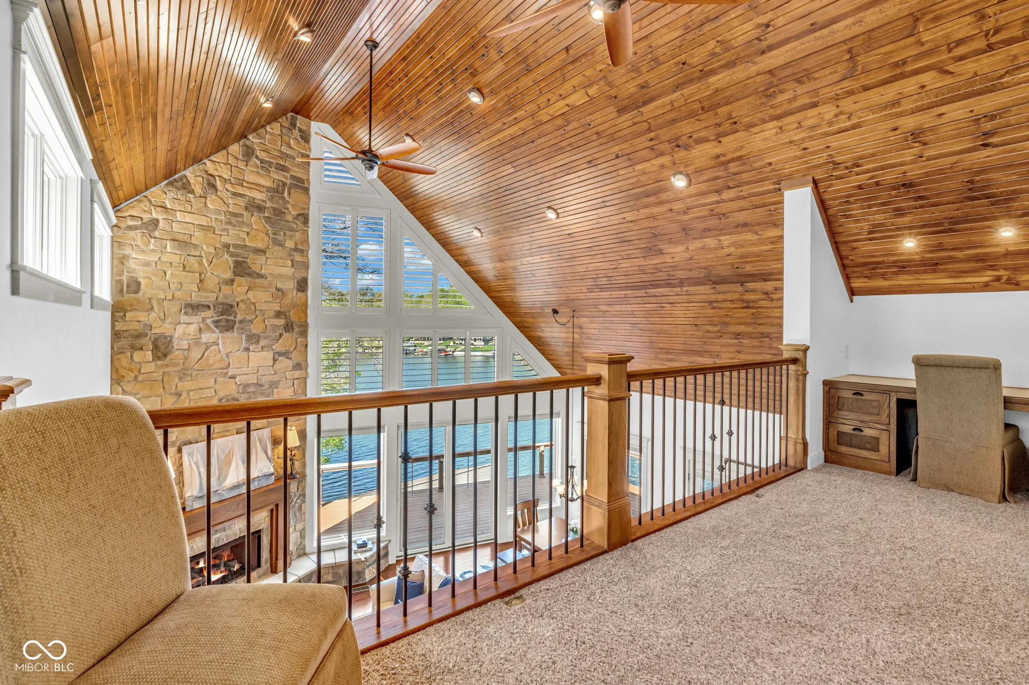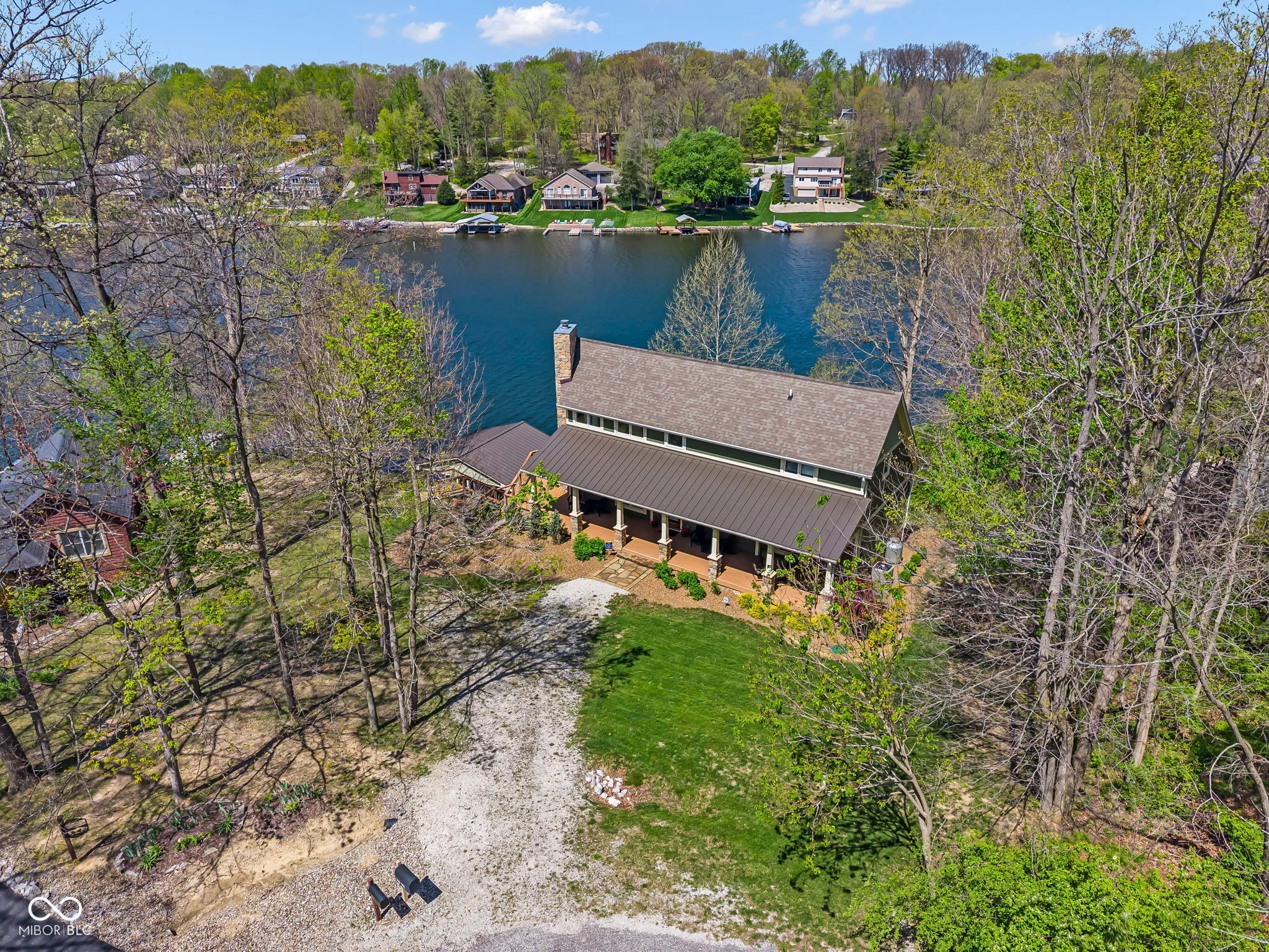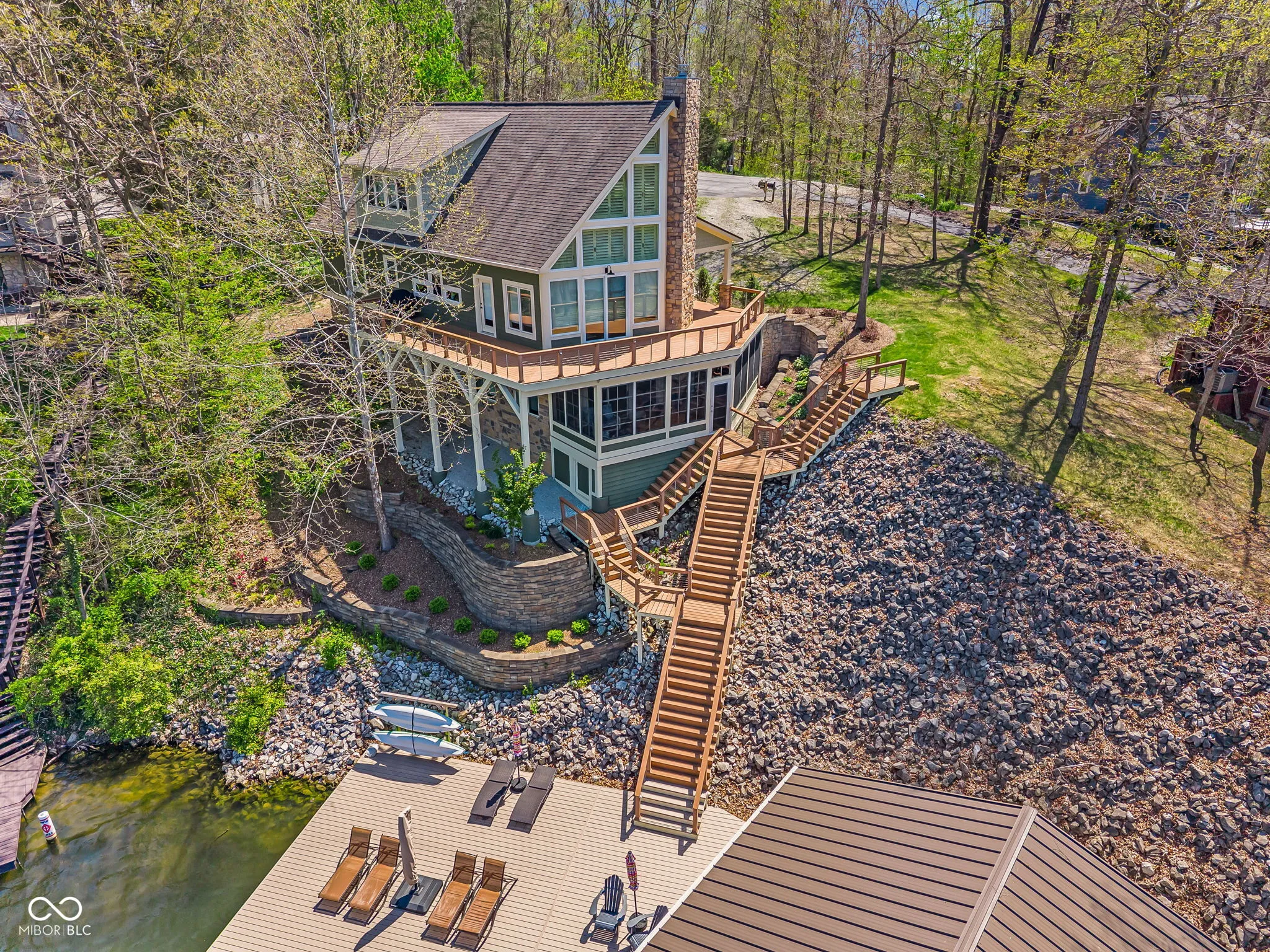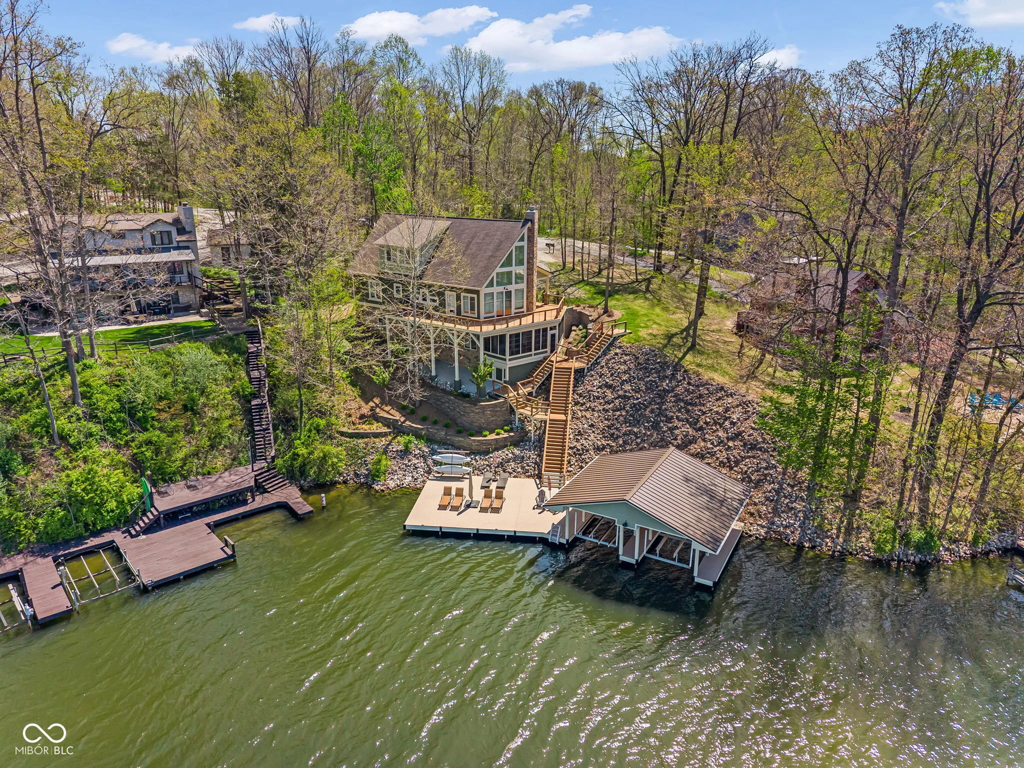 Welcome to 310 Victory Hill, an extraordinary custom-built lakefront home positioned on the main body of Heritage Lake. Offered for the first time, this one-owner residence features three levels of thoughtfully designed living with breathtaking water views throughout. A welcoming covered front porch sets the tone for relaxed lake living. Inside, you’re greeted by a custom boot bench and a stunning great room with vaulted wood slat ceilings, wood floors and expansive windows overlooking the lake. The kitchen is beautifully appointed with custom cabinetry, granite countertops, stainless steel appliances, and remote-controlled shutters for added convenience. The main level offers two generously sized bedrooms and a full bath with heated tile floors, double sinks, and a walk-in shower. Upstairs, the private primary suite includes an office nook, a spacious bedroom with incredible lake views, and a spa-like bath with a garden tub, separate cultured marble shower, double vanity, and heated tile floors. The fully finished walk-out lower level is ideal for entertaining or multi-generational living, featuring a large family room with custom lockers, a second full kitchen, additional bedroom, full bath with heated tile floors, and a screened-in patio with fireplace overlooking the water. A large laundry room and mechanical space complete the lower level. Outdoor living is unmatched with wraparound Trex deck for low-maintenance enjoyment and a newer dock with boathouse and lifts. This home is being offered fully furnished, including linens, housewares, and a pontoon,truly turnkey. Even the custom 16 ft. Christmas tree stays. A rare opportunity to own a premier lakefront property. Schedule your private showing today and experience lake living at its finest.