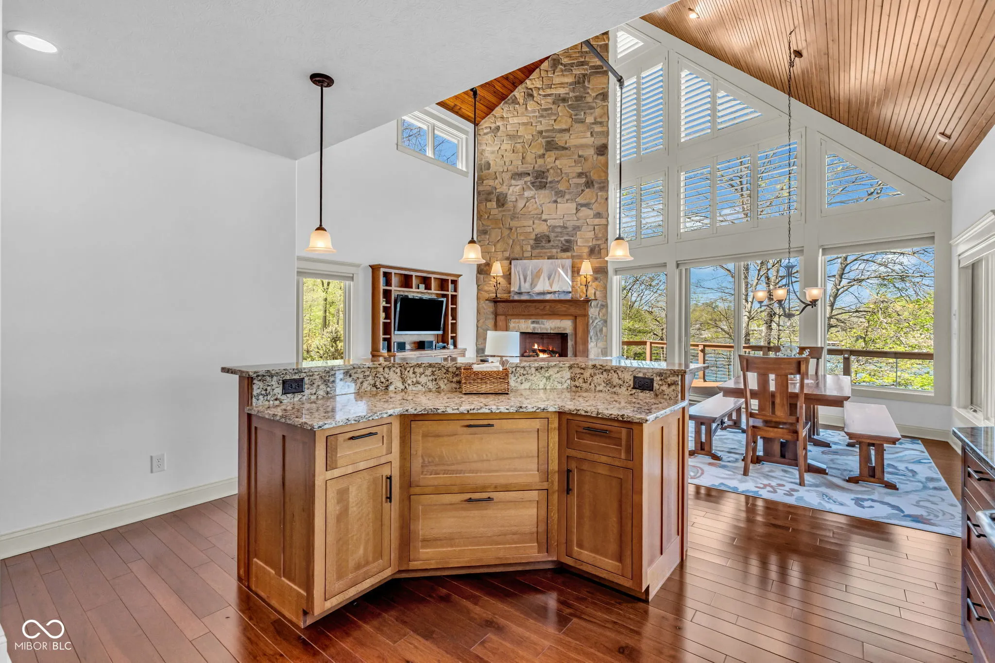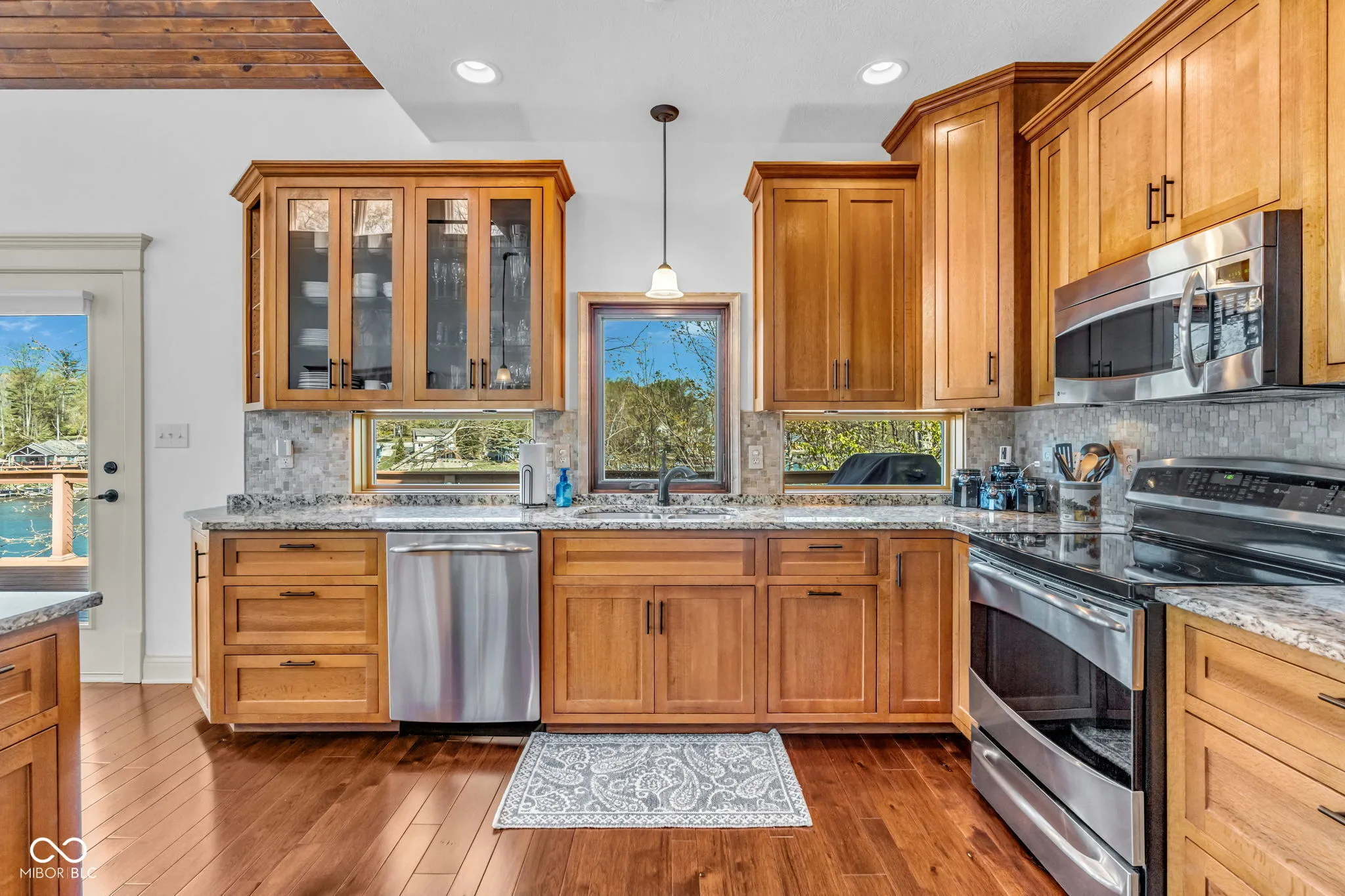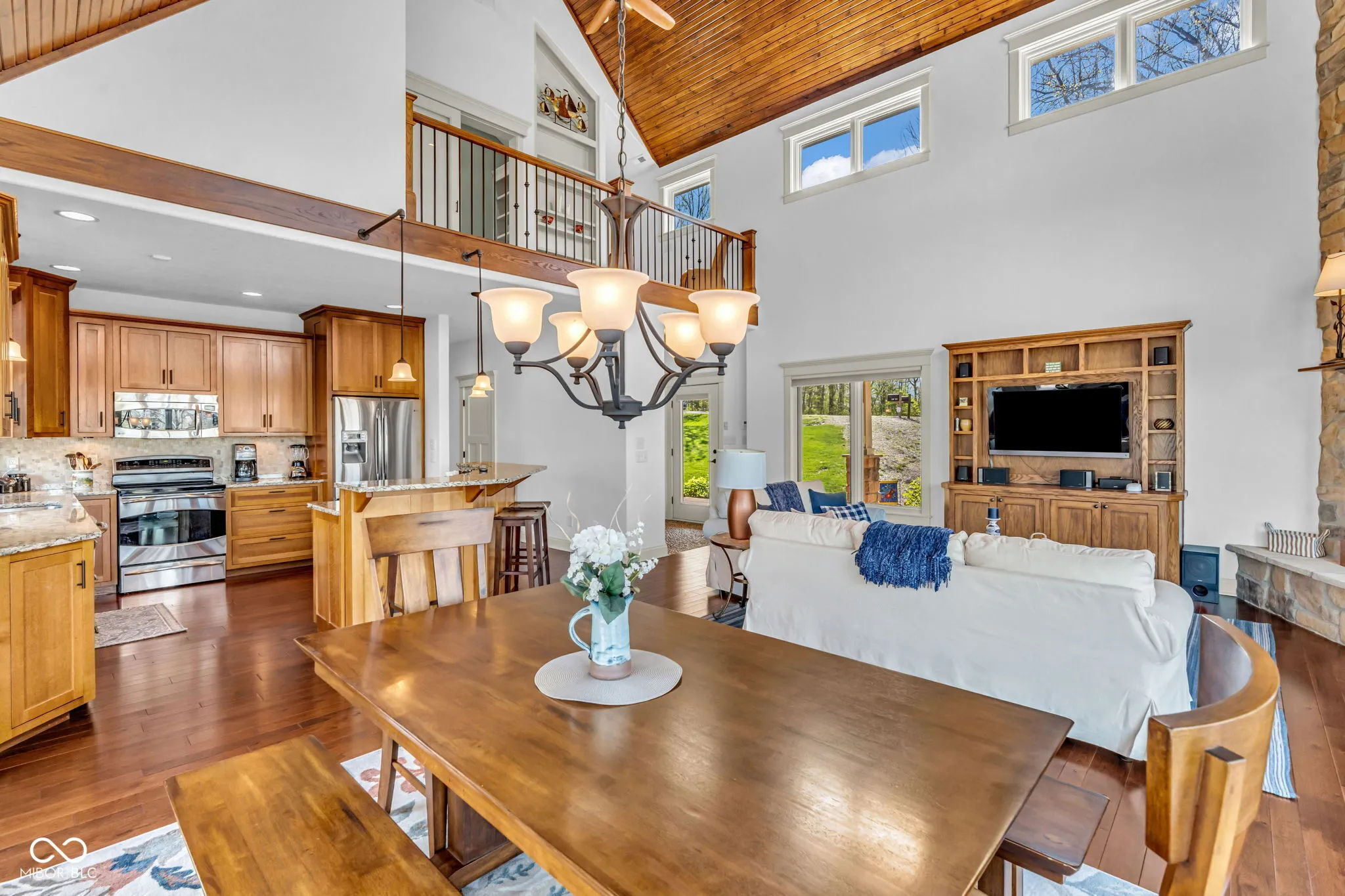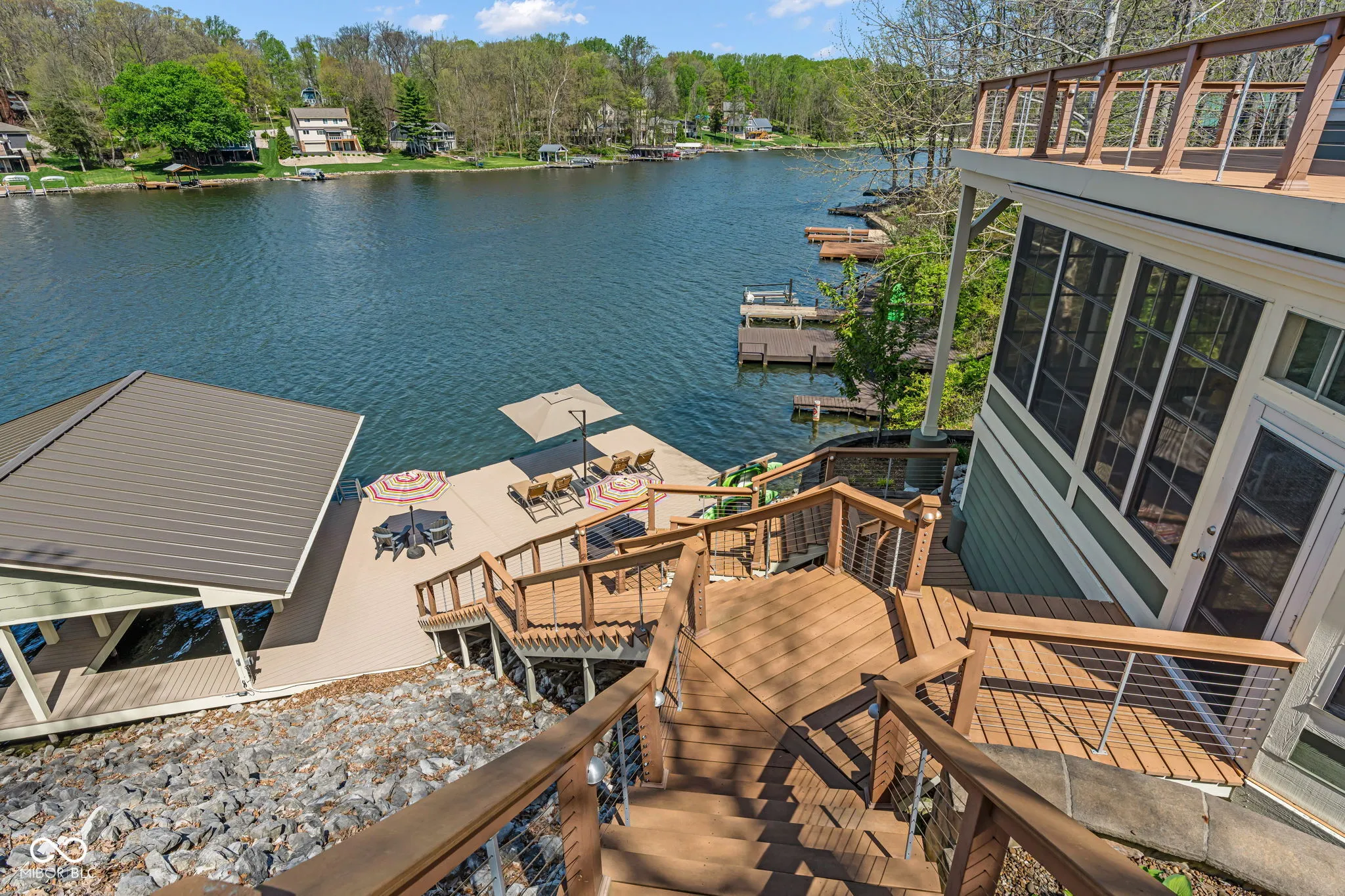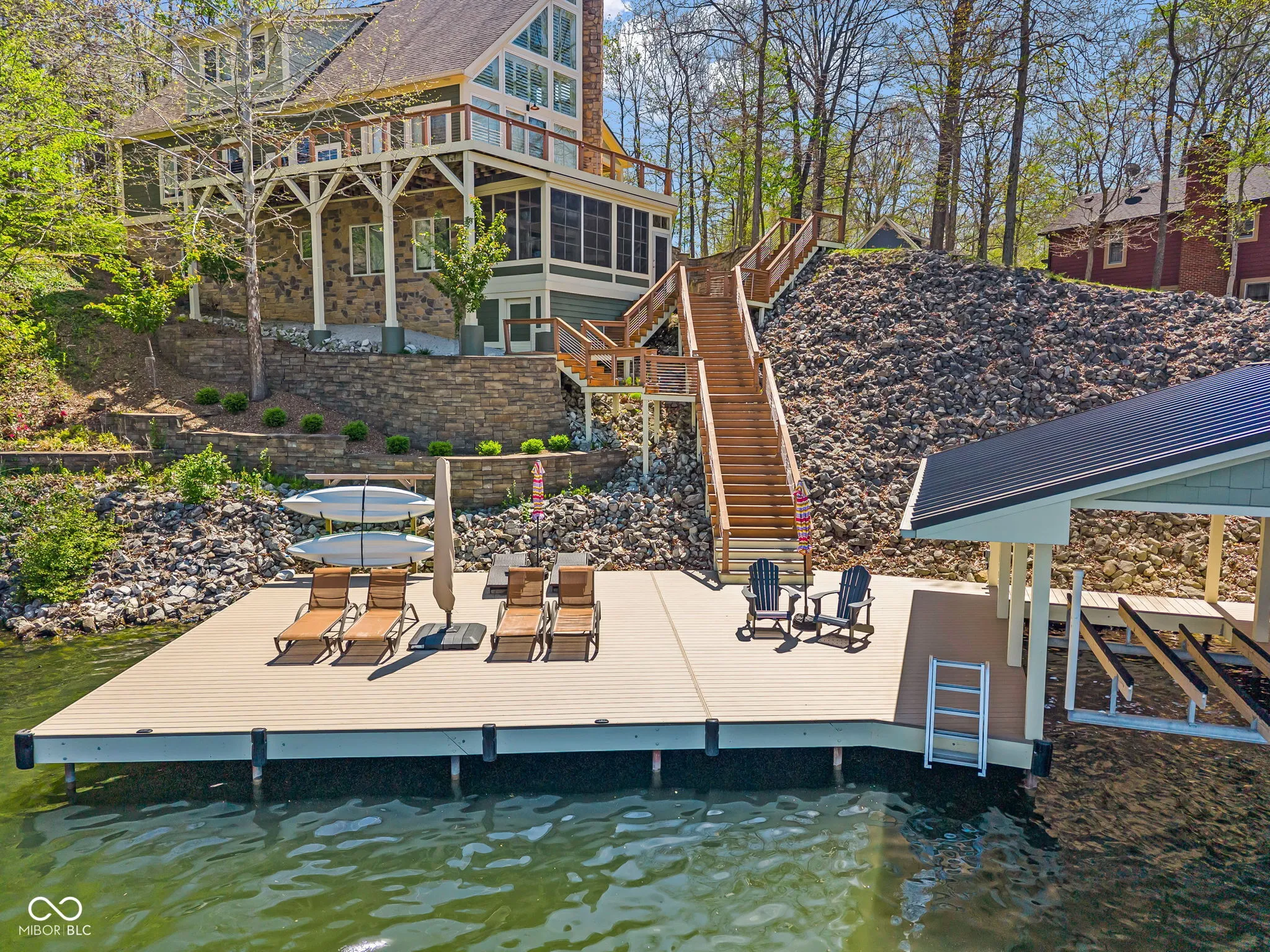 Welcome to 310 Victory Hill, an extraordinary custom-built lakefront home positioned on the main body of Heritage Lake. Offered for the first time, this one-owner residence features three levels of thoughtfully designed living with breathtaking water views throughout. A welcoming covered front porch sets the tone for relaxed lake living. Inside, you’re greeted by a custom boot bench and a stunning great room with vaulted wood slat ceilings, wood floors and expansive windows overlooking the lake. The kitchen is beautifully appointed with custom cabinetry, granite countertops, stainless steel appliances, and remote-controlled shutters for added convenience. The main level offers two generously sized bedrooms and a full bath with heated tile floors, double sinks, and a walk-in shower. Upstairs, the private primary suite includes an office nook, a spacious bedroom with incredible lake views, and a spa-like bath with a garden tub, separate cultured marble shower, double vanity, and heated tile floors. The fully finished walk-out lower level is ideal for entertaining or multi-generational living, featuring a large family room with custom lockers, a second full kitchen, additional bedroom, full bath with heated tile floors, and a screened-in patio with fireplace overlooking the water. A large laundry room and mechanical space complete the lower level. Outdoor living is unmatched with wraparound Trex deck for low-maintenance enjoyment and a newer dock with boathouse and lifts. This home is being offered fully furnished, including linens, housewares, and a pontoon,truly turnkey. Even the custom 16 ft. Christmas tree stays. A rare opportunity to own a premier lakefront property. Schedule your private showing today and experience lake living at its finest.