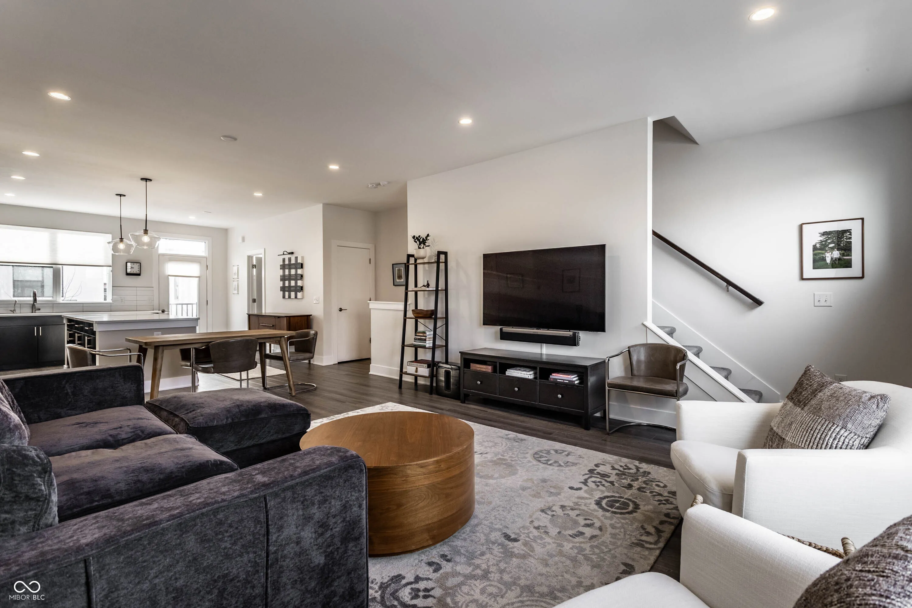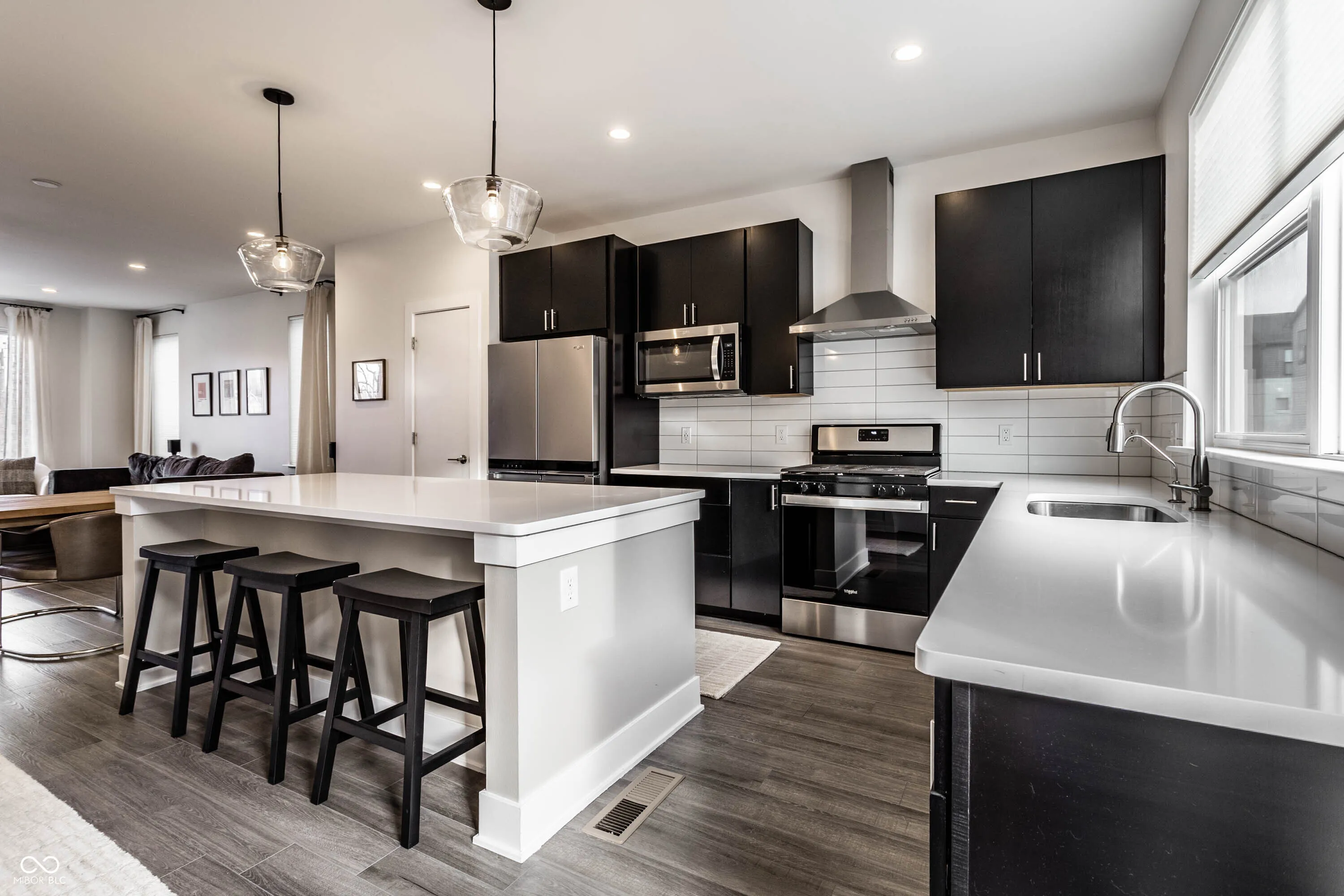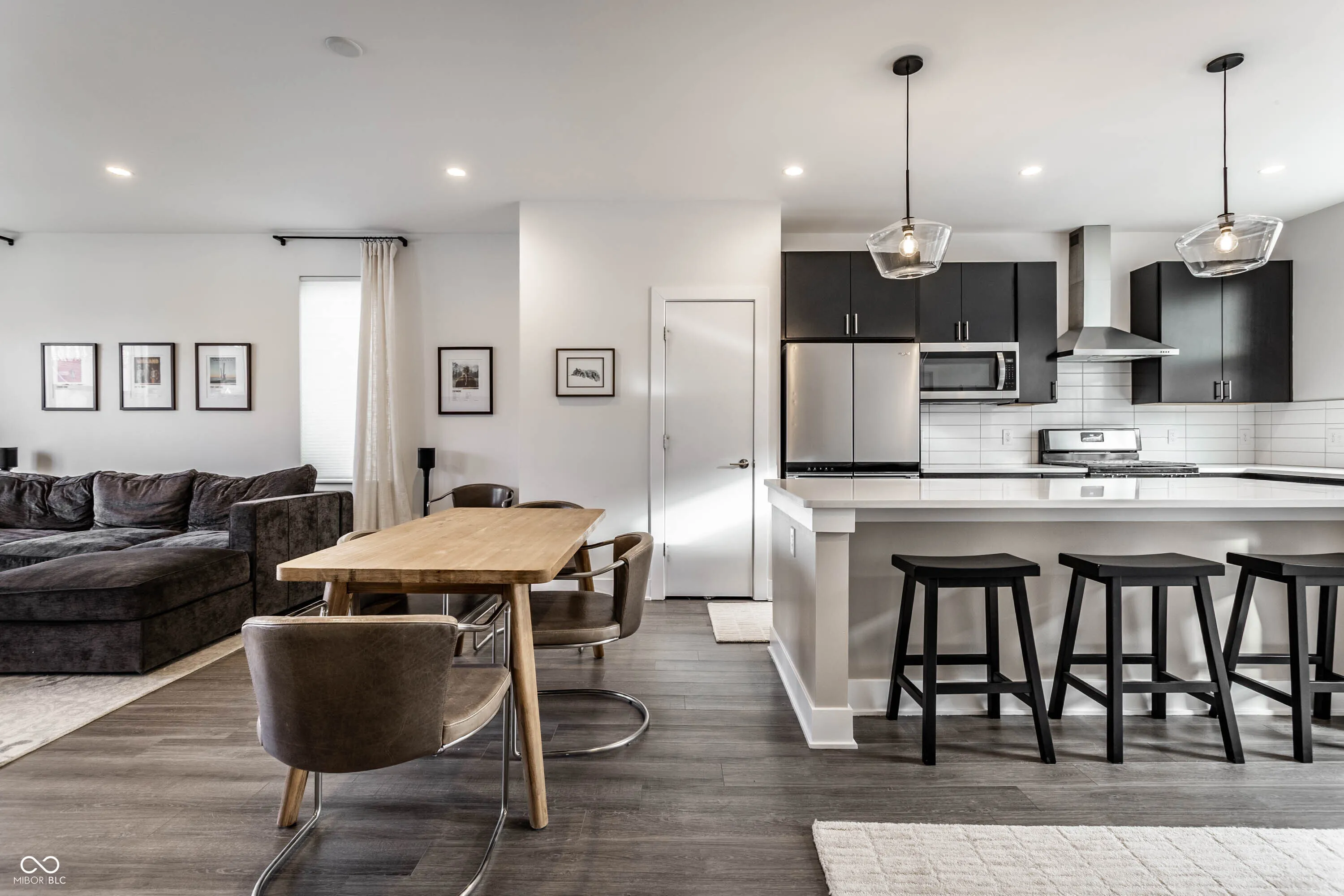 Welcome to easy downtown living in this stunning end-unit townhome, built in 2021 and filled with natural light throughout. Thoughtfully designed with both everyday living and entertaining in mind, this move-in ready home offers an open-concept layout, spacious dining area, and a gorgeous chef’s kitchen featuring a large breakfast bar and an abundance of storage. Enjoy seamless indoor-outdoor living with a covered front patio and an upper-level deck-perfect for morning coffee or hosting guests. The main level also features a versatile office space that can easily be converted into a third bedroom. Upstairs, you’ll find well-appointed bedrooms along with the convenience of a laundry room on the same level. Additional upgrades include custom blinds throughout, a water softener, reverse osmosis system, custom closet installation, and added storage solutions. A rare two-car attached garage, plus access to beautifully maintained common outdoor entertaining spaces, make this home as functional as it is stylish. Located just steps from Bottleworks District, Mass Ave, Tinker Street, Foundry Provisions, and all that downtown has to offer-this is truly downtown living at its best.