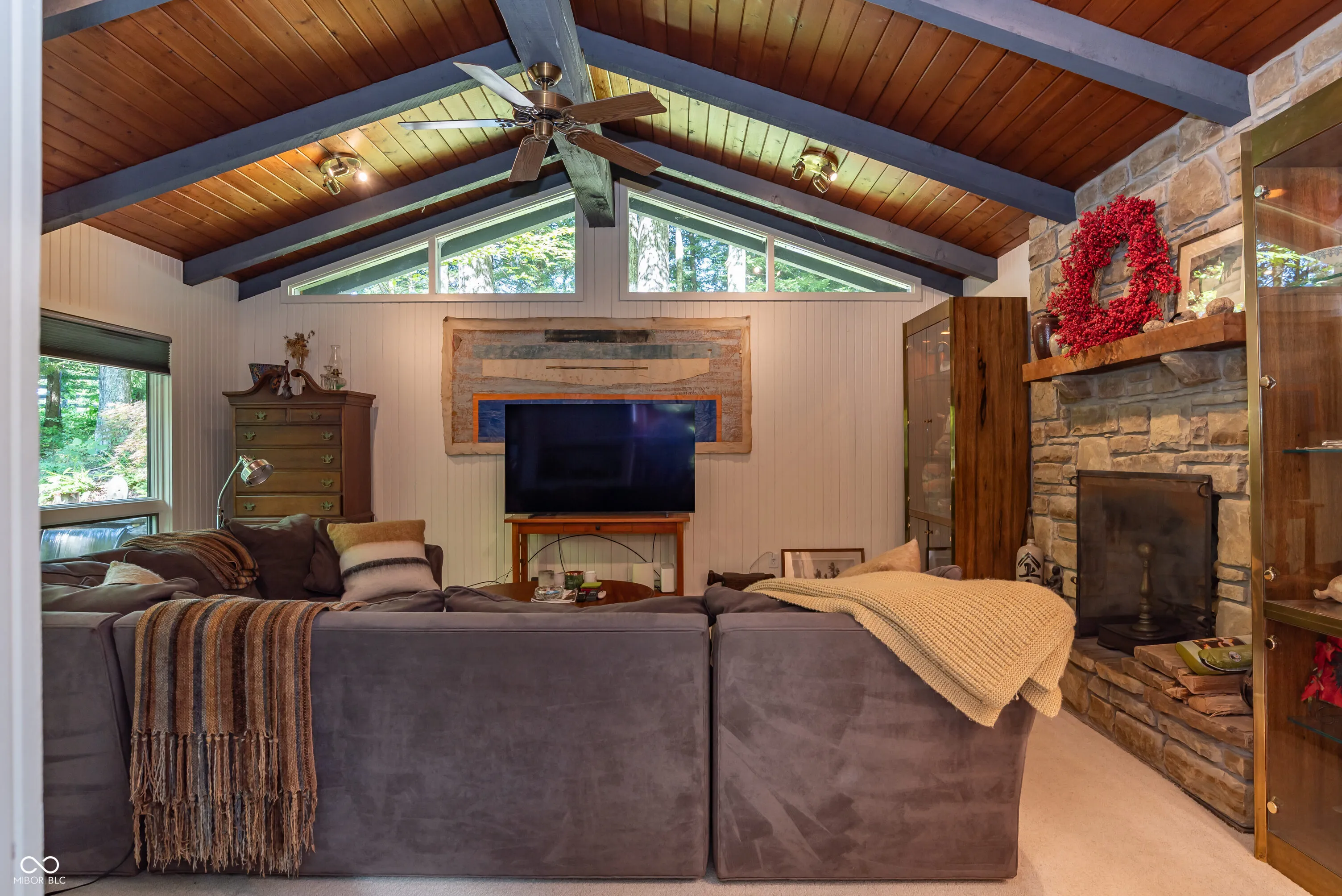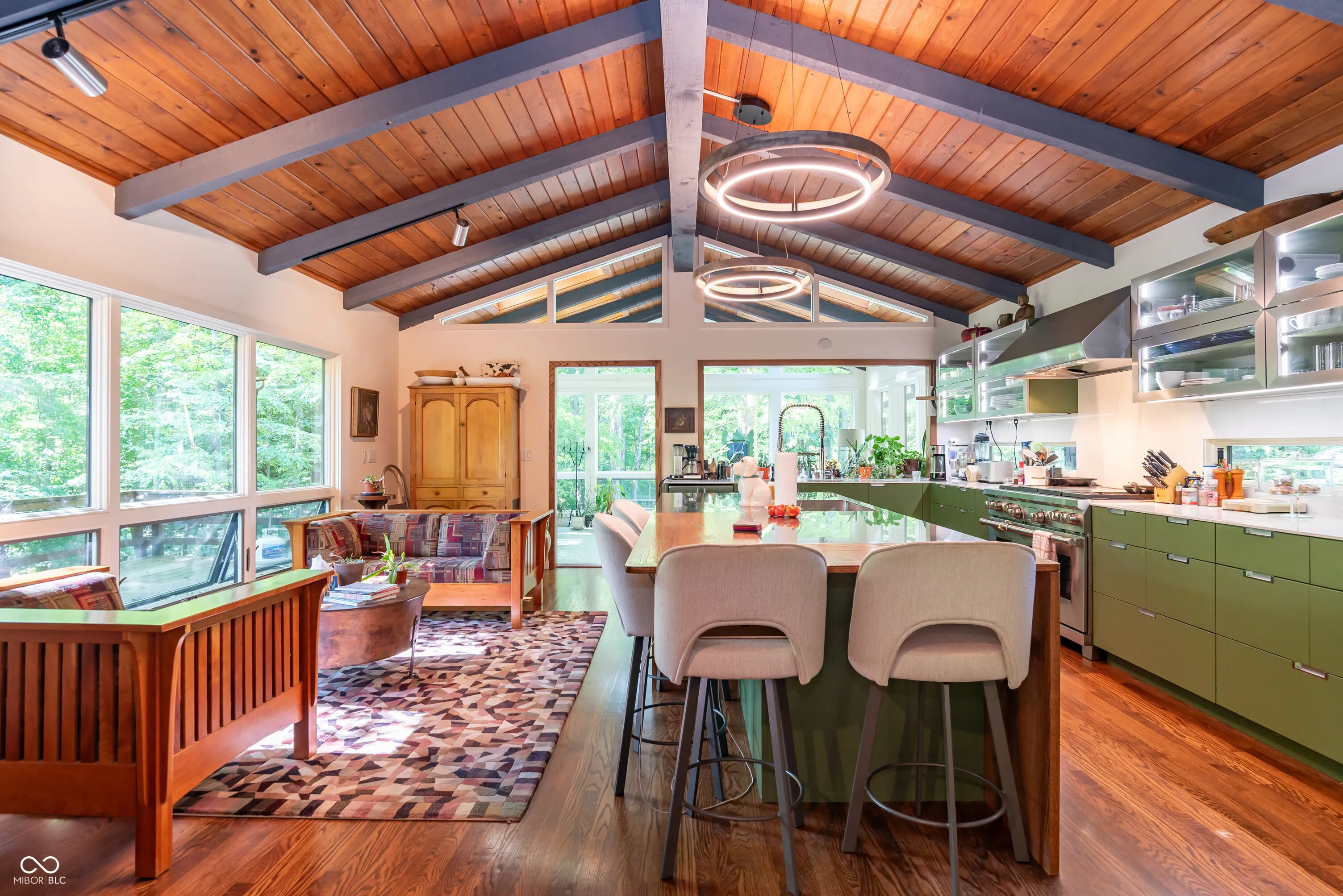Welcome to your private woodland preserve. This 16 acre property with a beautiful pond and mature hardwoods creates a sanctuary that will be hard to ever leave. Current owner has relished living here for 5 years but now have to move for health reasons. The renovations began in 2019 and took nearly a year to complete. Practically every component of the home was replaced…electrical, plumbing, HVAC, windows, doors, all flooring including custom red oak and much, much more. Kitchen has been completely remade with fantastic custom cabinets and counter tops by Stoll Brothers (Odon, IN). The top of the line appliances – 48″ Wolf duel fuel range with griddle and grill tops plus 4 gas burners. A full sized Wolf range hood, Cove Dishwasher, 48″ Sub-zero side/side refrigerator, 2 sinks each with a disposal, under counter wine refrigerator and a retracting under counter microwave oven. There are many built-in refinements in the cabinets, and the space boasts amazing storage and work areas. The Brown County stone fireplace has been cleaned, parged, and a new cap installed…ready for your fall fires, and is also gas ready. The home was built in 1975 with huge timbers throughout the main floor. The soaring ceilings make a wonderful space accentuated by the huge expanses of insulated glass. The new stain colors give the spaces a warmth and glow. The obscured glass in the doors allows additional light to pass throughout the home. There is room for a 4th bedroom to be finished. Sunroom is equipped with minisplit unit and heated floors. There is also an 800 square foot building which has been heavily insulated with hard foam and layers of drywall! It is easily heated and cooled with a minisplit. The secondary building has water hooked up to it, but no plumbing. There is a professionally designed landscape plan which encompasses the entire property and the design was executed last year by Mother Nature Landscaping with phenomenal materials.