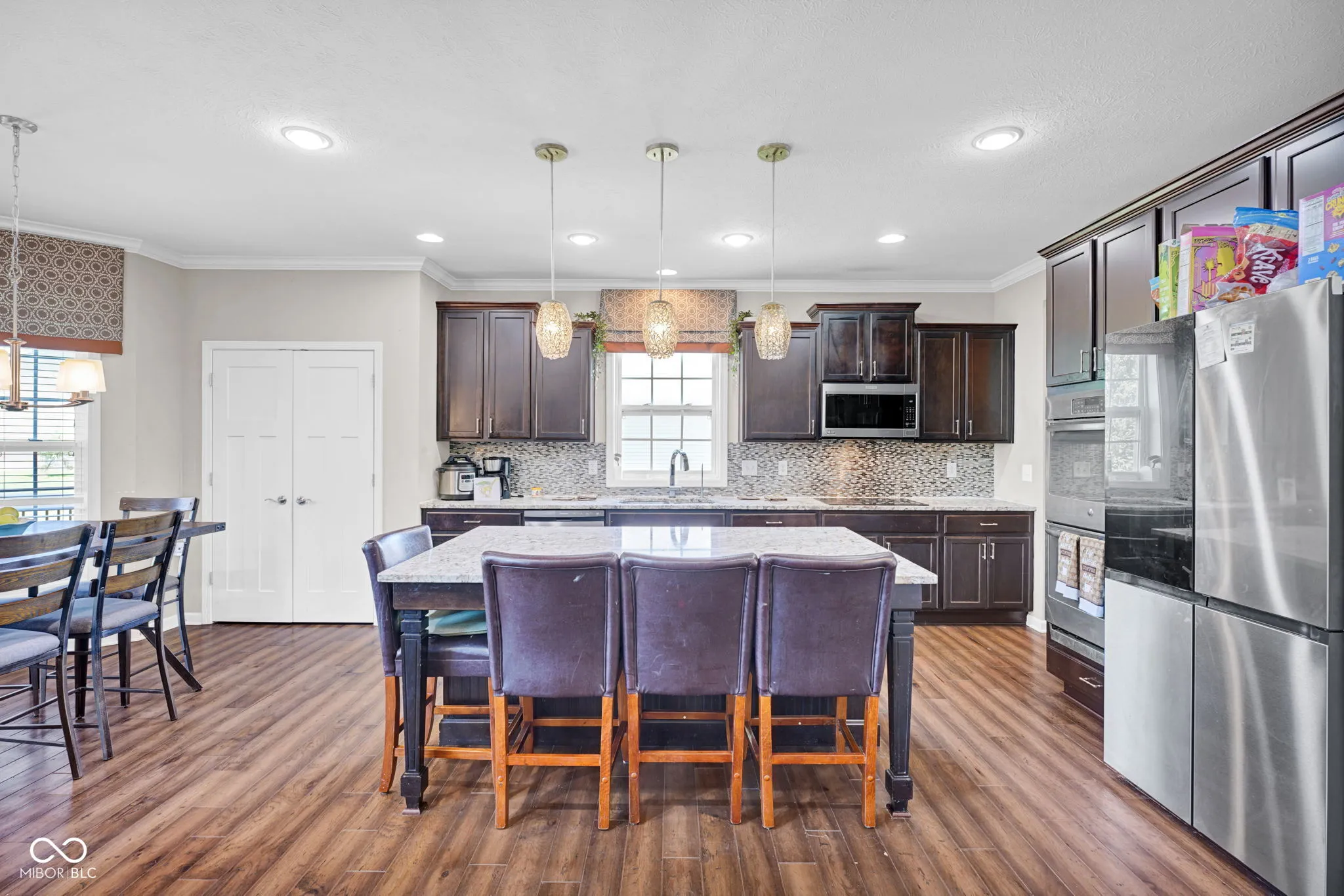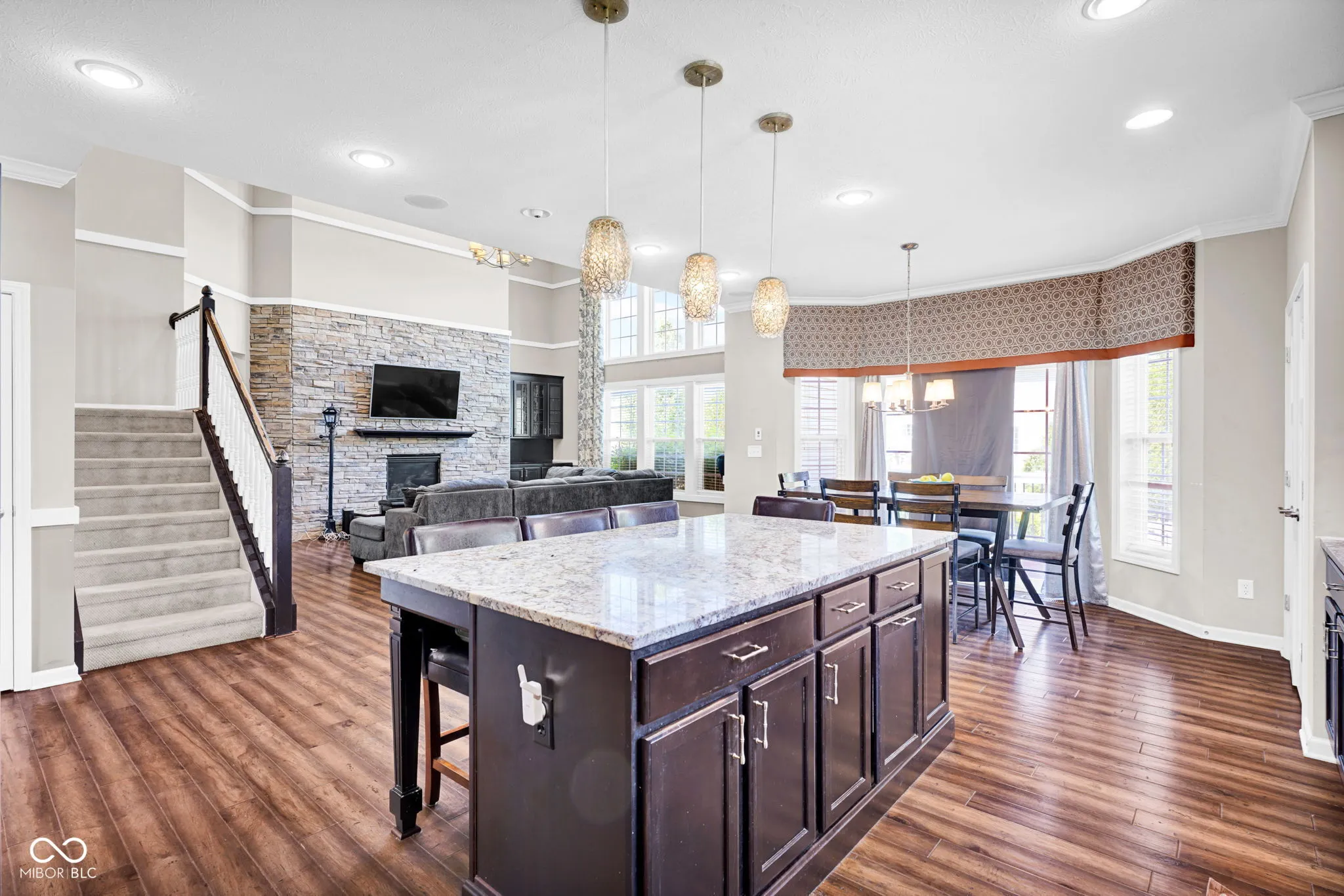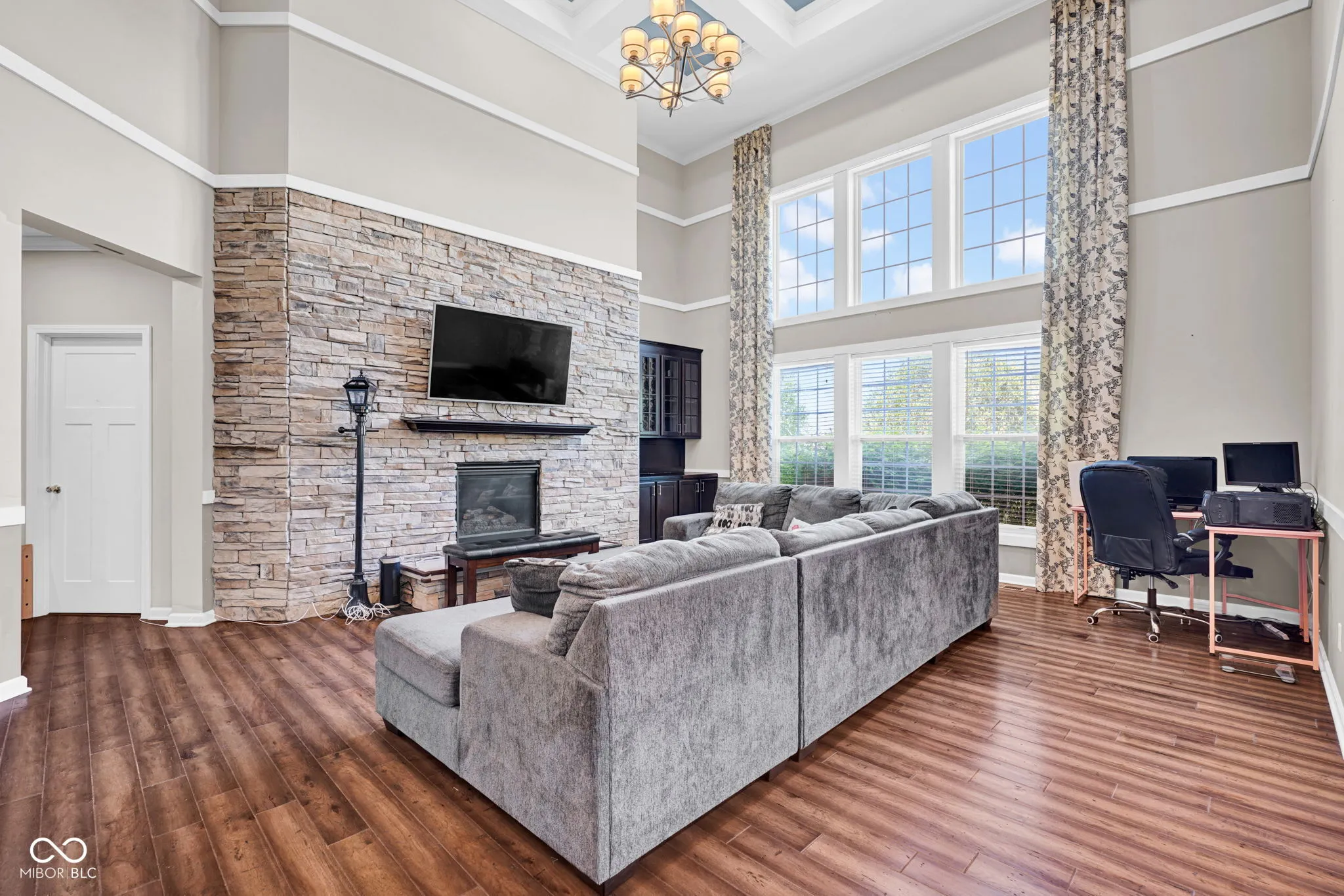 Welcome home! At the heart is undoubtedly the kitchen, a culinary haven designed for both everyday meals and entertaining. It features a double oven, elegant stone counters, and a spacious island with a sink, all flowing openly into the living space. The the 2-story living room is filled natural light and an impressive coffered ceiling, creating a space perfect for relaxation or social gatherings. The primary bathroom offers a spa-like experience. Featuring a double vanity and a walk-in shower, complete with multiple shower heads and a luxurious rainfall shower, promising a rejuvenating start or end to your day. Work from home in the office. The interior extends to the basement with a rec/play space and exercise room. Beyond the interior, the property extends its living spaces outdoors with a welcoming patio and a covered front porch. A fire pit provides an inviting focal point for evening gatherings. This home also includes a 3-car garage. With its thoughtful design and desirable features, inviting you to experience a life of comfort and elegance, this must be the place!