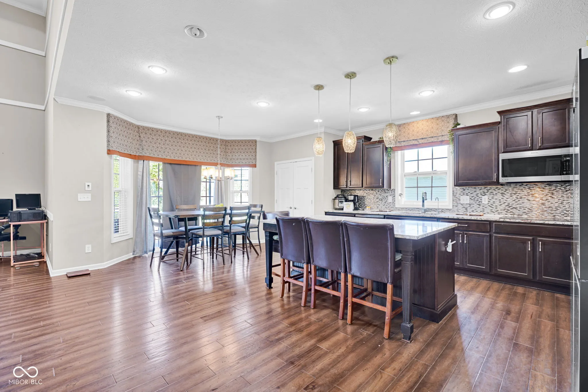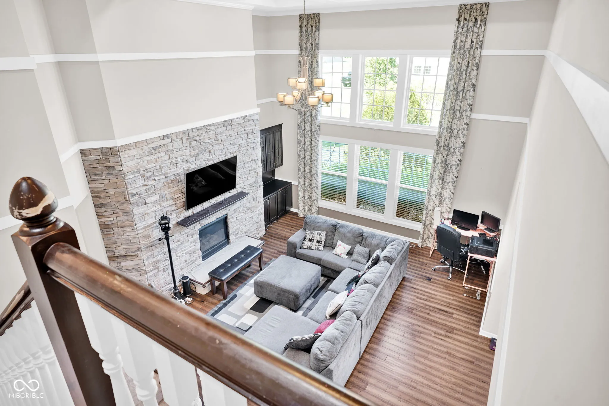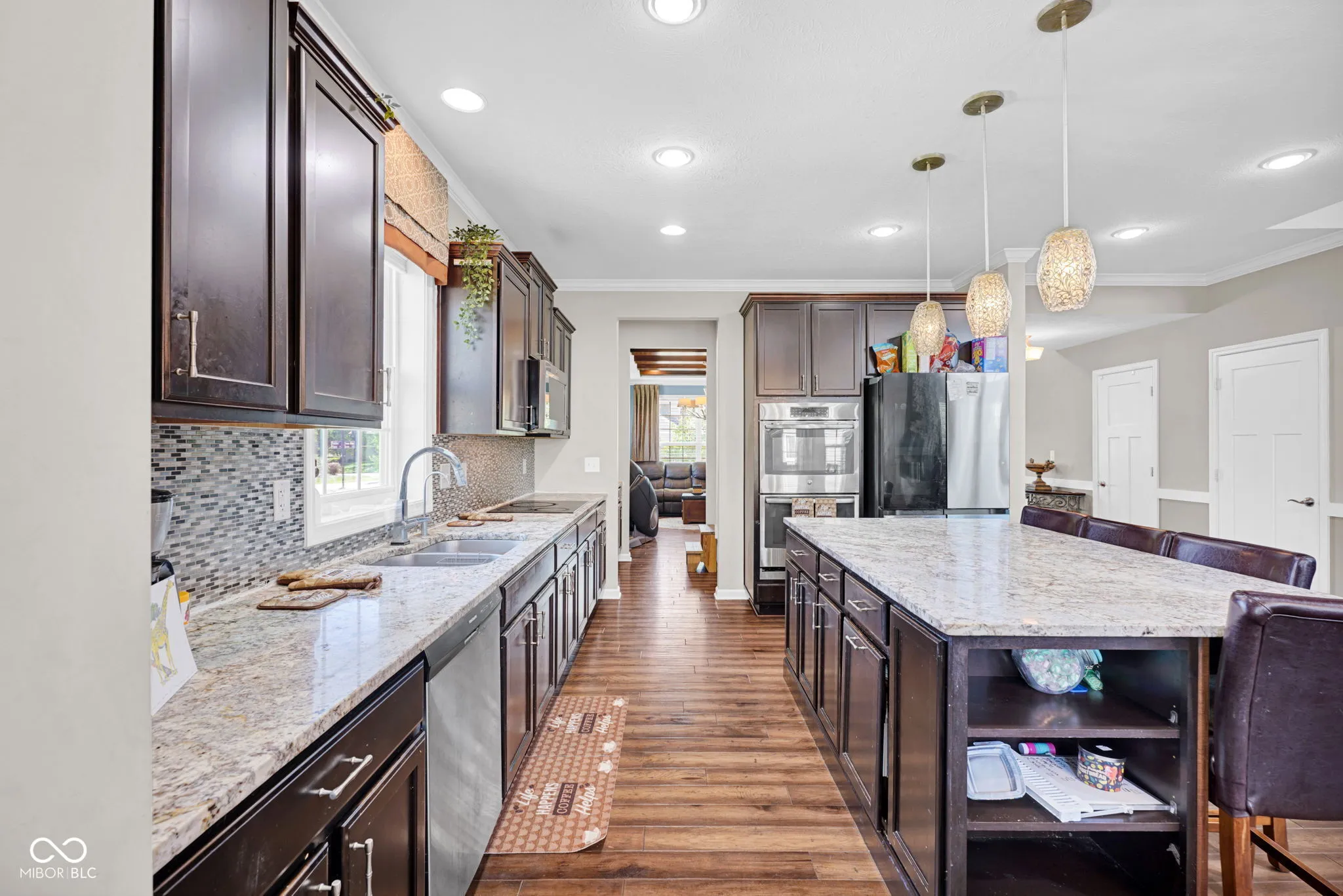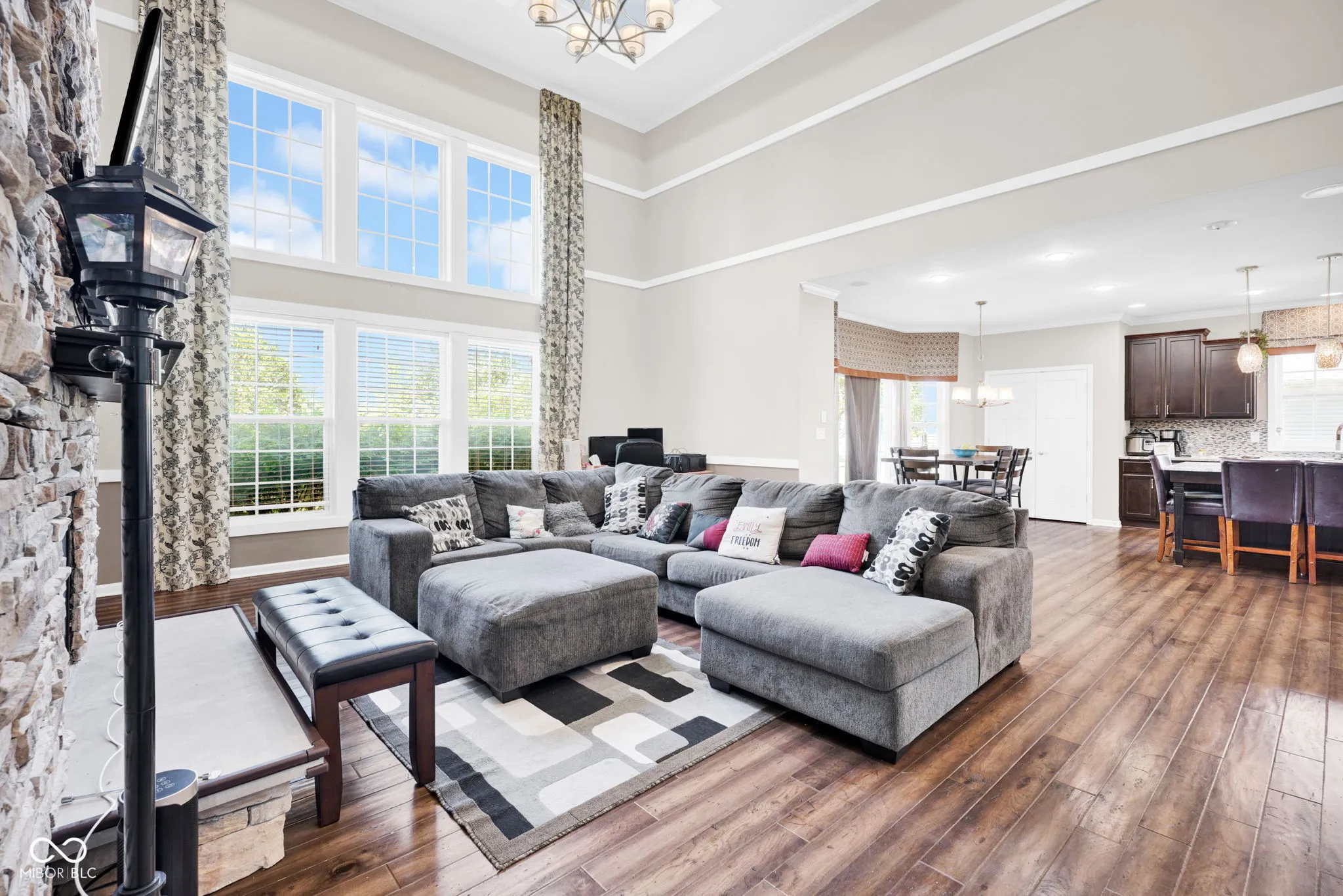 Welcome home! At the heart is undoubtedly the kitchen, a culinary haven designed for both everyday meals and entertaining. It features a double oven, elegant stone counters, and a spacious island with a sink, all flowing openly into the living space. The the 2-story living room is filled natural light and an impressive coffered ceiling, creating a space perfect for relaxation or social gatherings. The primary bathroom offers a spa-like experience. Featuring a double vanity and a walk-in shower, complete with multiple shower heads and a luxurious rainfall shower, promising a rejuvenating start or end to your day. Work from home in the office. The interior extends to the basement with a rec/play space and exercise room. Beyond the interior, the property extends its living spaces outdoors with a welcoming patio and a covered front porch. A fire pit provides an inviting focal point for evening gatherings. This home also includes a 3-car garage. With its thoughtful design and desirable features, inviting you to experience a life of comfort and elegance, this must be the place!