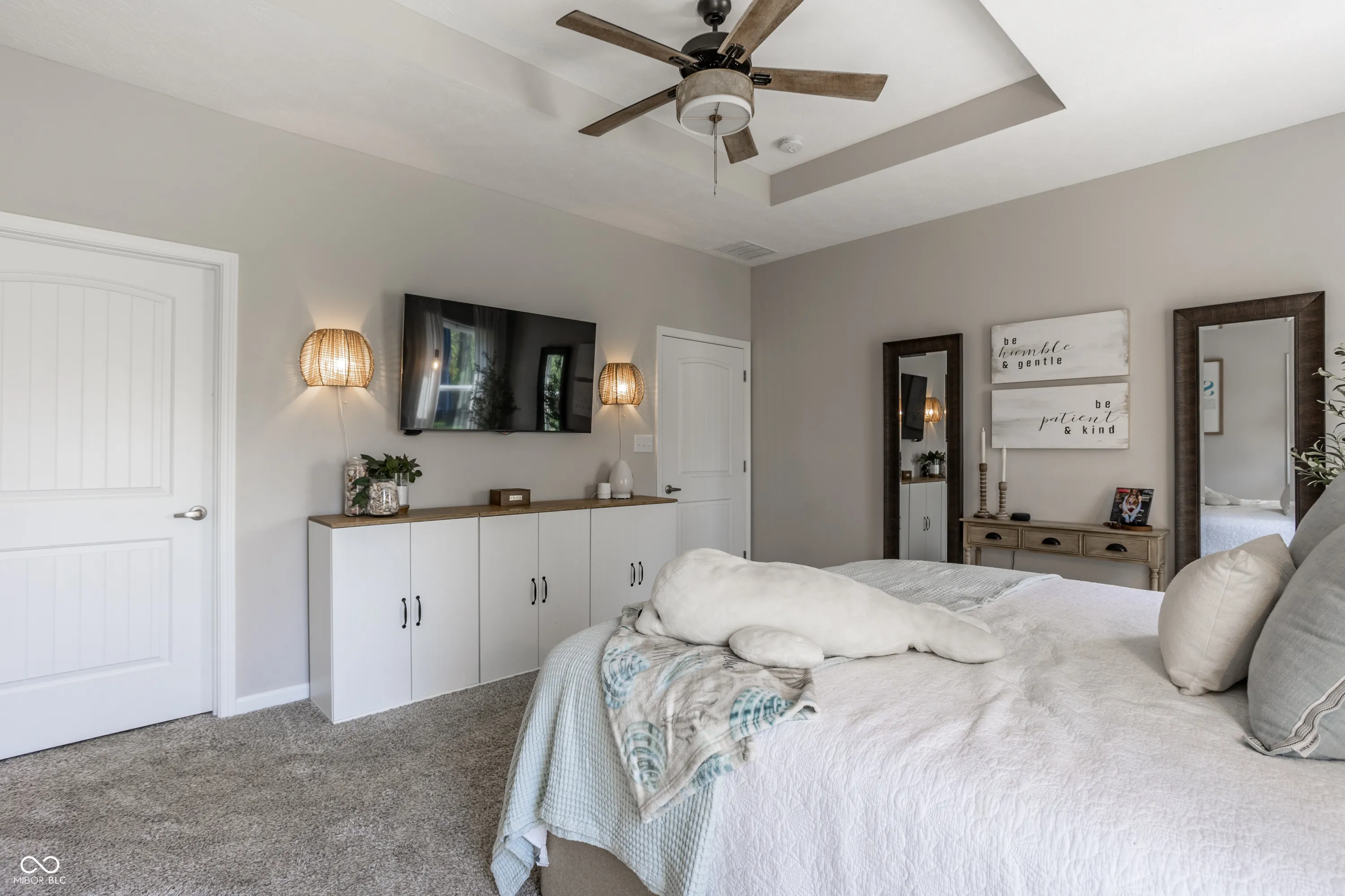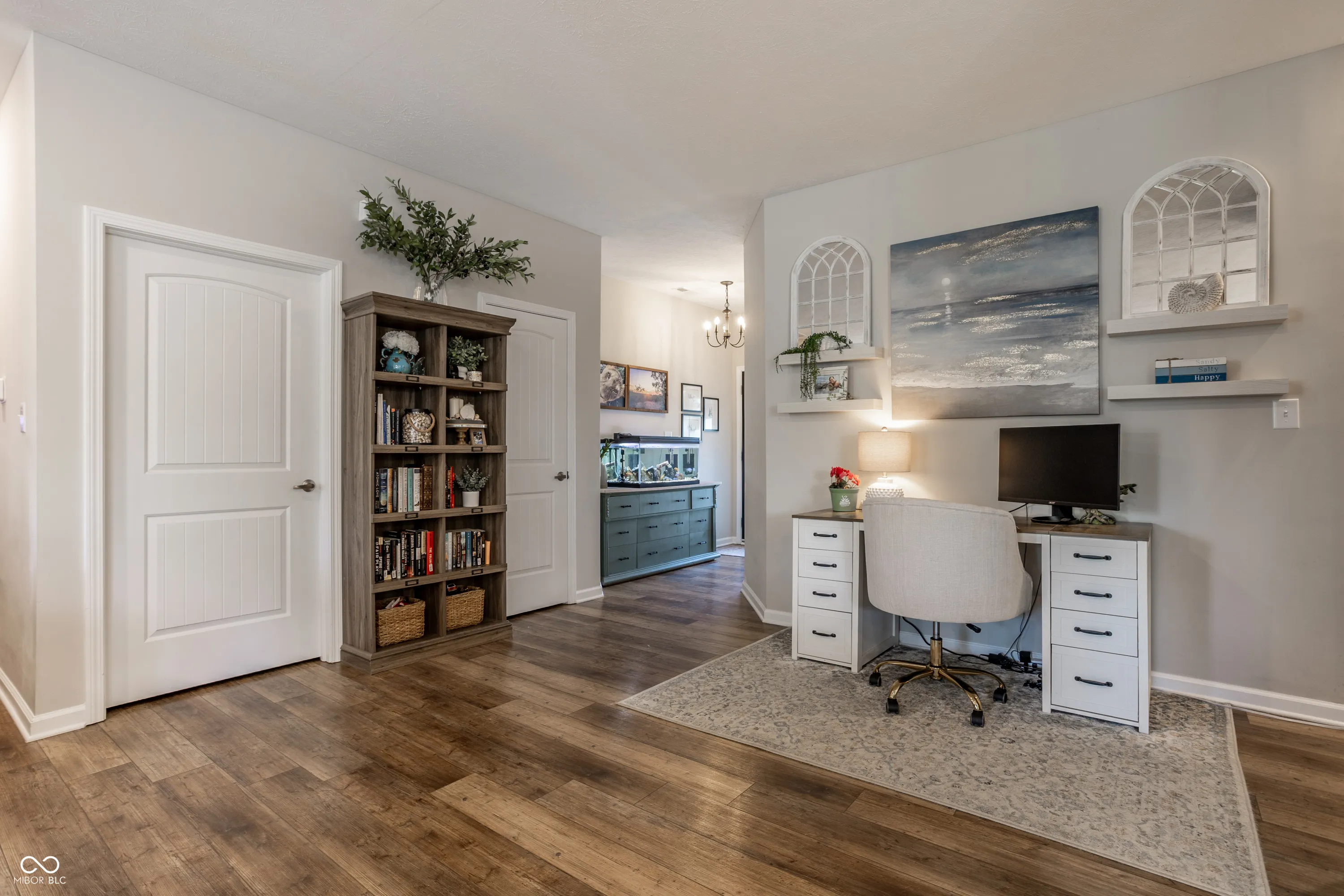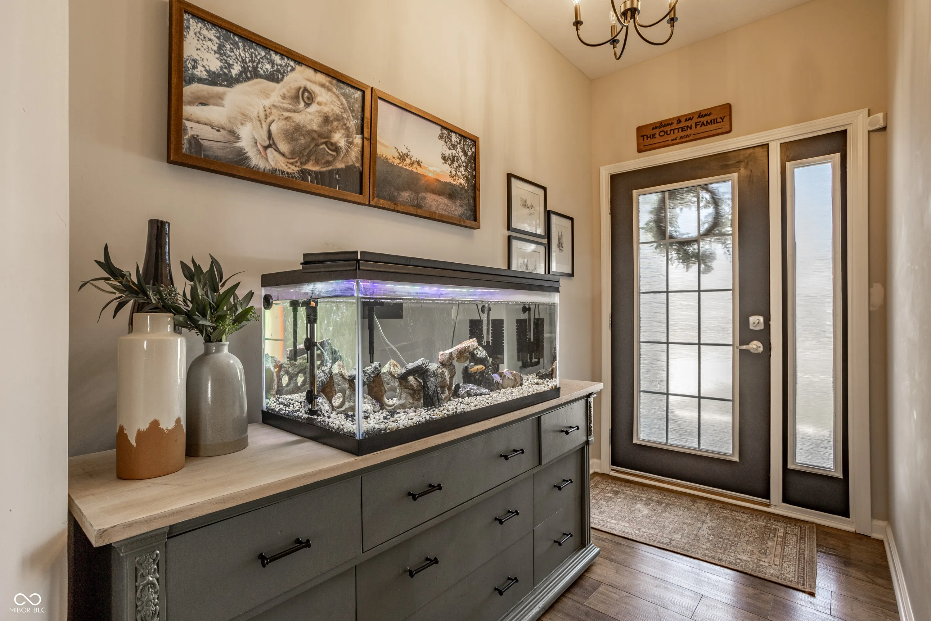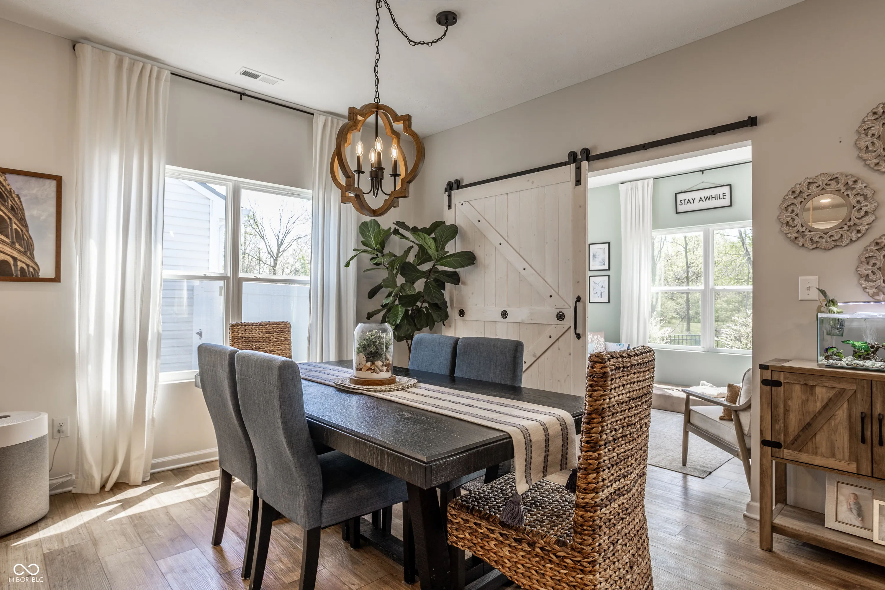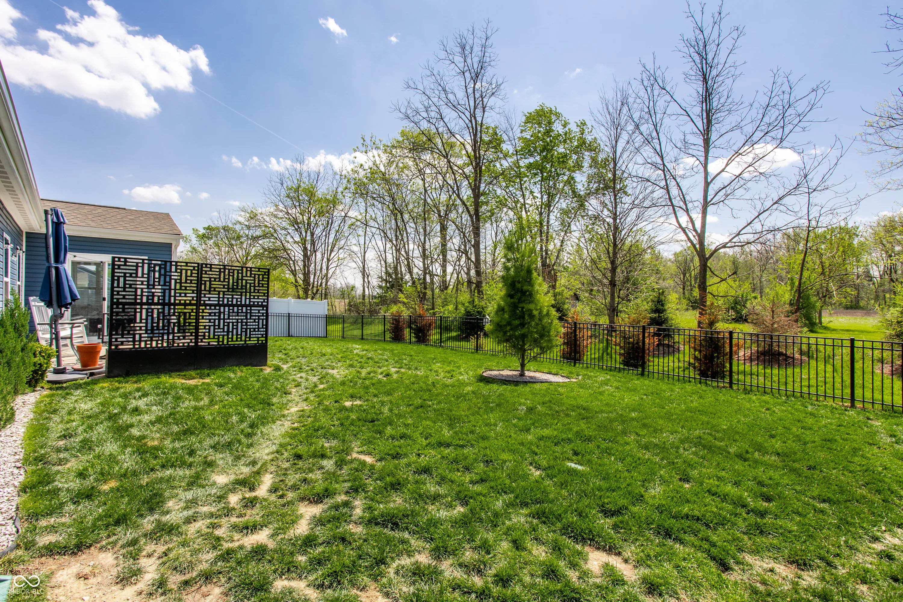 Welcome home to this beautifully designed and updated 2023-built home located just 9 minutes from Hamilton Town Center. Offering the feel of new construction without the wait, this one-level home in Estes Park features 3 bedrooms, 2 full bathrooms, approximately 1,856 sq. ft., an open-concept layout, and a cozy sunroom filled with natural light. The spacious kitchen includes quartz countertops, a large center island with seating, stainless steel appliances, subway tile backsplash, abundant cabinetry, and stylish designer lighting. The open dining and living areas feature abundant natural light, updated fixtures, shiplap-style accent details, barn-style doors, and a functional layout designed for both everyday living and entertaining. The primary suite offers tray ceilings, large windows, walk-in closet, and a private bath with dual vanities and walk-in shower. A bright sunroom overlooks the fenced backyard and pastoral views, creating a rare combination of neighborhood living with an expansive natural backdrop. Enjoy low-maintenance living with HOA-covered lawn care and snow removal. Additional highlights include an irrigation system, open patio, fenced backyard, and thoughtfully designed indoor and outdoor living areas that make this home easy to enjoy year-round. Located in the South Madison School District and near Hamilton Southeastern Schools. Buyers may explore HSE non-resident transfer policies and availability. Approx. 2 miles to Southeastern Elementary and 2.1 miles to Hamilton Southeastern Intermediate & Junior High.