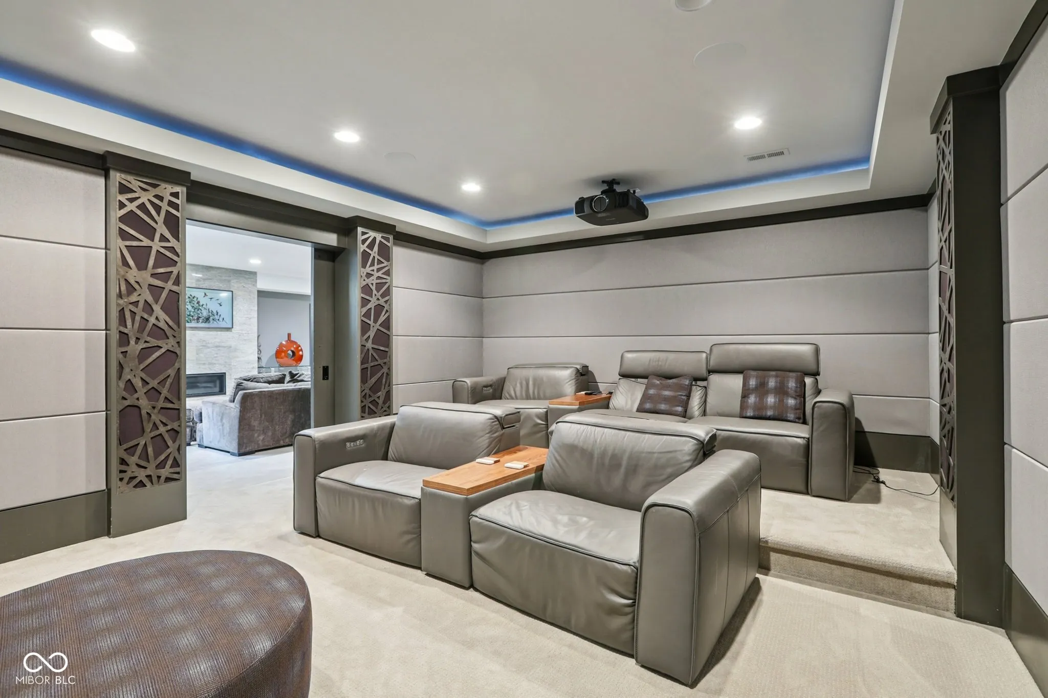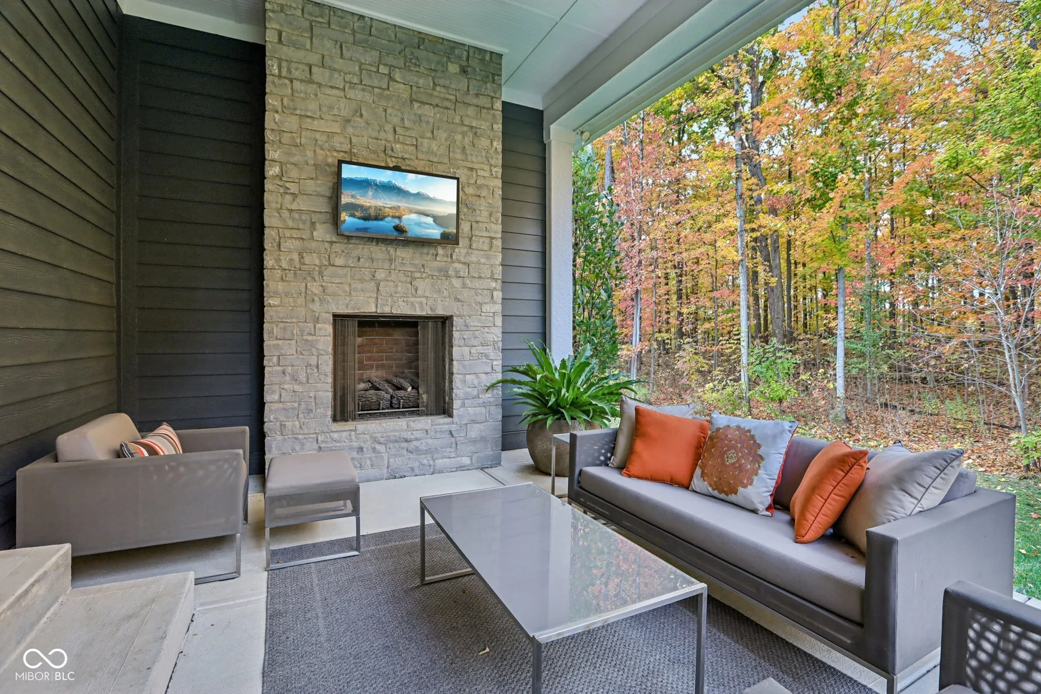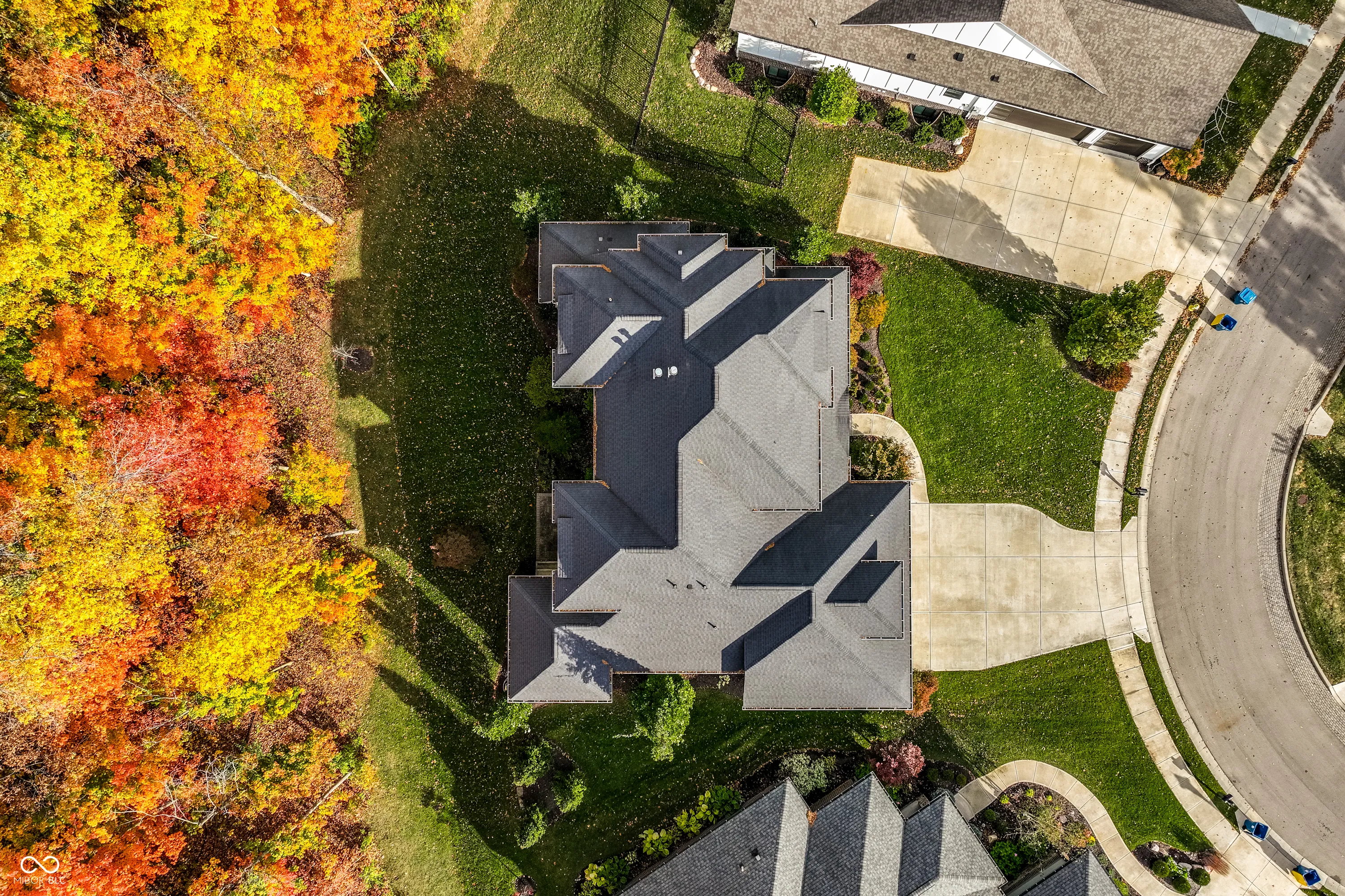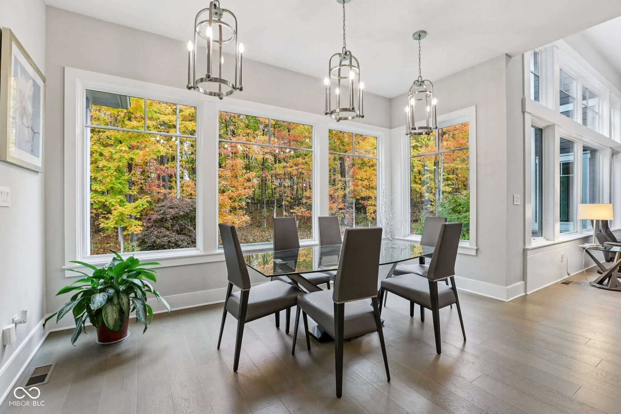 Carmel meets Brown County. Custom built by Old Town Design Group and set against nearly 10 acres of protected forest preserve, this Sunrise on the Monon residence offers something increasingly rare in Carmel: genuine privacy, with easy access to the Monon Trail. The craftsmanship is deliberate throughout: walnut entry door, mahogany transoms, a custom steel and oak staircase, Pella windows. The main-level primary suite is finished with a tray ceiling and spa bath. The kitchen pairs Wolf and Sub-Zero appliances with white acrylic and chocolate bamboo cabinetry. Downstairs, a dedicated theater with a 133″ slate screen and THX-certified Dolby Atmos surround sound. Red cedar garage doors, an EV-ready outlet, Control4 automation, and automated Hunter Douglas shades round out a home that was thought through from the beginning.