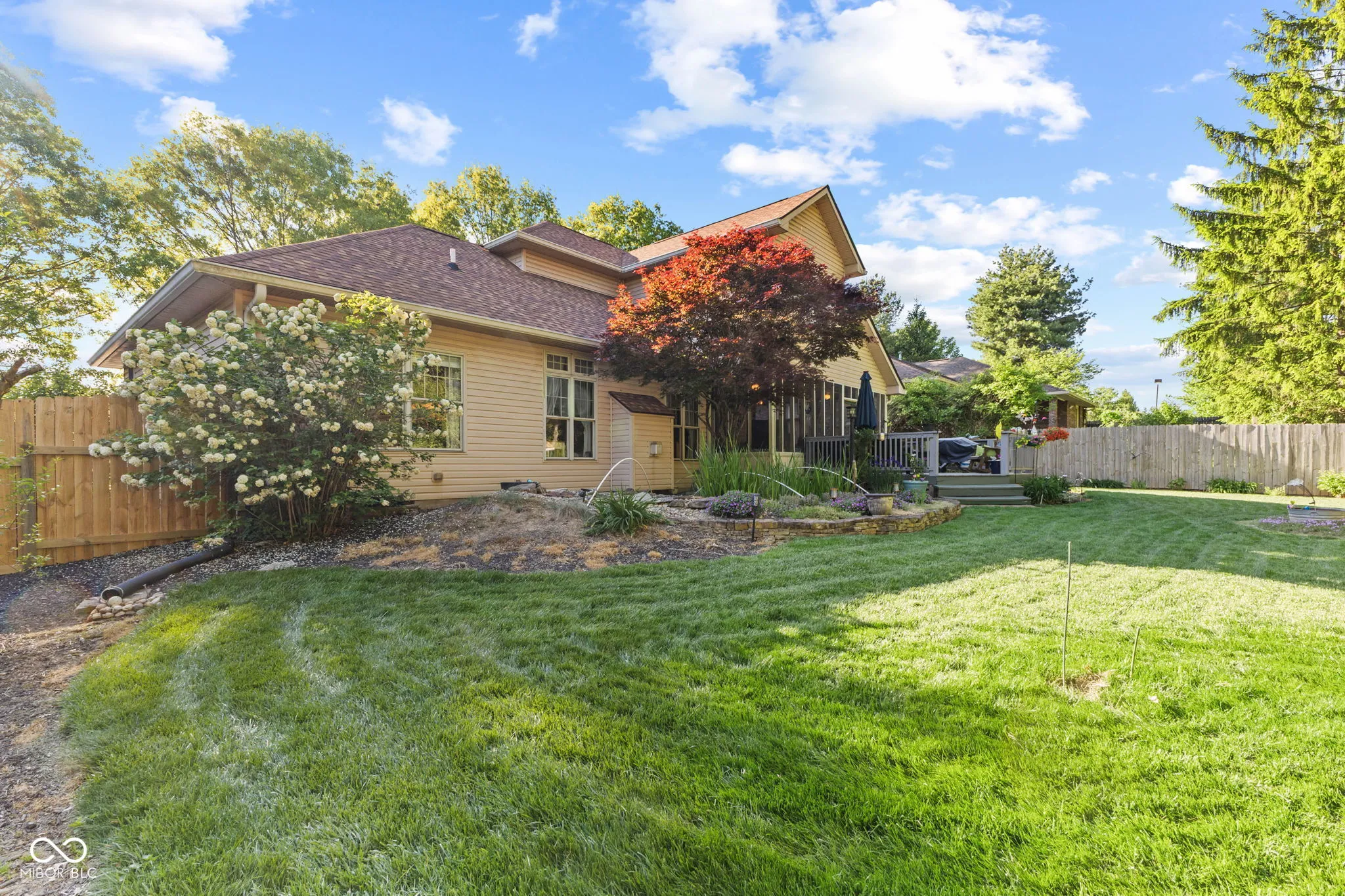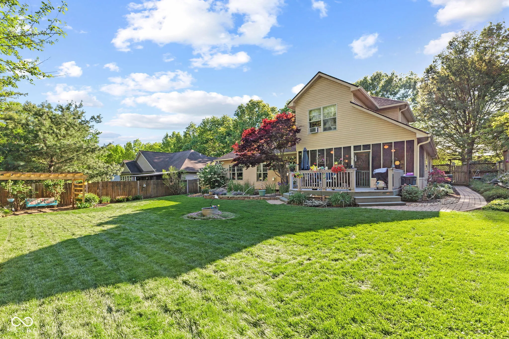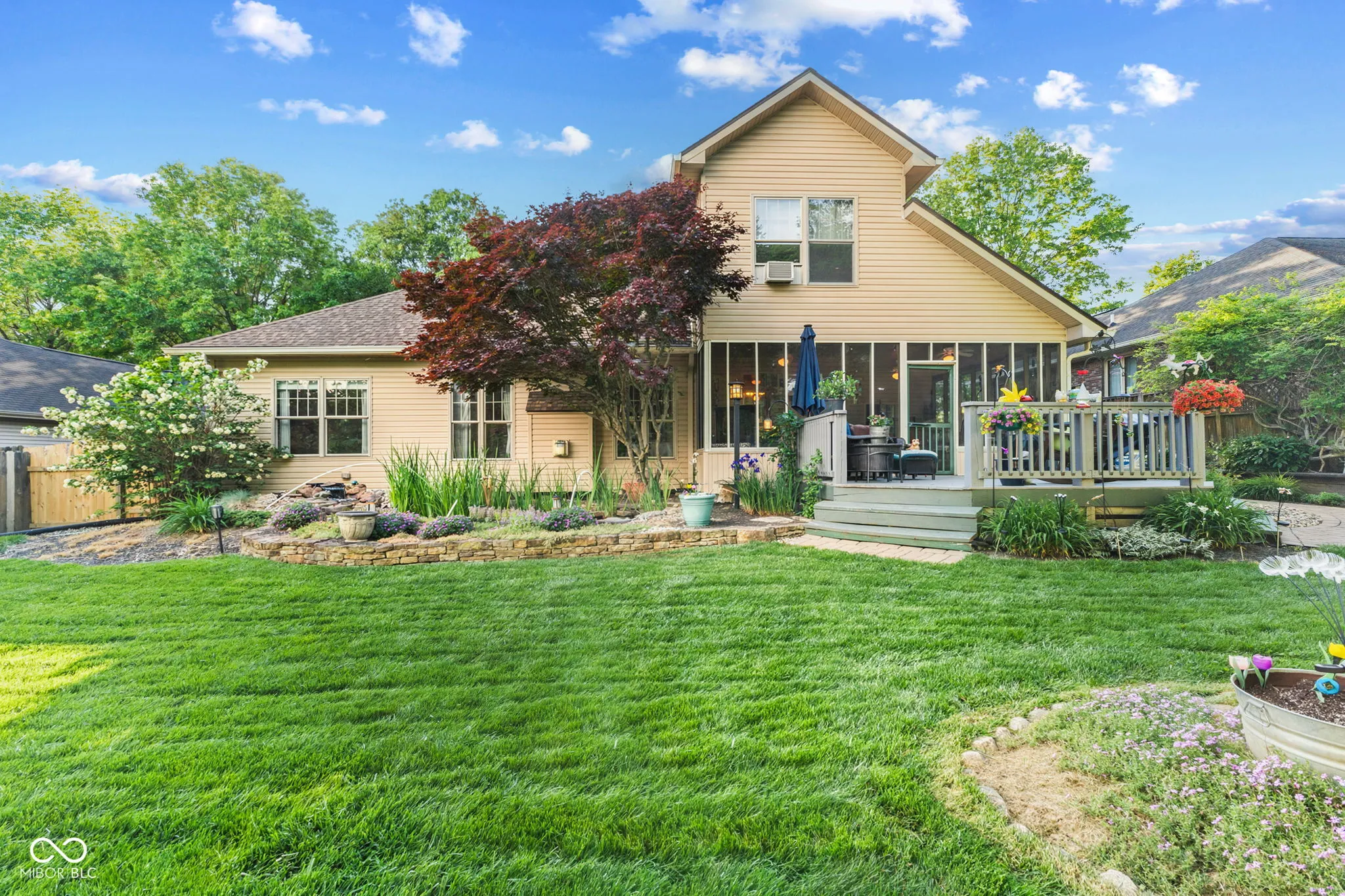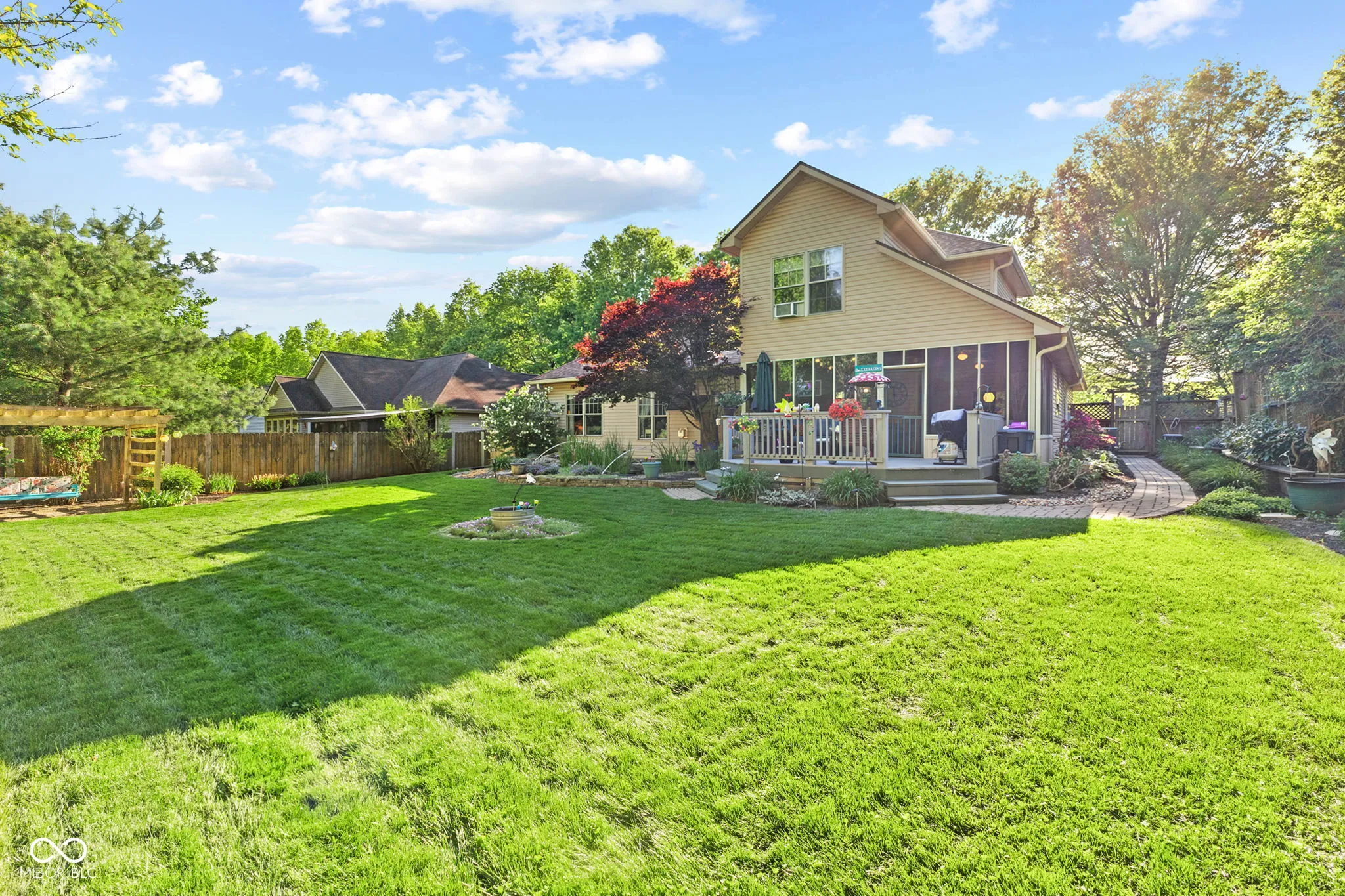 Impeccably maintained and thoughtfully updated, this stunning home reflects nearly 20 years of meticulous care and pride of ownership. The main floor features inviting living and dining spaces, a well-appointed kitchen, laundry, and a versatile flex room ideal for a home office or den. The main floor is also highlighted by a main-level primary suite for ultimate convenience. Upstairs, you’ll find two spacious bedrooms, a full bath, and additional hall space, creating a private and comfortable retreat for family or guests. Recent upgrades include a newer roof with transferable warranty (2023), 3/4″ hardwood floors throughout the main level, new kitchen flooring tile, quartz countertops, wall-mounted microwave/range combination, updated window glass, new HVAC system (2025), and newer water heater (2023) and more-providing both style and peace of mind. Step outside into your own serene, park-like retreat. The backyard offers exceptional privacy, surrounded by mature trees and thoughtfully designed to feel like a true escape. Enjoy the tranquil koi pond, elegant pergola, expansive deck, and custom paver walkway, all complemented by a screened-in 3-season sunroom just off the kitchen and dining area-perfect for effortless indoor-outdoor living. A dedicated storage shed/workshop adds versatility without compromising the beauty of the space. This is a rare opportunity to own a home with quality updates, a versatile layout, and a backyard retreat you’ll love coming home to all while being situated in a highly sought-after neighborhood known for its established charm. Enjoy the convenience of being just minutes from shopping, dining, parks, and Indiana University, while still tucked into a quiet, desirable residential setting.