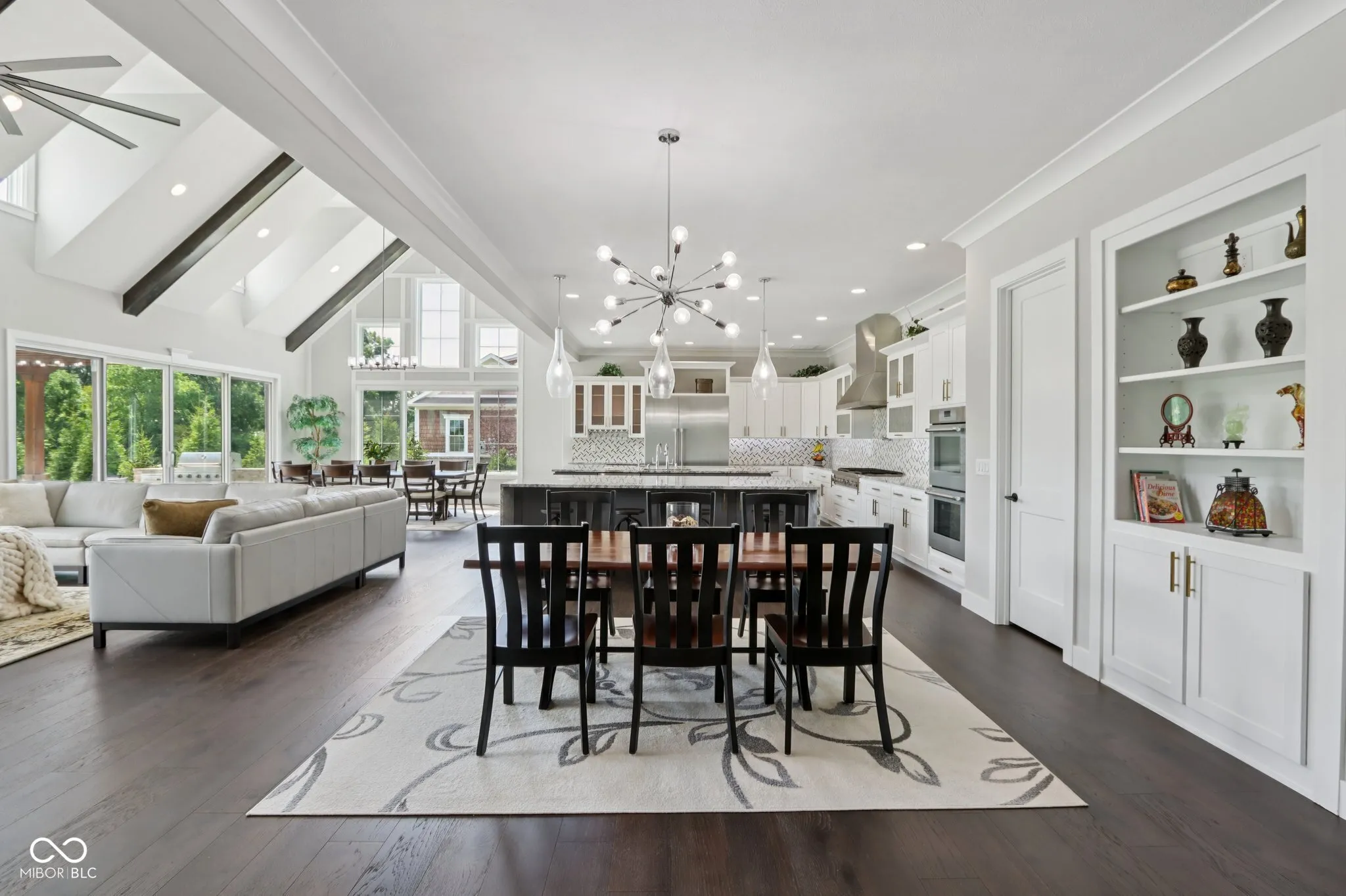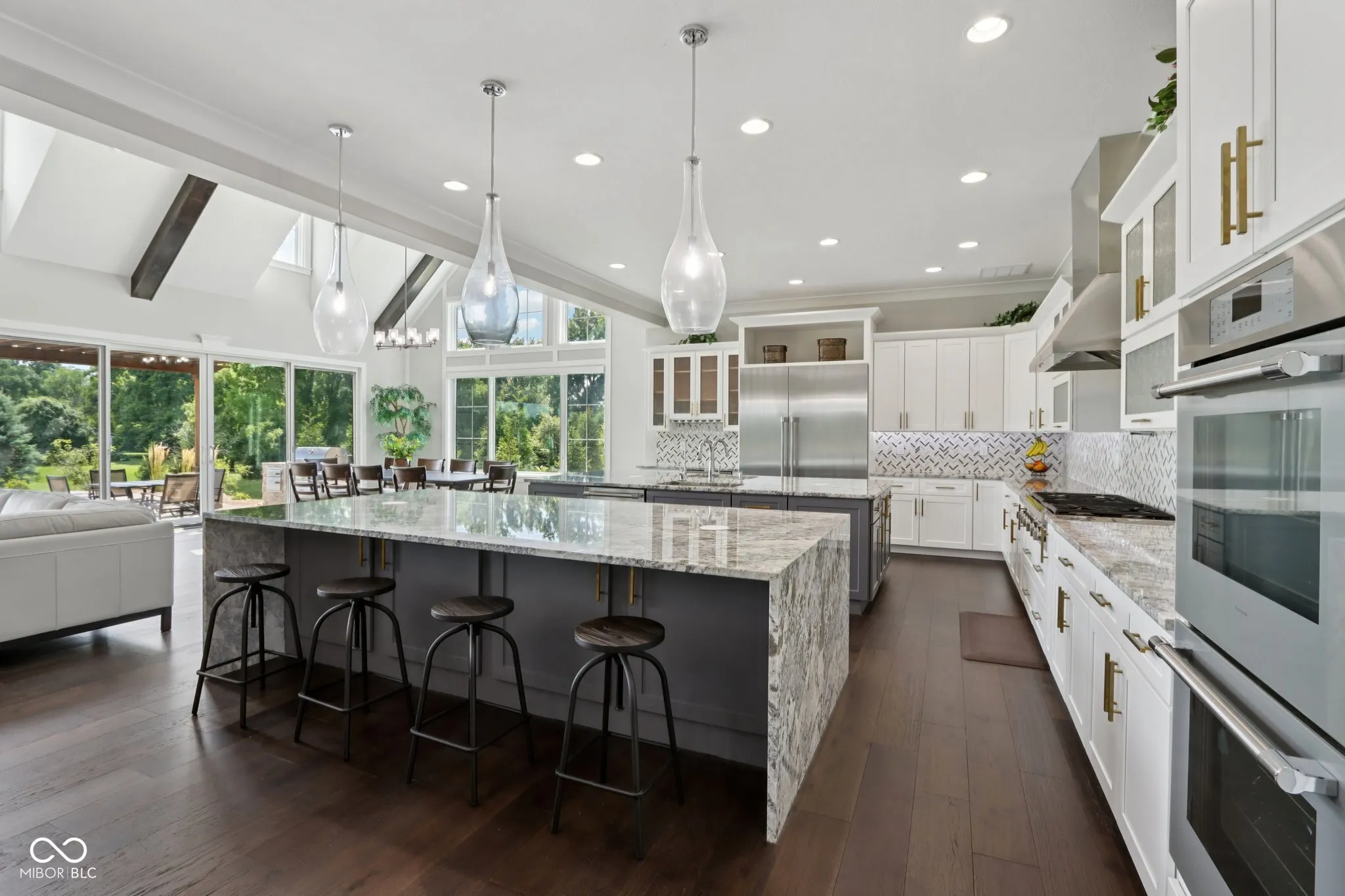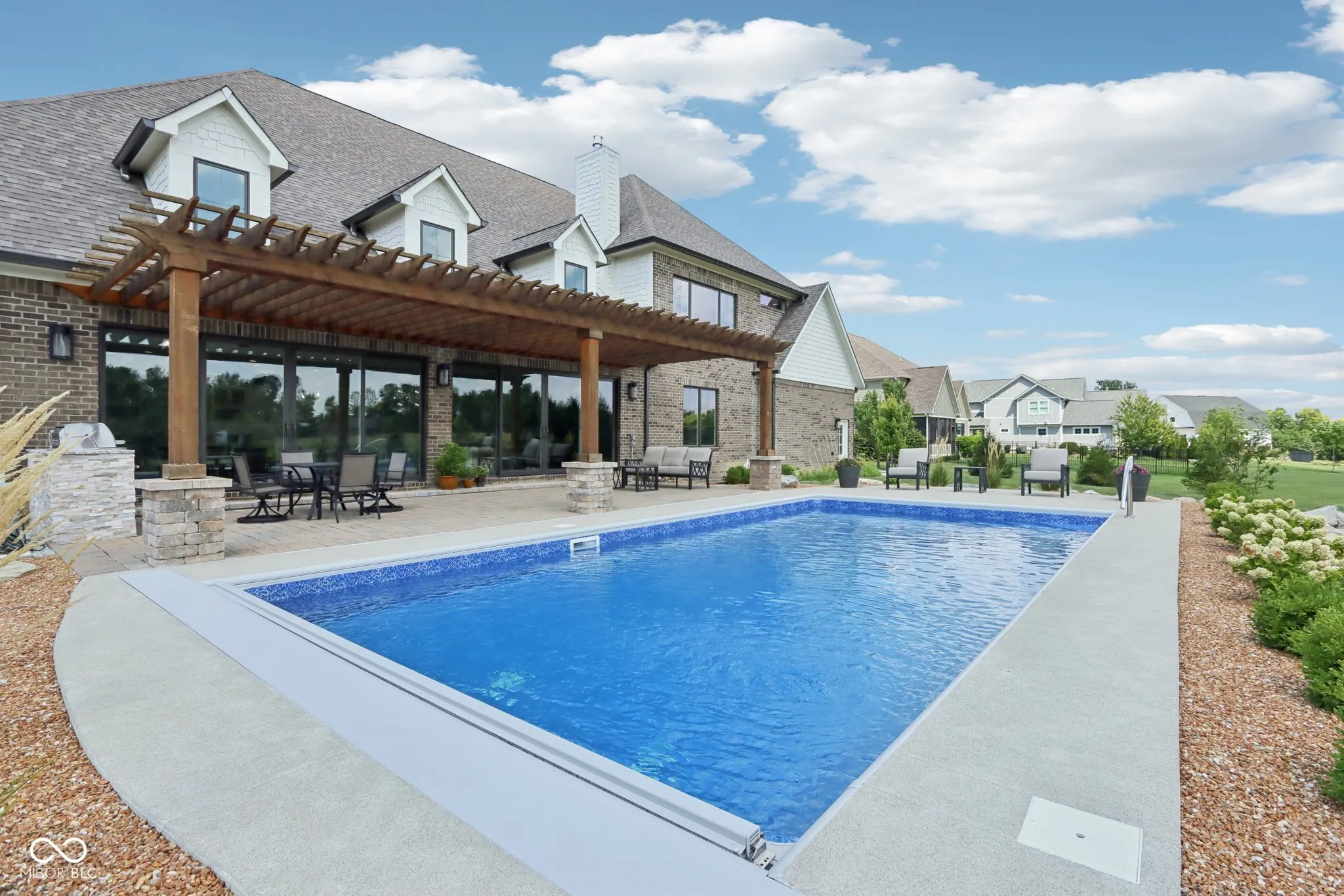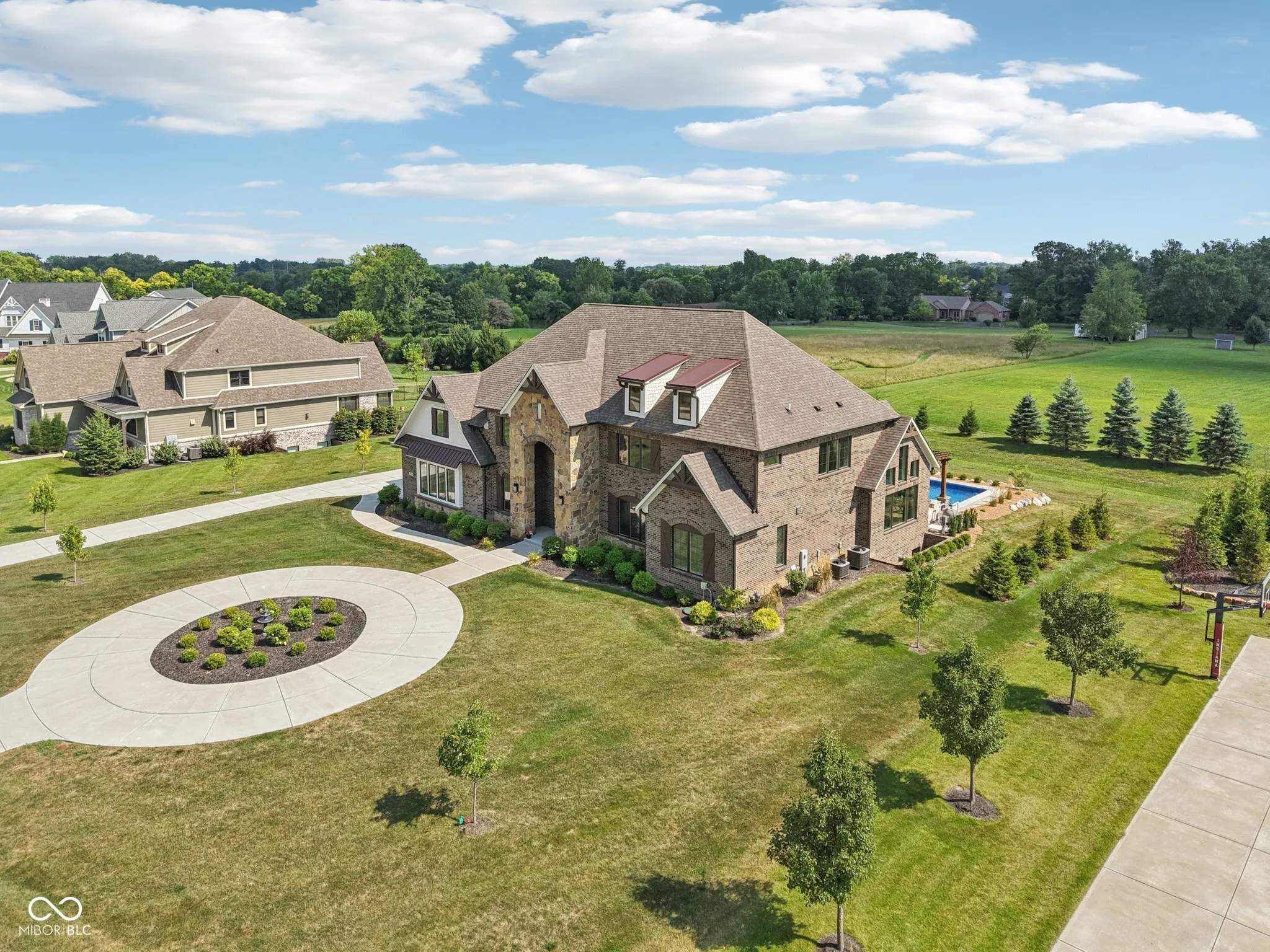A rare offering in coveted Oak Park Estates, this newer custom estate is a statement of refined luxury and effortless living. Set on a nearly 1-acre lot backing to a tree line with open field beyond, the home offers exceptional privacy and a peaceful setting. A sparkling pool anchors the outdoor experience, complemented by expansive entertaining spaces and a 5-car garage. The interior features 5 bedrooms, 5.5 baths, open concept living, and an elevator providing easy access to all levels and the garage. The main level showcases seamless flow between the gourmet kitchen, great room, and dining areas. The chef’s kitchen is a showstopper, boasting dual oversized islands (including a waterfall island), two full-size sinks, pot filler, professional-grade appliances including two dishwashers, 60″ built-in refrigerator, 48″ pro rangetop, double ovens, warming drawer, microwave drawer, wine chiller, and a spacious walk-in pantry. A dramatic 2-story great room and 2-story dining area, united beneath an elegant beamed ceiling, are flooded with natural light from a multi-panel sliding glass wall that frames views of the pool. A stunning two-sided floor-to-ceiling fireplace connects the great room to a private office with custom built-ins. The main floor also offers a private guest suite with its own bath. Upstairs, the primary suite impresses with a spa-style tiled shower featuring rain shower heads and a walk-in tub, along with a massive walk-in closet with center island. Two additional bedrooms each include ensuite baths with dual vanities and walk-in closets. The 10′ lower level is an entertainer’s haven with a wet bar, home theater, wine cellar, exercise room, recreation space with fireplace, a 5th bedroom, and a full bath. The private backyard is a true extension of the home, complete with a pool, expansive custom paver patio, built-in grilling station, and pergola. An exceptional blend of modern convenience and first-class amenities – luxury living without compromise.
