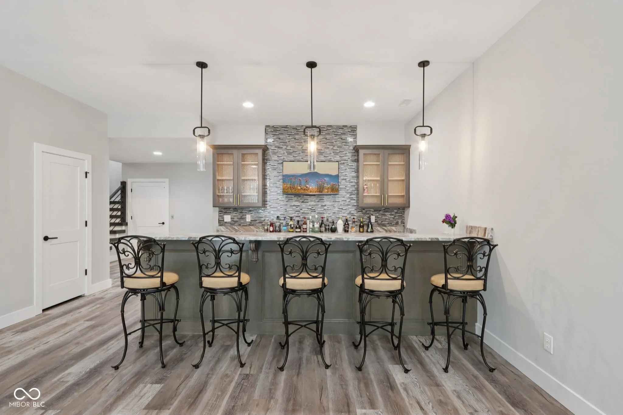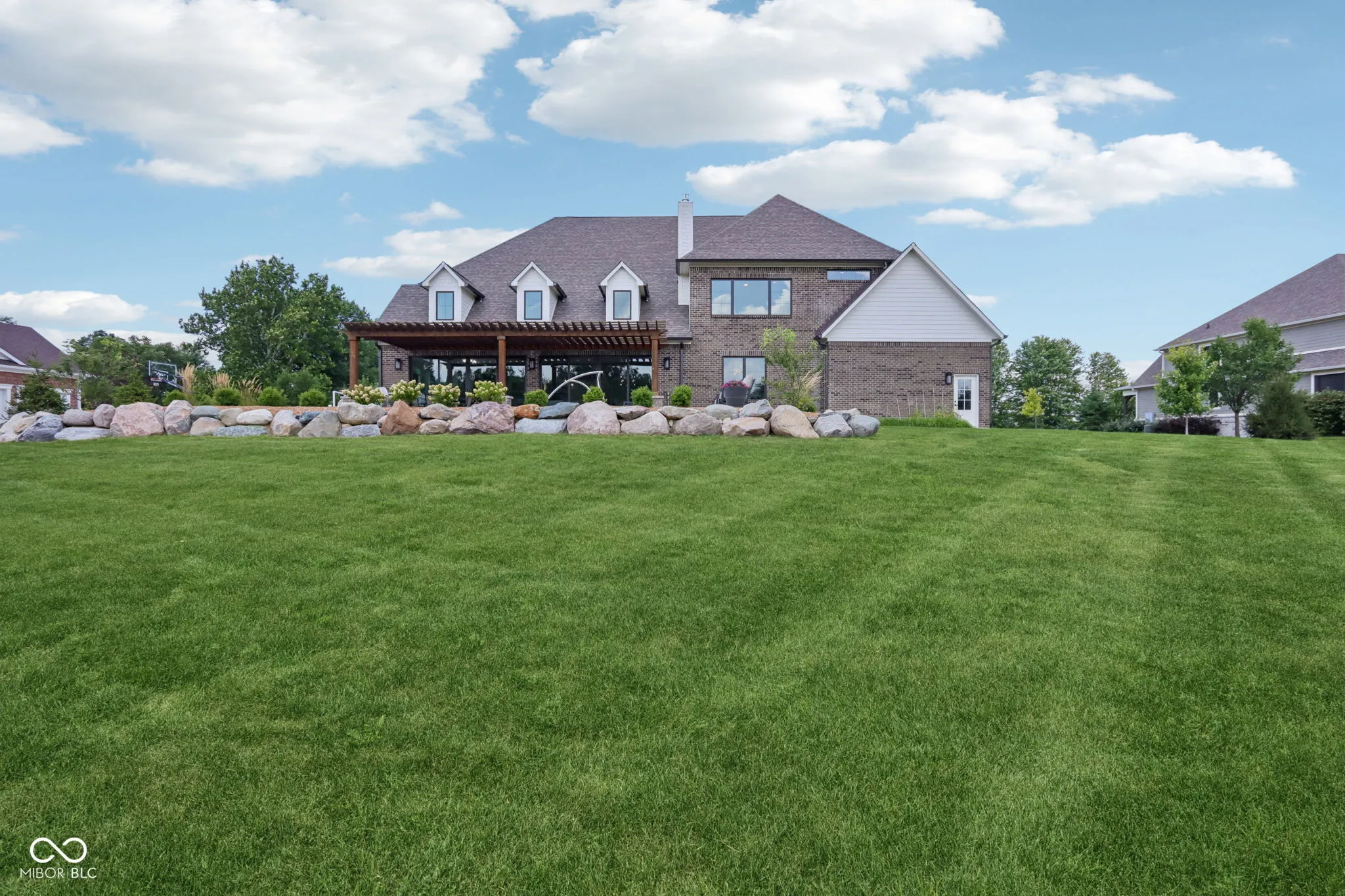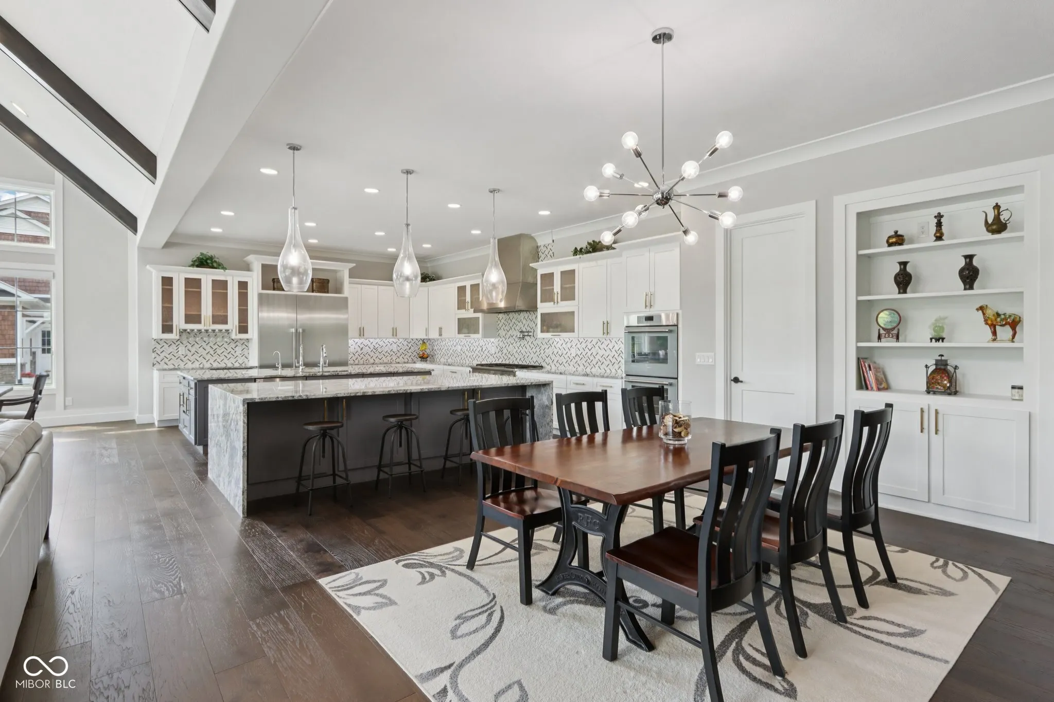 A rare offering in coveted Oak Park Estates, this newer custom estate is a statement of refined luxury and effortless living. Set on a nearly 1-acre lot backing to a tree line with open field beyond, the home offers exceptional privacy and a peaceful setting. A sparkling pool anchors the outdoor experience, complemented by expansive entertaining spaces and a 5-car garage. The interior features 5 bedrooms, 5.5 baths, open concept living, and an elevator providing easy access to all levels and the garage. The main level showcases seamless flow between the gourmet kitchen, great room, and dining areas. The chef’s kitchen is a showstopper, boasting dual oversized islands (including a waterfall island), two full-size sinks, pot filler, professional-grade appliances including two dishwashers, 60″ built-in refrigerator, 48″ pro rangetop, double ovens, warming drawer, microwave drawer, wine chiller, and a spacious walk-in pantry. A dramatic 2-story great room and 2-story dining area, united beneath an elegant beamed ceiling, are flooded with natural light from a multi-panel sliding glass wall that frames views of the pool. A stunning two-sided floor-to-ceiling fireplace connects the great room to a private office with custom built-ins. The main floor also offers a private guest suite with its own bath. Upstairs, the primary suite impresses with a spa-style tiled shower featuring rain shower heads and a walk-in tub, along with a massive walk-in closet with center island. Two additional bedrooms each include ensuite baths with dual vanities and walk-in closets. The 10′ lower level is an entertainer’s haven with a wet bar, home theater, wine cellar, exercise room, recreation space with fireplace, a 5th bedroom, and a full bath. The private backyard is a true extension of the home, complete with a pool, expansive custom paver patio, built-in grilling station, and pergola. An exceptional blend of modern convenience and first-class amenities – luxury living without compromise.
